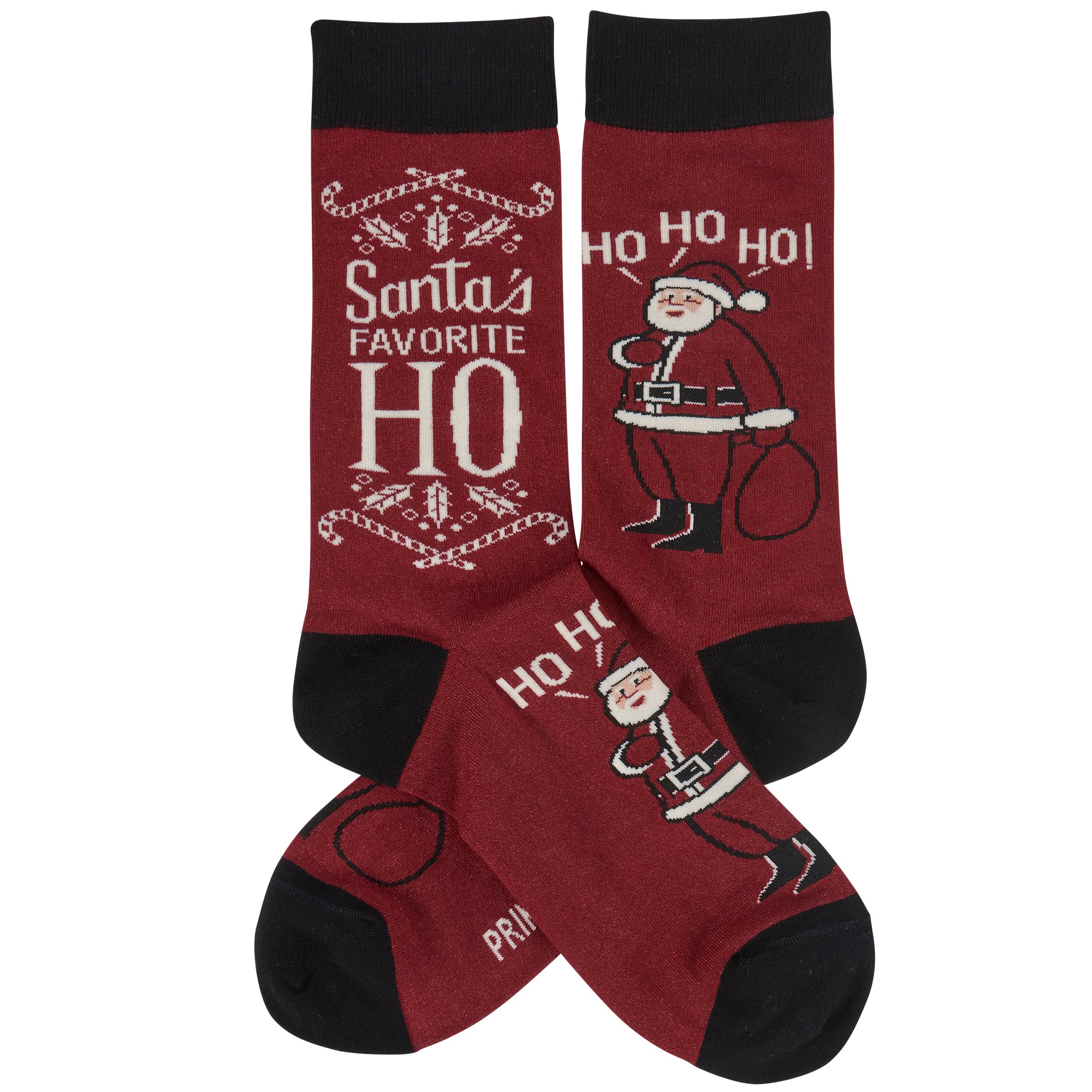 A pair of colorful socks from our Christmas Collection displaying unique hand illustrated designs of Santa saying "Ho Ho Ho" with a fun seasonal sentiment that reads "Santa's Favorite Ho." Seasonal socks feature a one size fits most design made with cotton, nylon, and spandex. Our red Santa's Favorite socks come with a header card and a clear plastic hanger for display. A fun Christmas-themed gift perfect for seasonal self-expression.