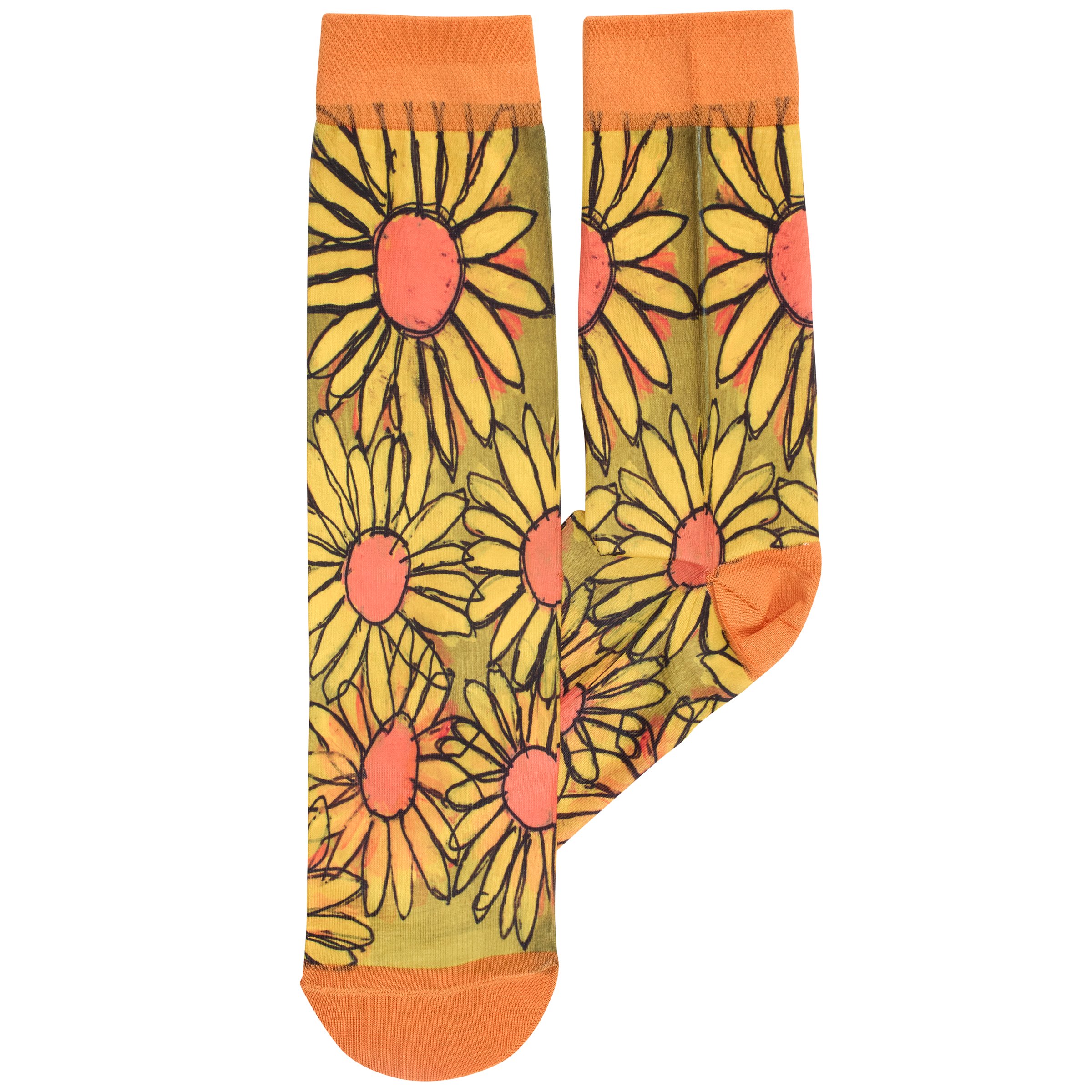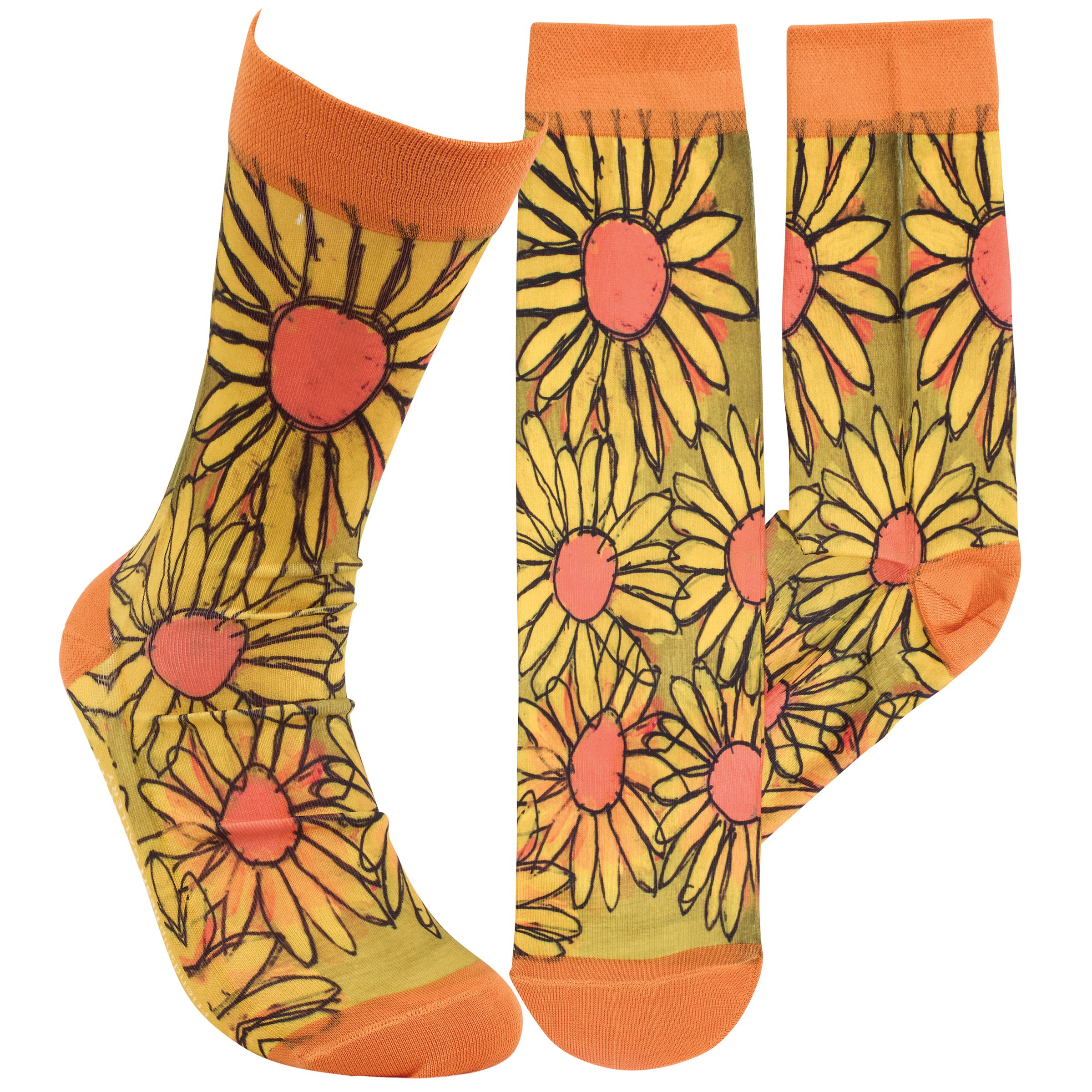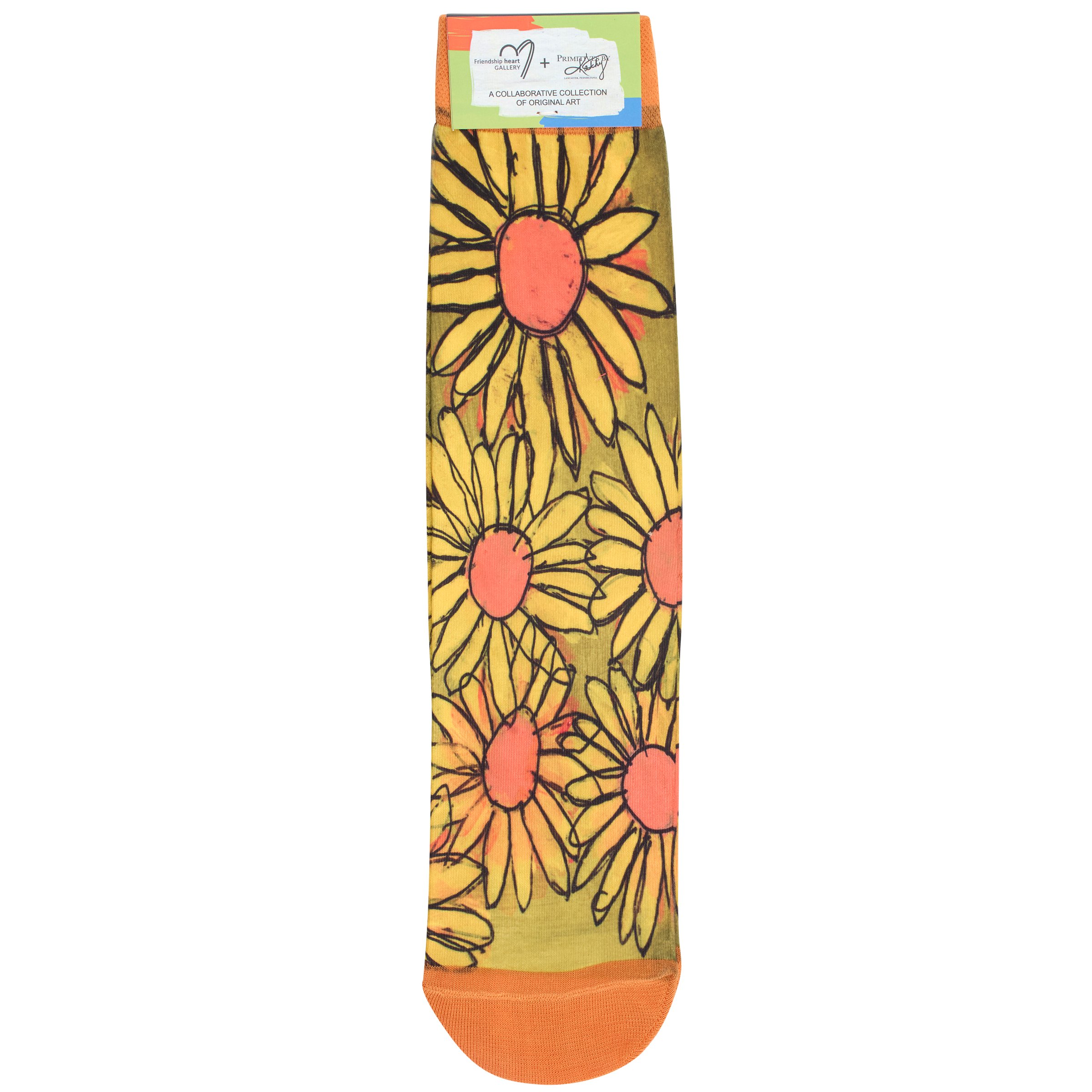 A pair of colorful socks from our Friendship Heart Gallery Collection featuring an all-over design displaying original art of sunflowers created at the Friendship Heart Gallery in Lancaster, PA which supports artists with intellectual disabilities and autism. Artist socks also feature orange color accents on the cuff, heel, and toe. These giftable socks are made with a spandex blend for a one size fits most design. Our Sunflowers socks come with a decorative header card and a clear plastic hanger for easy rack display and gifting. A thoughtful gift that supports artists in local communities. Perfect for mismatching with other colorful socks to wear during Rock Your Socks events. On March 21st people all around the world come together every year and celebrate World Down Syndrome Day by wearing brightly colored, mismatched socks to represent the unique talents and abilities of people with Down syndrome.