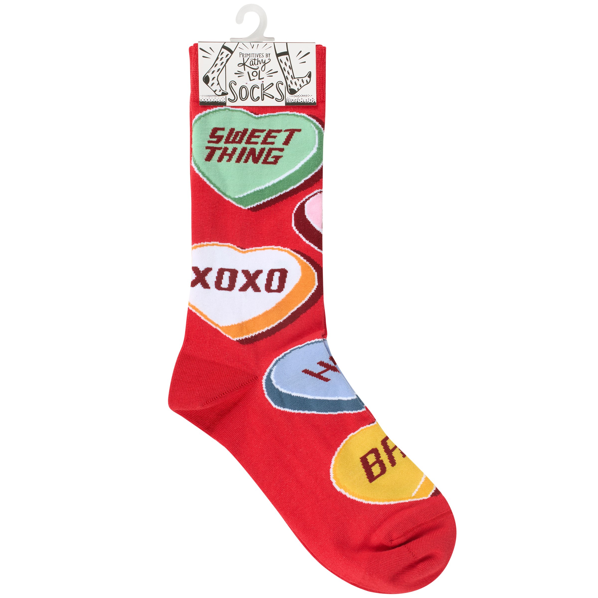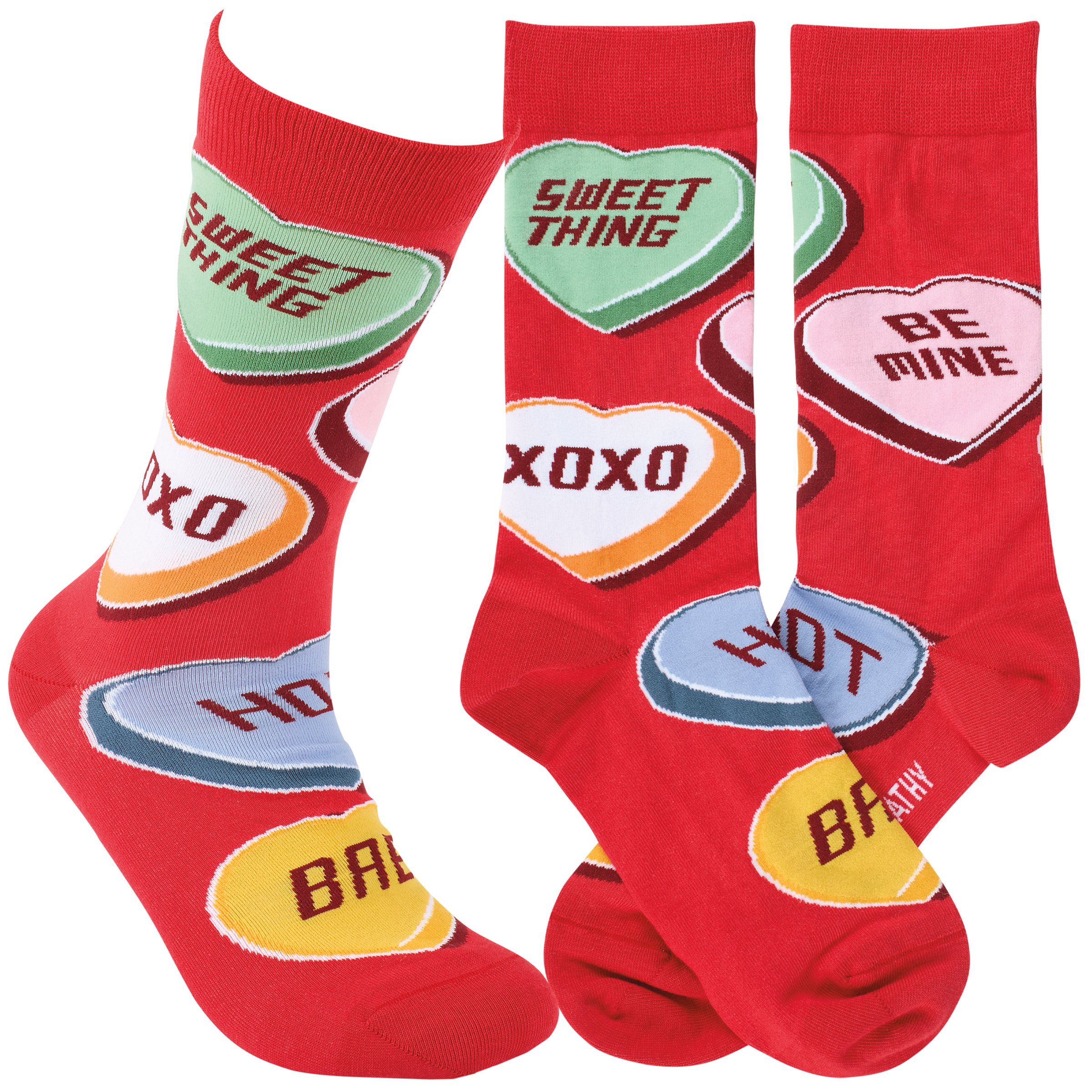 A pair of colorful socks from our Valentine's Day Collection displaying playful hand illustrated designs of candy hearts with fun seasonal sentiments that read "Sweet Thing - Be Mine - XOXO - Hot - Babe." These giftable socks are made with a cotton, nylon, and spandex blend for a one size fits most design. Our Sweet Thing socks come with a decorative header card and a clear plastic hanger for easy rack display and gifting. A fun Valentine's Day gift perfect for seasonal self-expression.