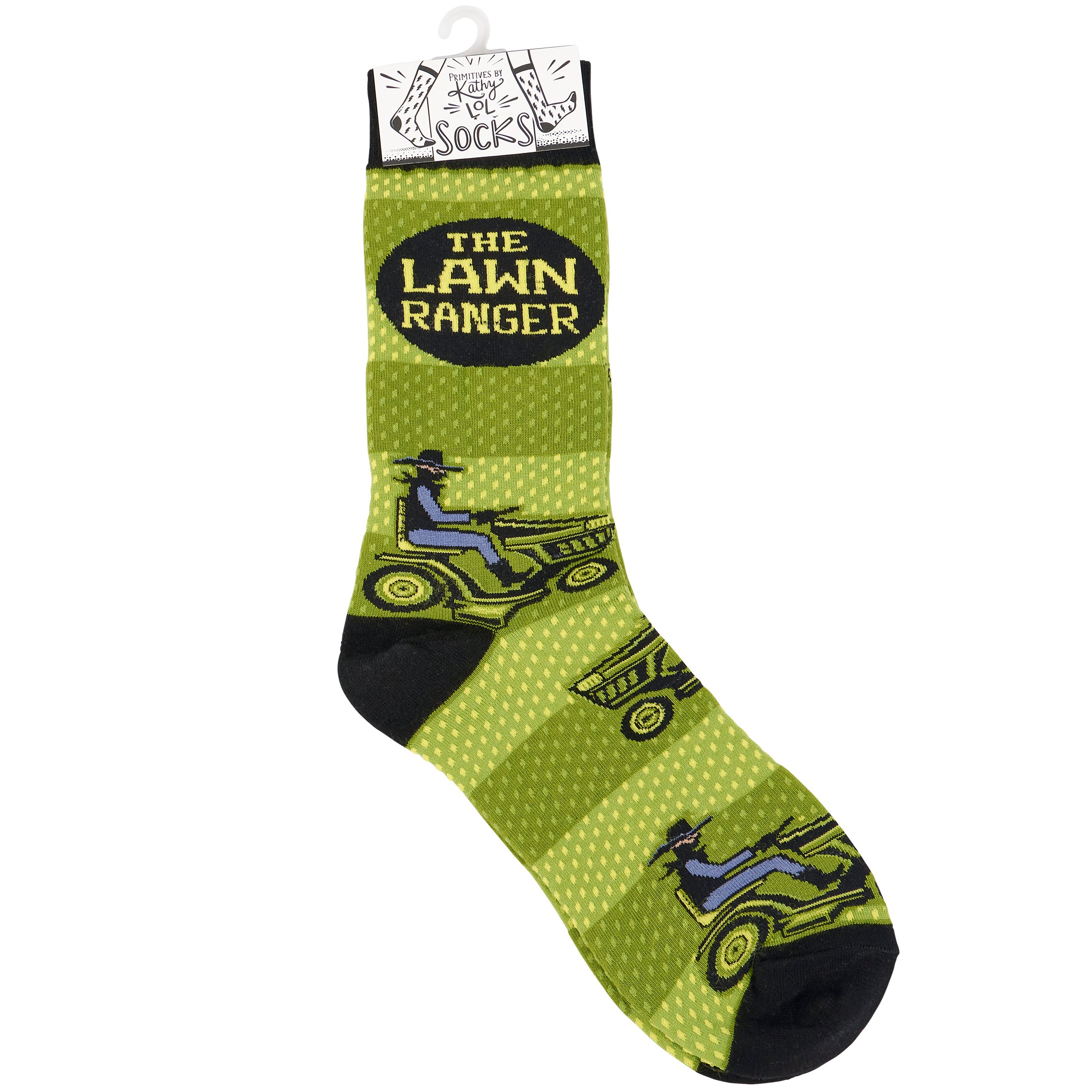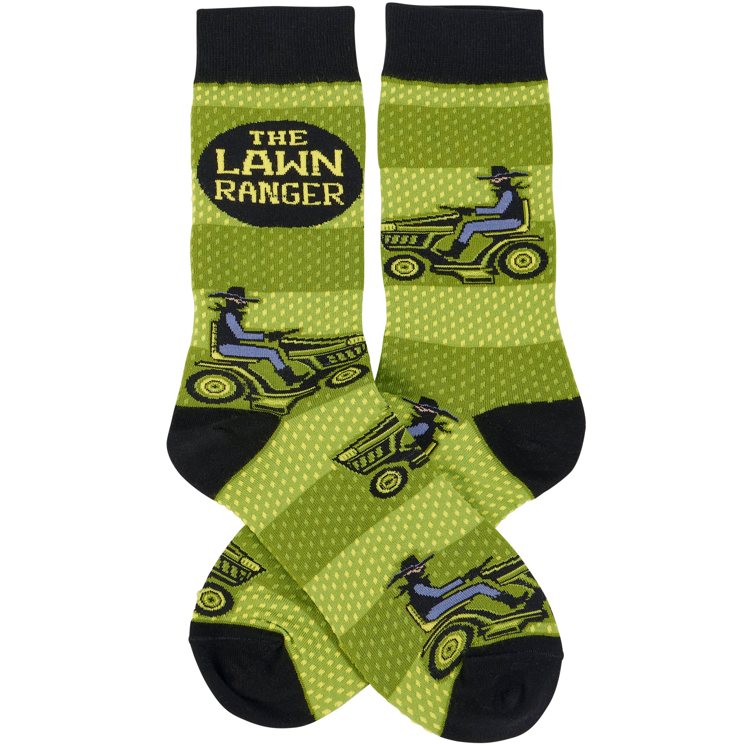 A pair of colorful socks from our Father's Day Collection displaying playful hand illustrated designs of people dressed like a Texas ranger riding lawn mowers with a fun dad themed sentiment that reads "The Lawn Ranger." These giftable socks are made with a cotton, nylon, and spandex blend for a one size fits most design. Our The Lawn Ranger socks come with a decorative header card and a clear plastic hanger for easy rack display and gifting. A fun father's day gift perfect for everyday self-expression.