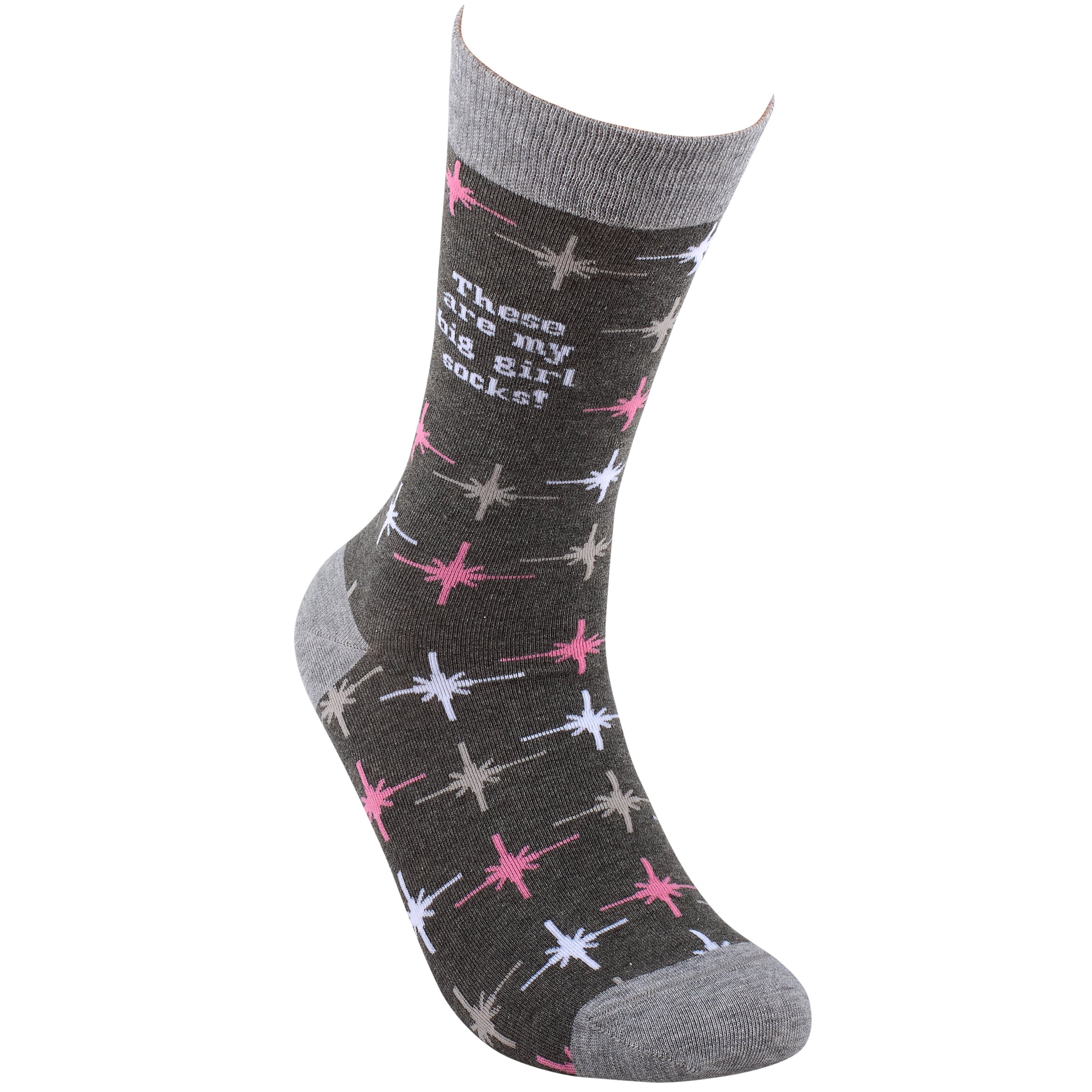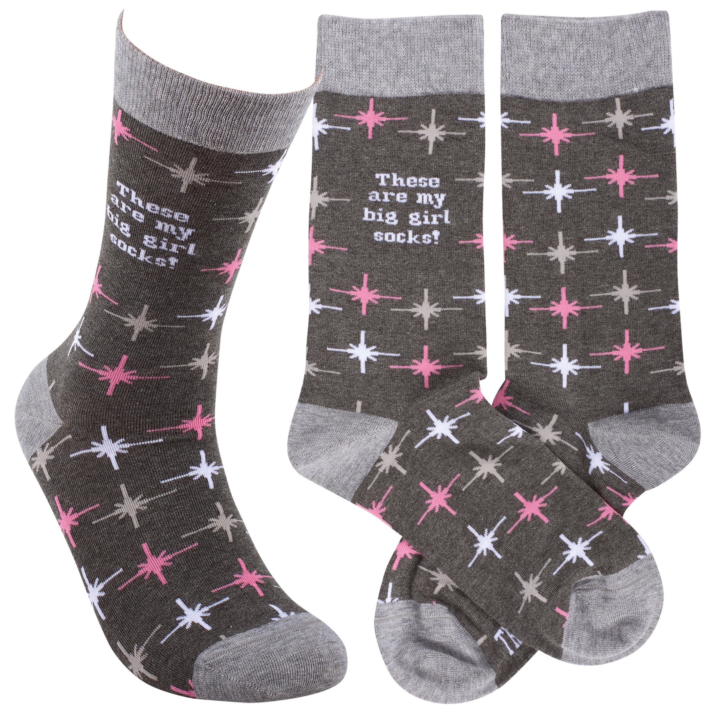 A pair of retro socks from our Trash Talk By Annie Collection flaunting a classy pink and gray pattern with a sassy sentiment that reads "These Are My Big Girl Socks!" These cozy socks are made with cotton, nylon, and spandex to create a one-size-fits-most design. Each pair of socks is packaged on a clear plastic hanger with header card for graceful display in store. Our These Are My Big Girl socks call back to a vintage style with modern sassy sentiments, perfect for making a statement while getting a giggle out of others. Colorful and cozy socks always make a great gift for everyday self-expression.
