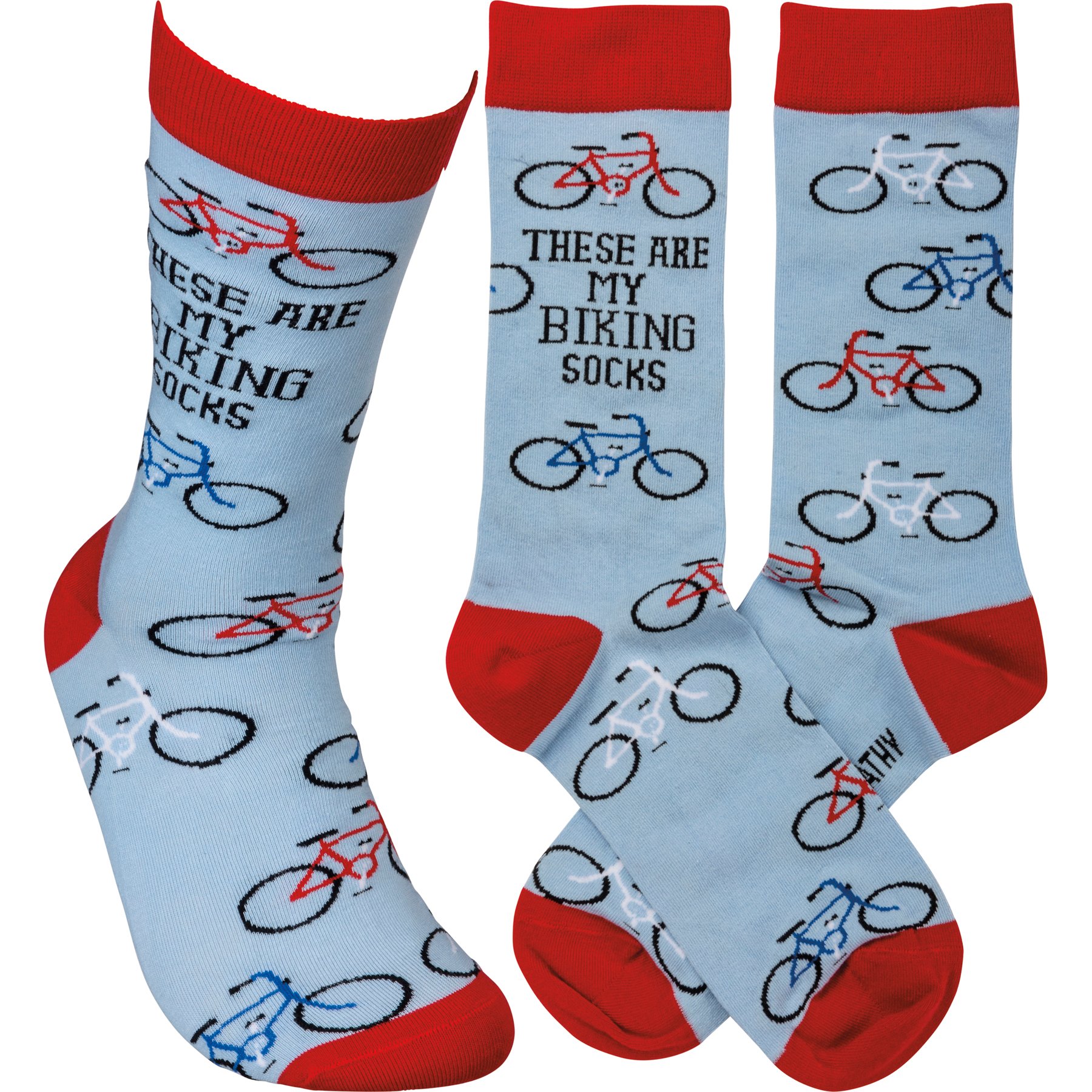 These colorful socks from our LOL Made You Smile Collection feature woven designs with coordinating "These Are My Biking Socks" sentiment. Cotton, nylon, spandex. These funny biking socks are one size fits most.