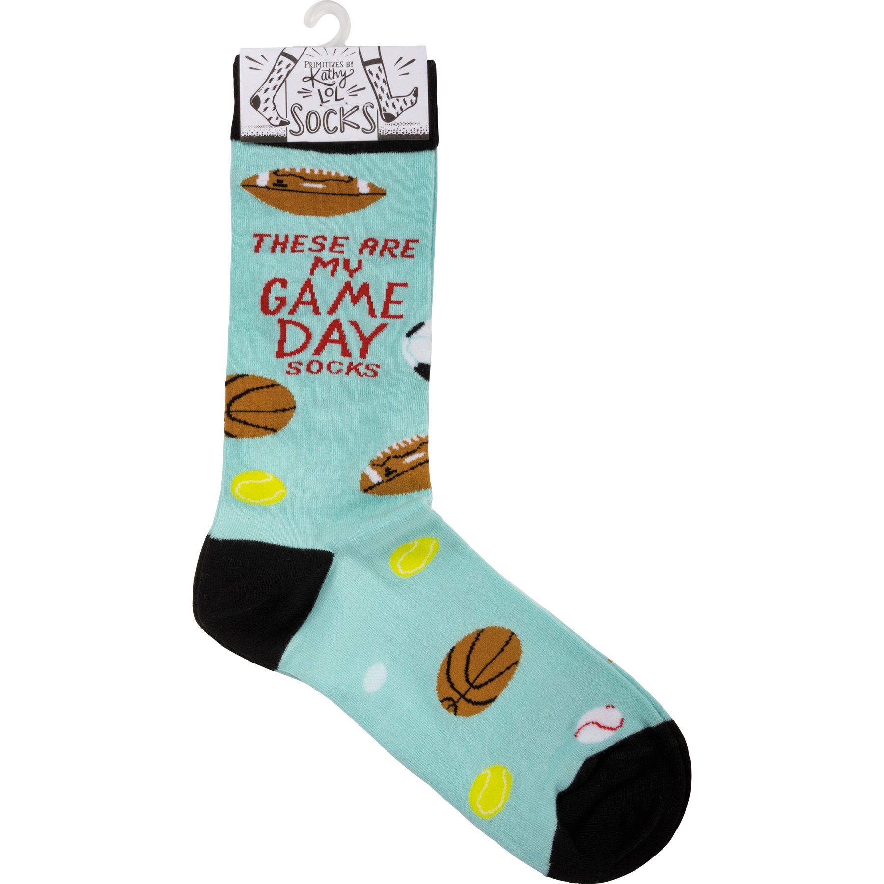 These colorful socks from our LOL Made You Smile Collection feature woven designs with coordinating "These Are My Game Day Socks" sentiment. Cotton, nylon, spandex. These funny game day socks are one size fits most.
