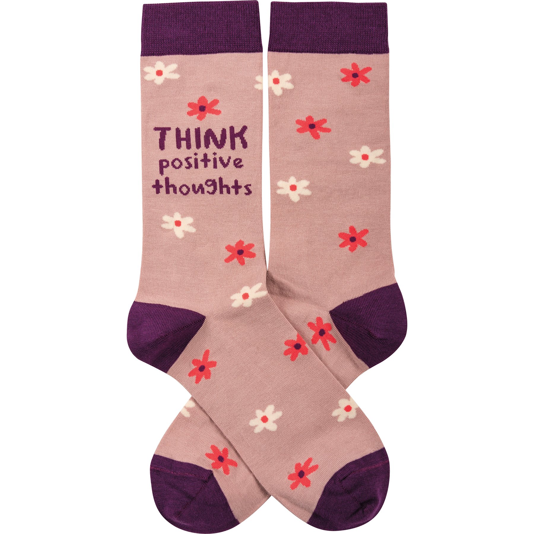 These colorful socks feature woven floral designs with coordinating "Think Positive Thoughts" sentiment. Cotton, nylon, spandex. One size fits most.
