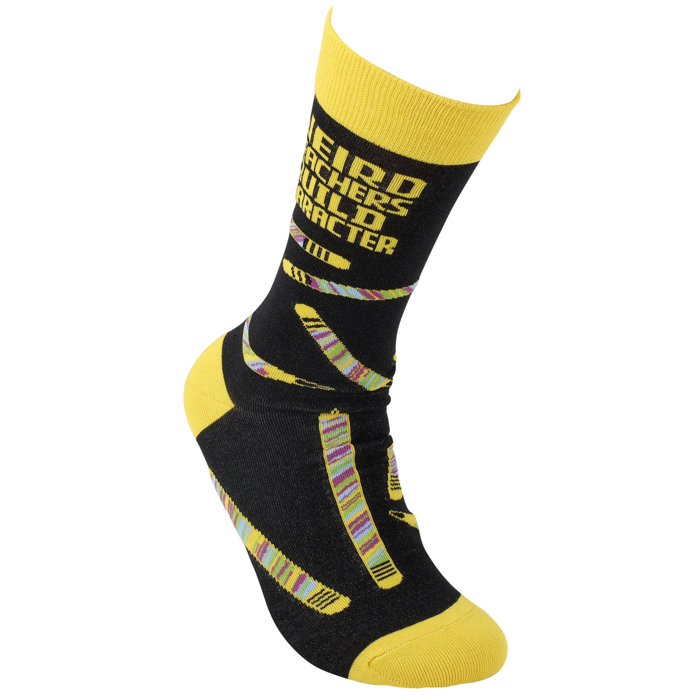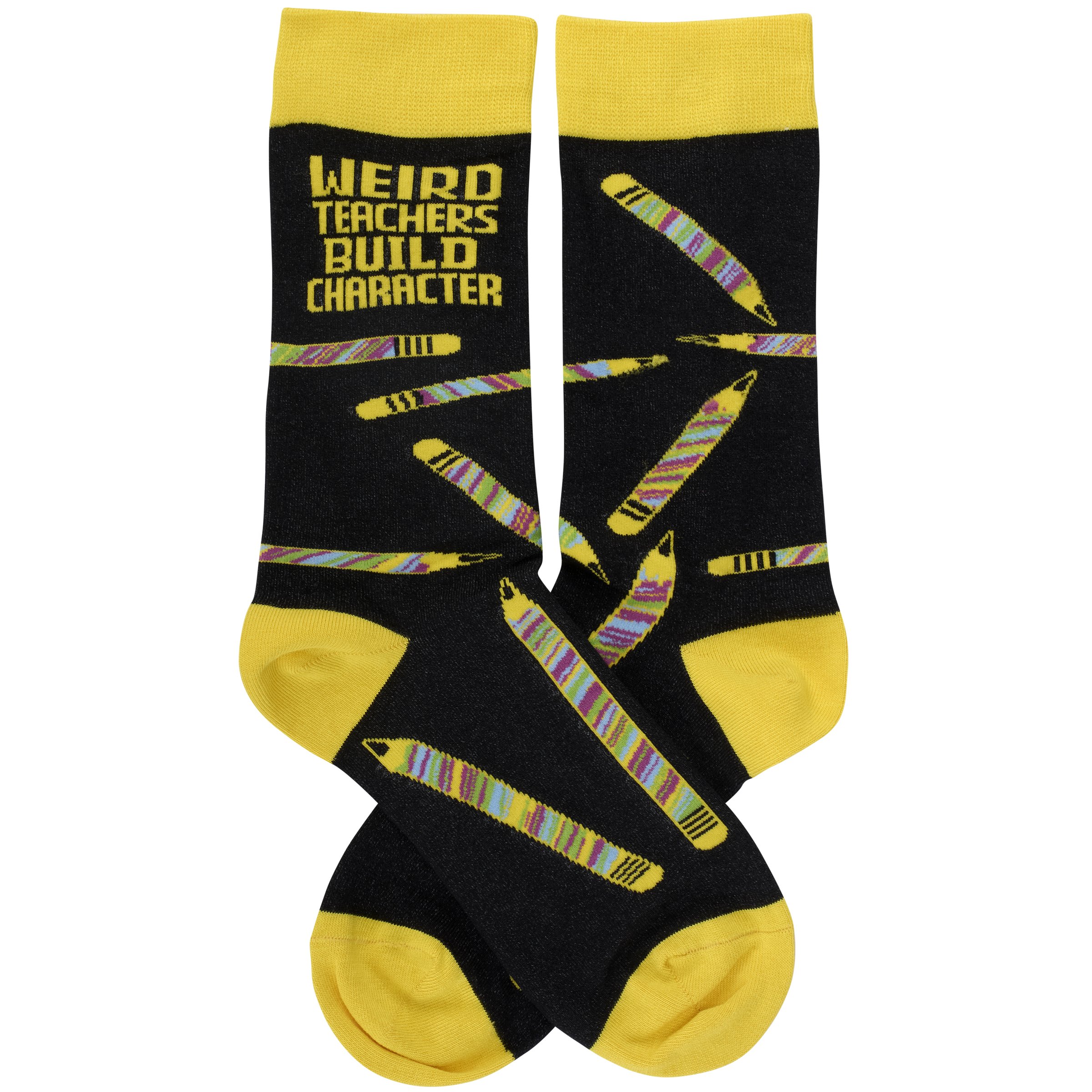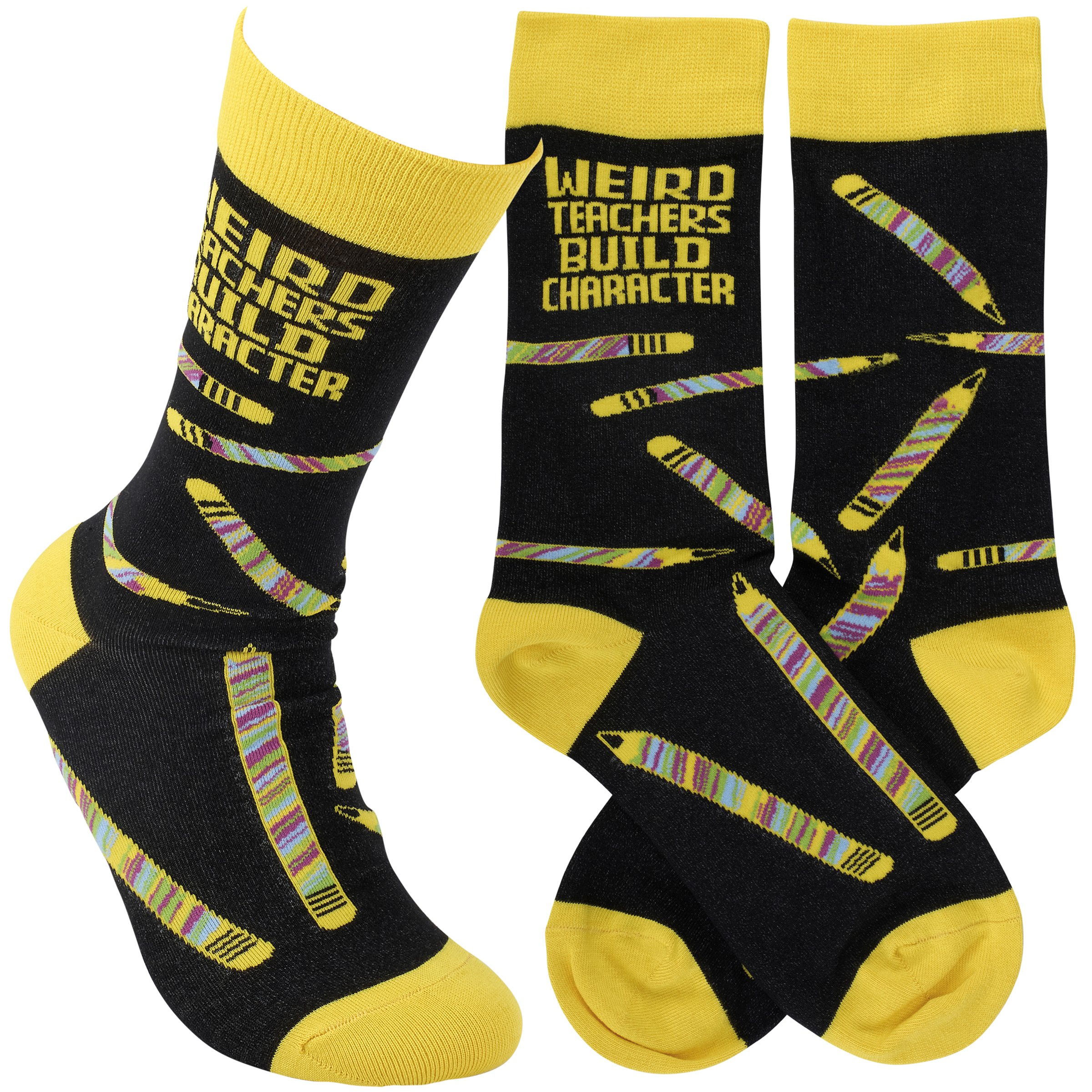 A pair of colorful socks from our Teacher Gift Collection displaying playful hand illustrated designs of striped pencils with a fun teacher inspired sentiment that reads "Weird Teachers Build Character." These giftable socks are made with a cotton, nylon, and spandex blend for a one size fits most design. Our Weird Teachers Build Character socks come with a decorative header card and a clear plastic hanger for easy rack display and gifting. A fun gift for teachers perfect for everyday self-expression.
