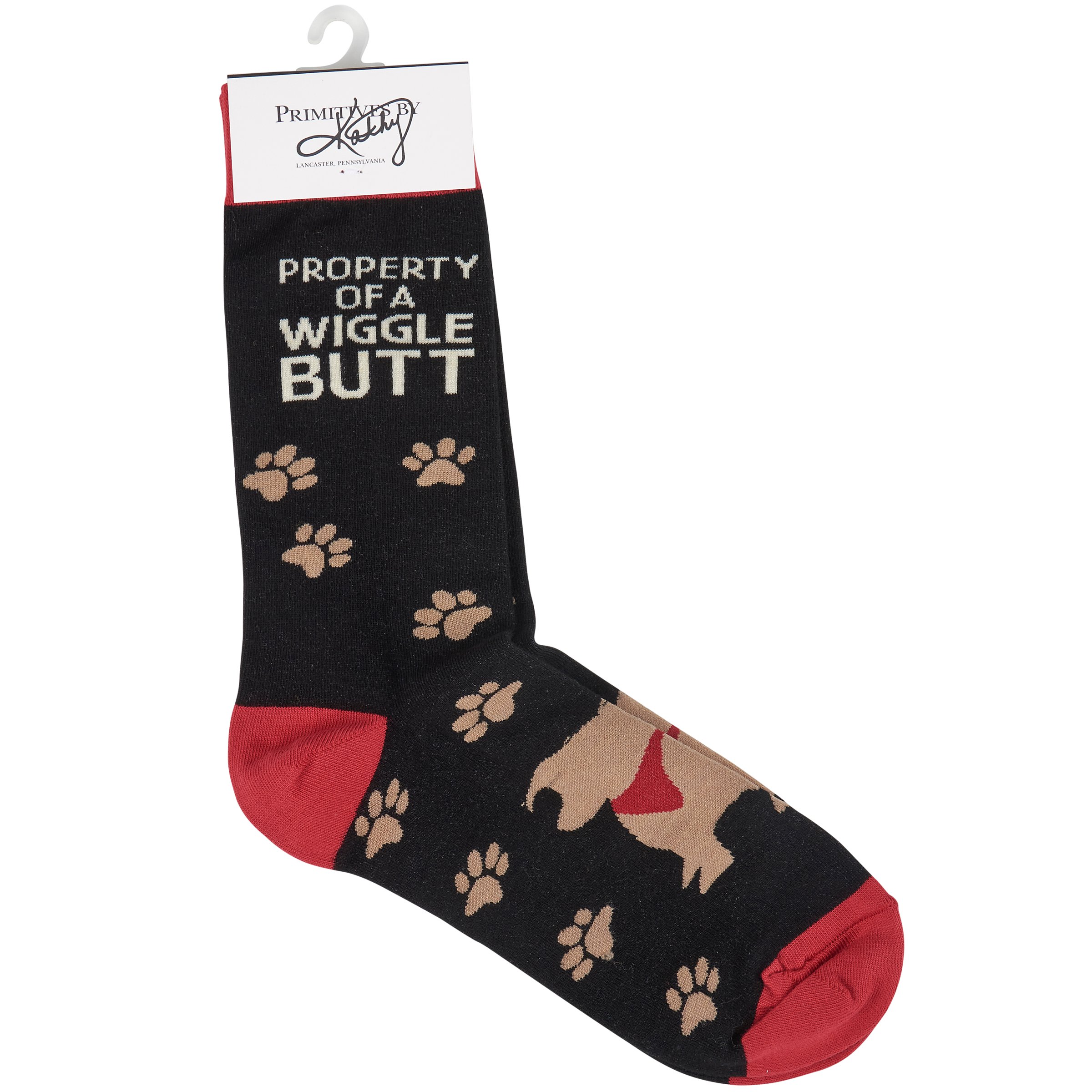 A pair of colorful woven socks from our Pet Collection displaying a dog and paw print pattern with a fun pet-themed sentiment that reads "Property Of A Wigglebutt." Socks feature a one size fits most design made with cotton, nylon, and spandex. Our Wigglebutt socks come with a header card and a clear plastic hanger for display. A fun pet-themed gift perfect for everyday self-expression.