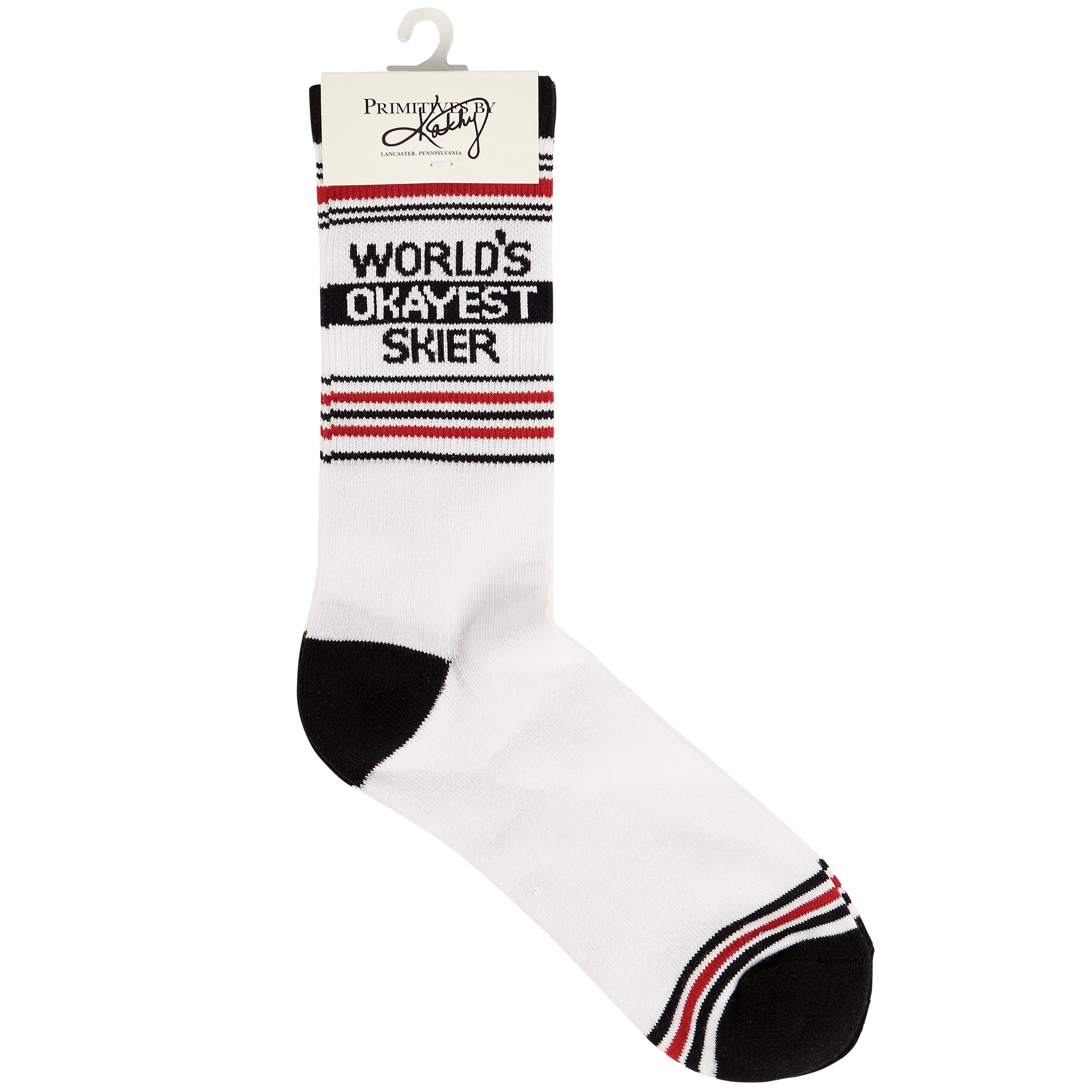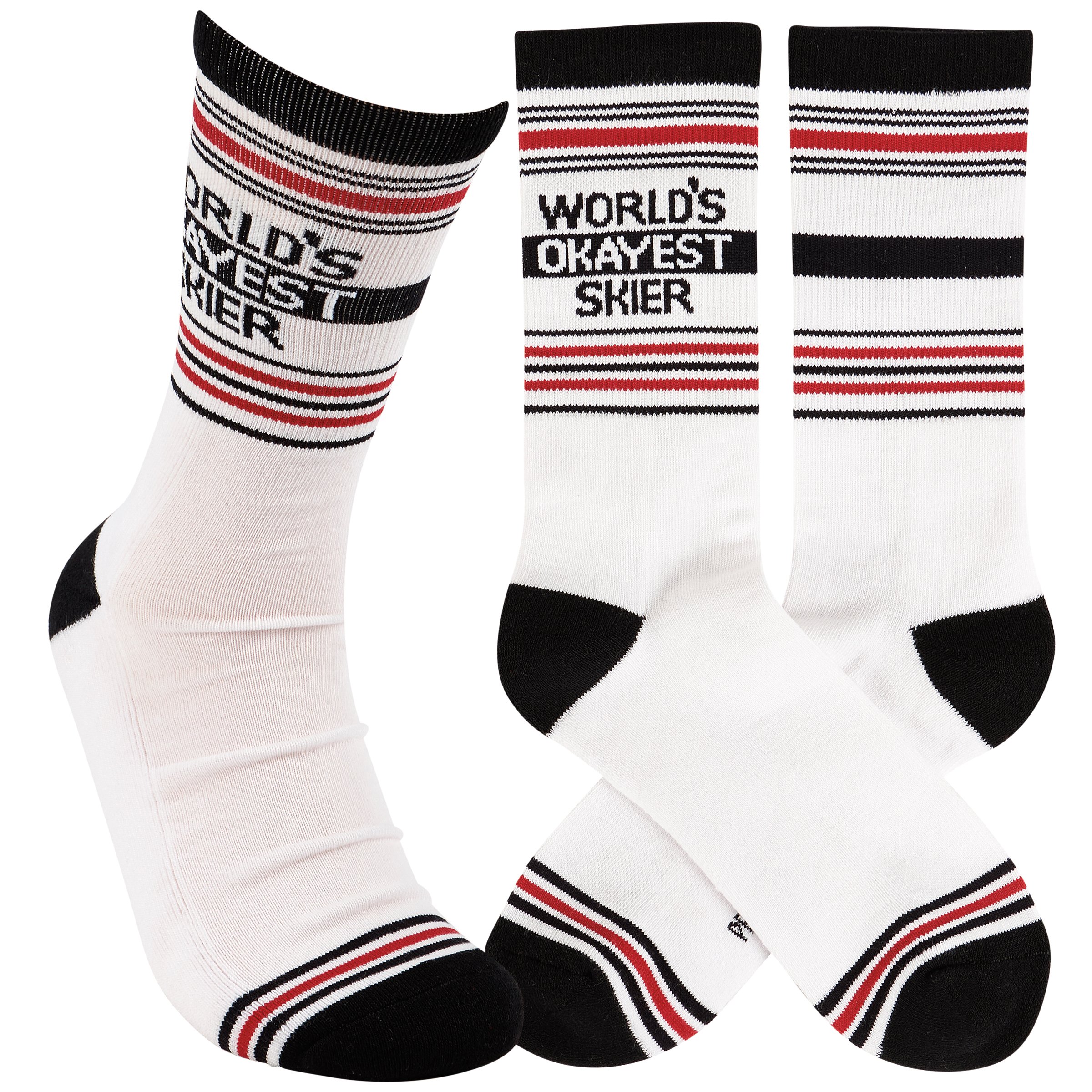 A pair of colorful socks from our Ski Lodge Collection displaying a tube sock inspired design with a fun ski-themed sentiment that reads "World's Okayest Skier." These giftable socks are made with a cotton, nylon, and spandex blend for a one size fits most design. Our World's Okayest Skier socks come with a decorative header card and a clear plastic hanger for easy rack display and gifting. A fun ski-themed gift perfect for everyday self-expression.