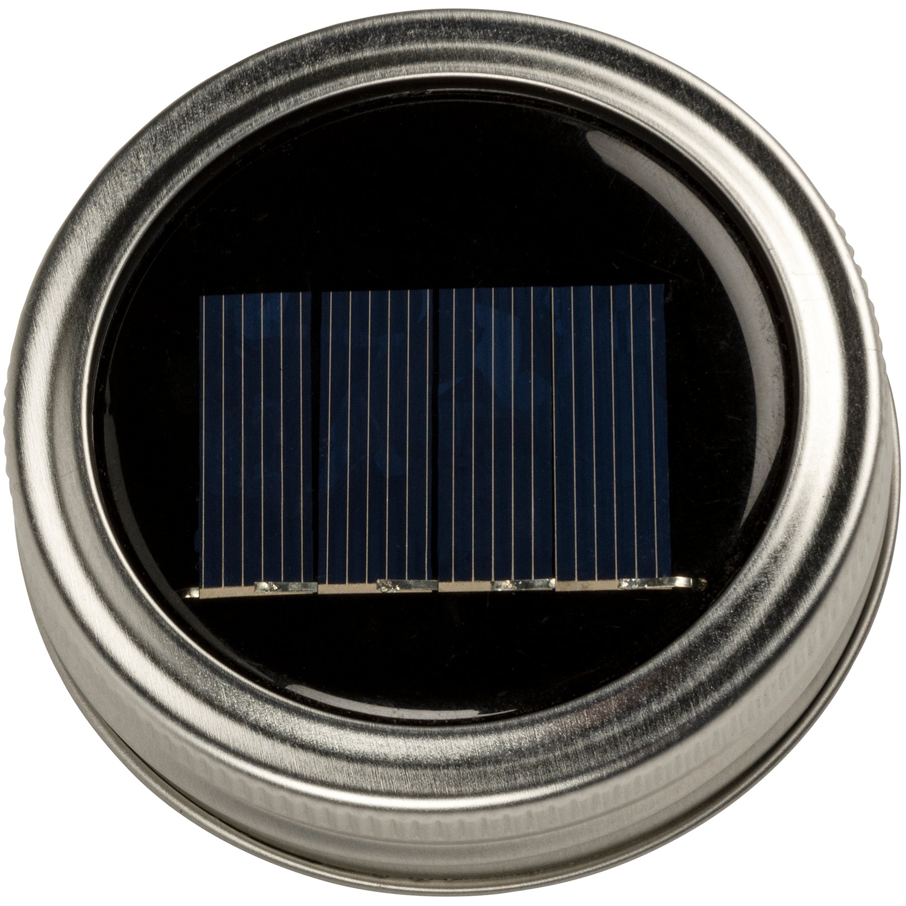 This solar jar lid from our Decorative Lighting Collection is perfect for adding a little ambience to any space. Automatically senses when the room is dark and the string of 10 warm yellow lights will illuminate. Fits standard size canning jars. Rechargeable AAA battery included.