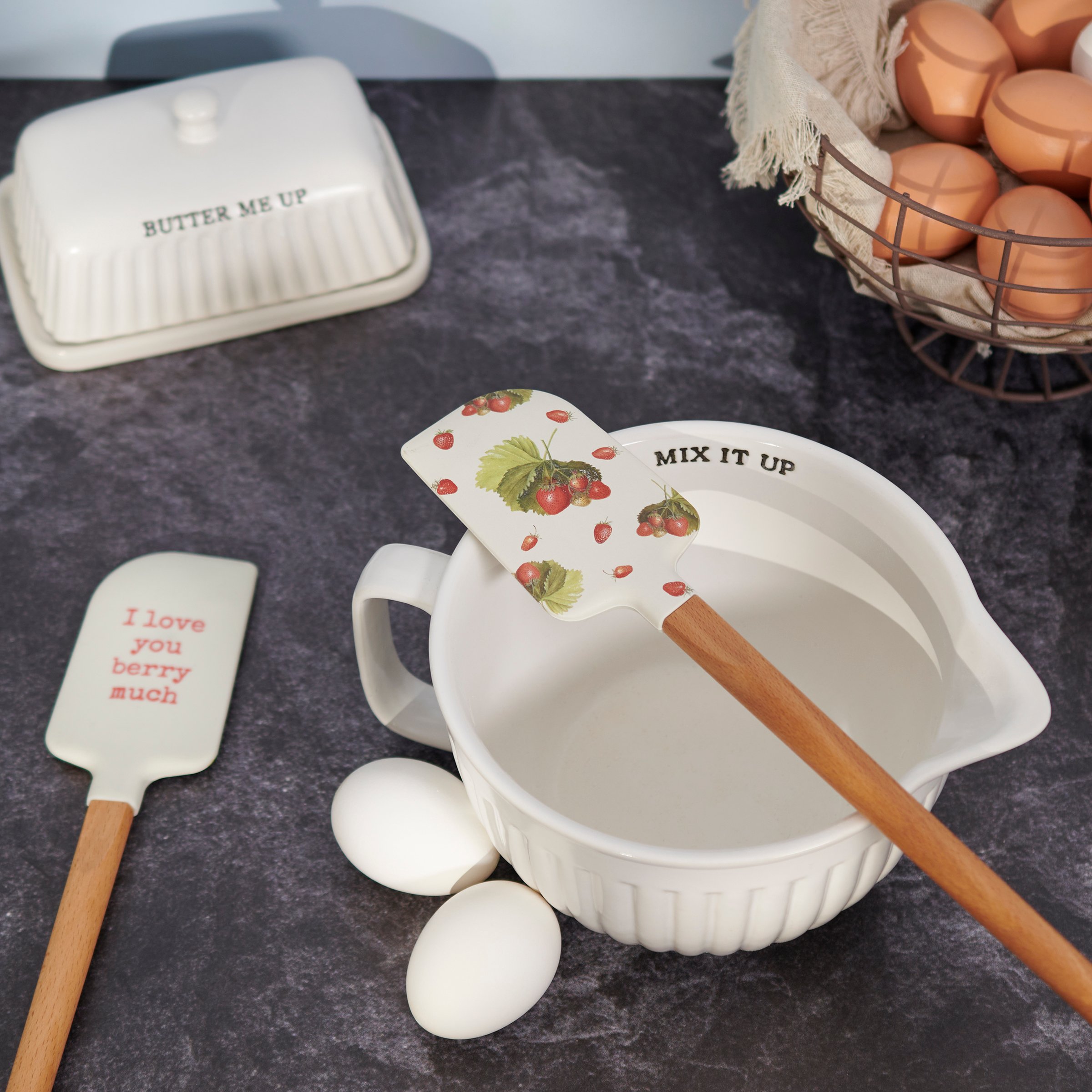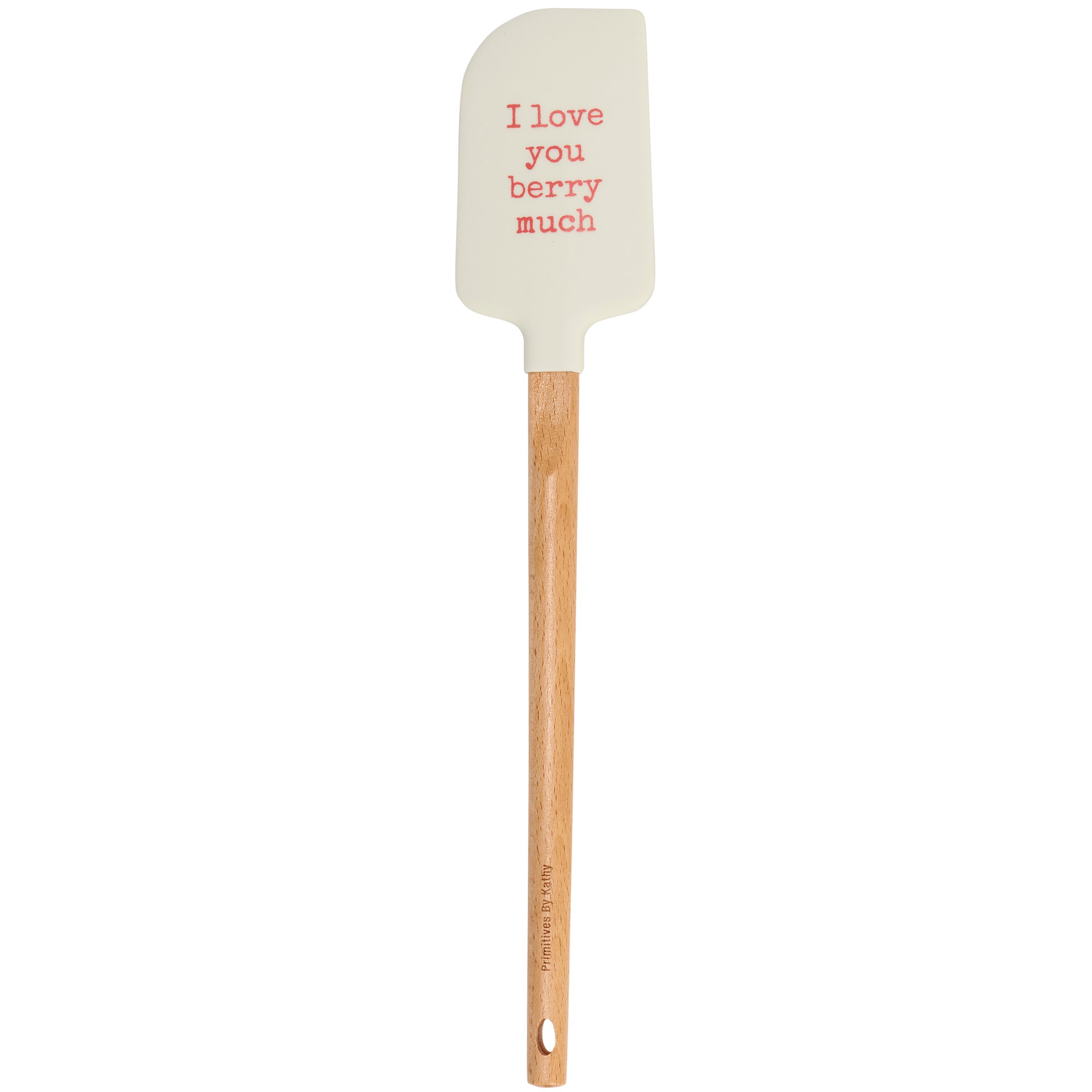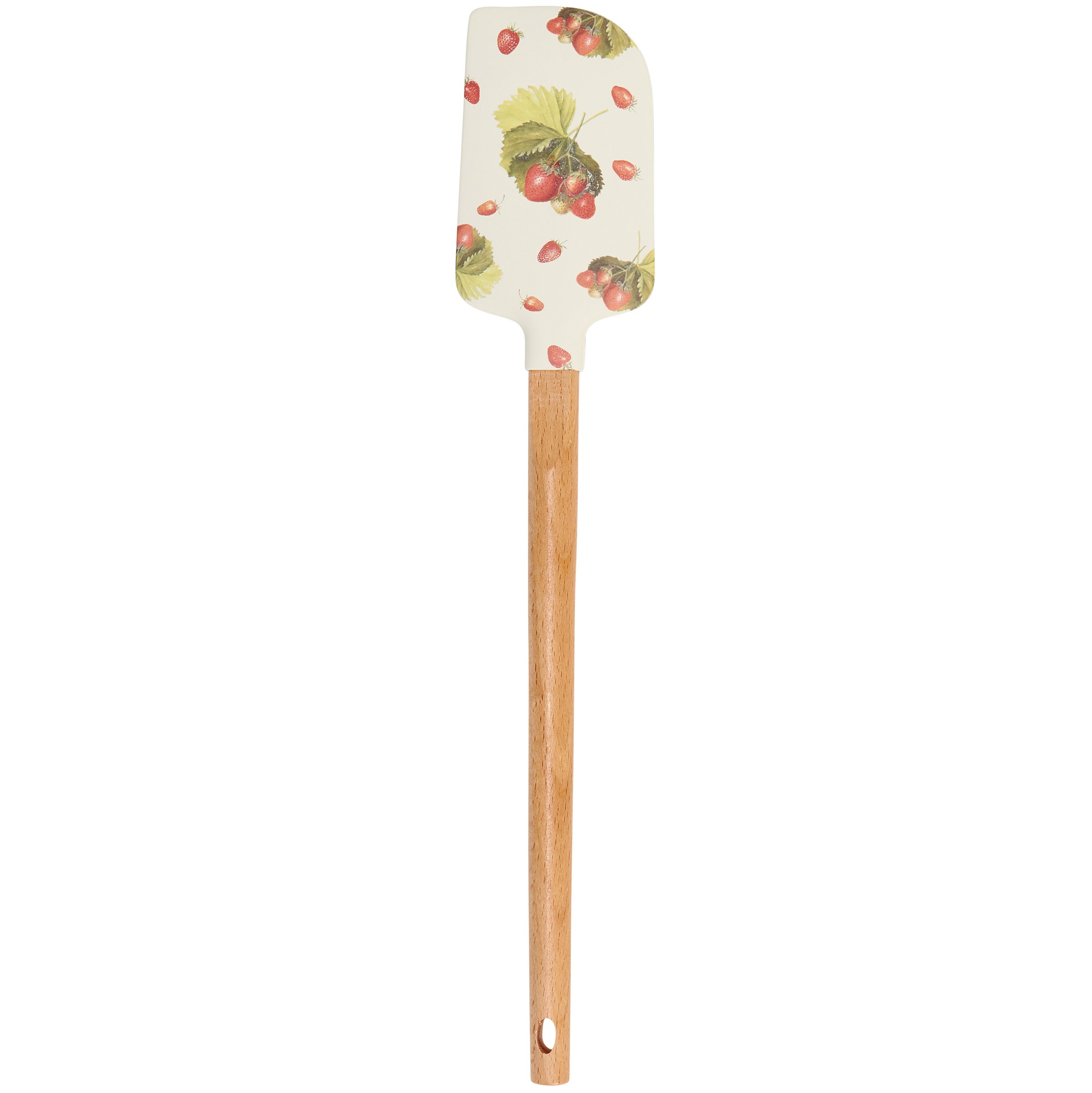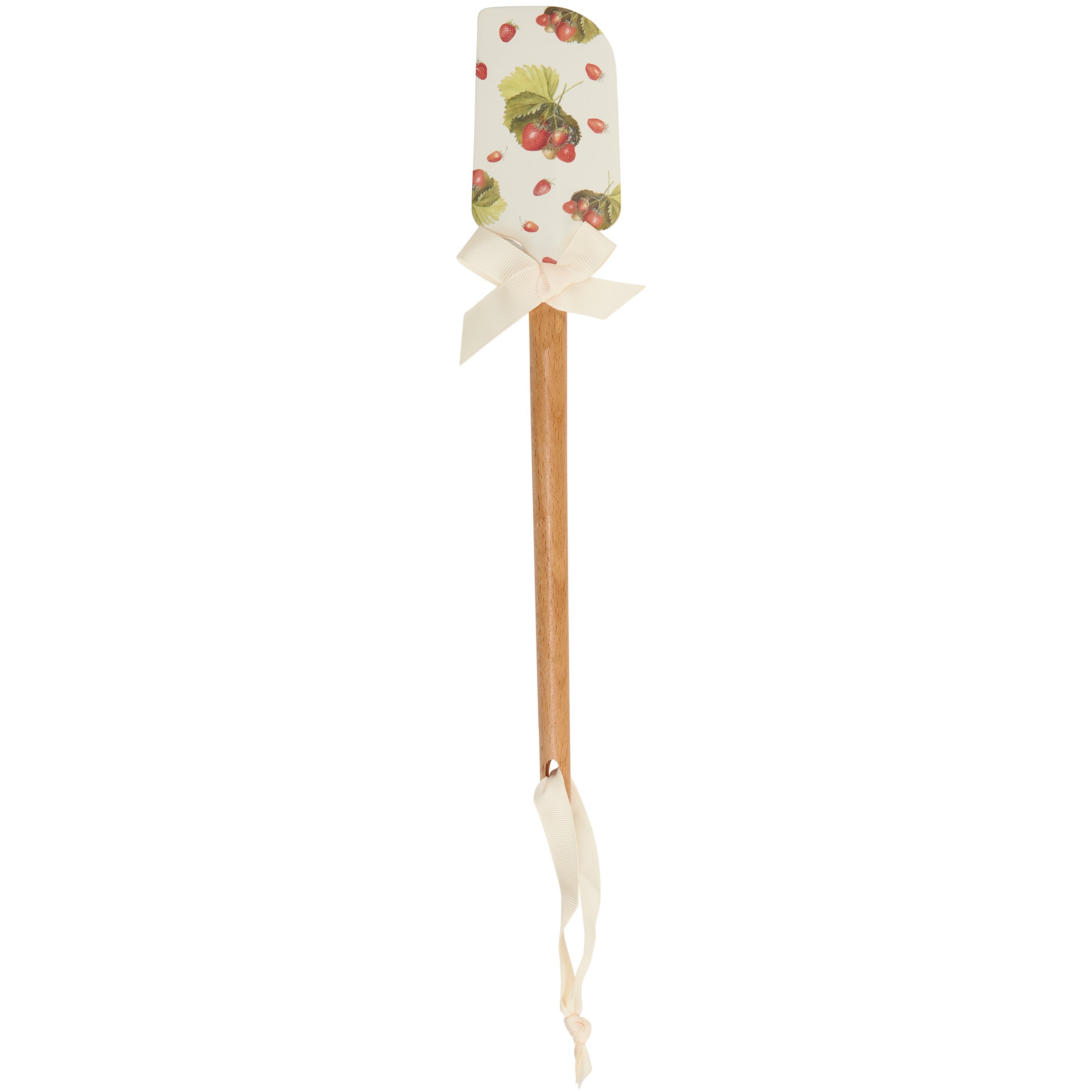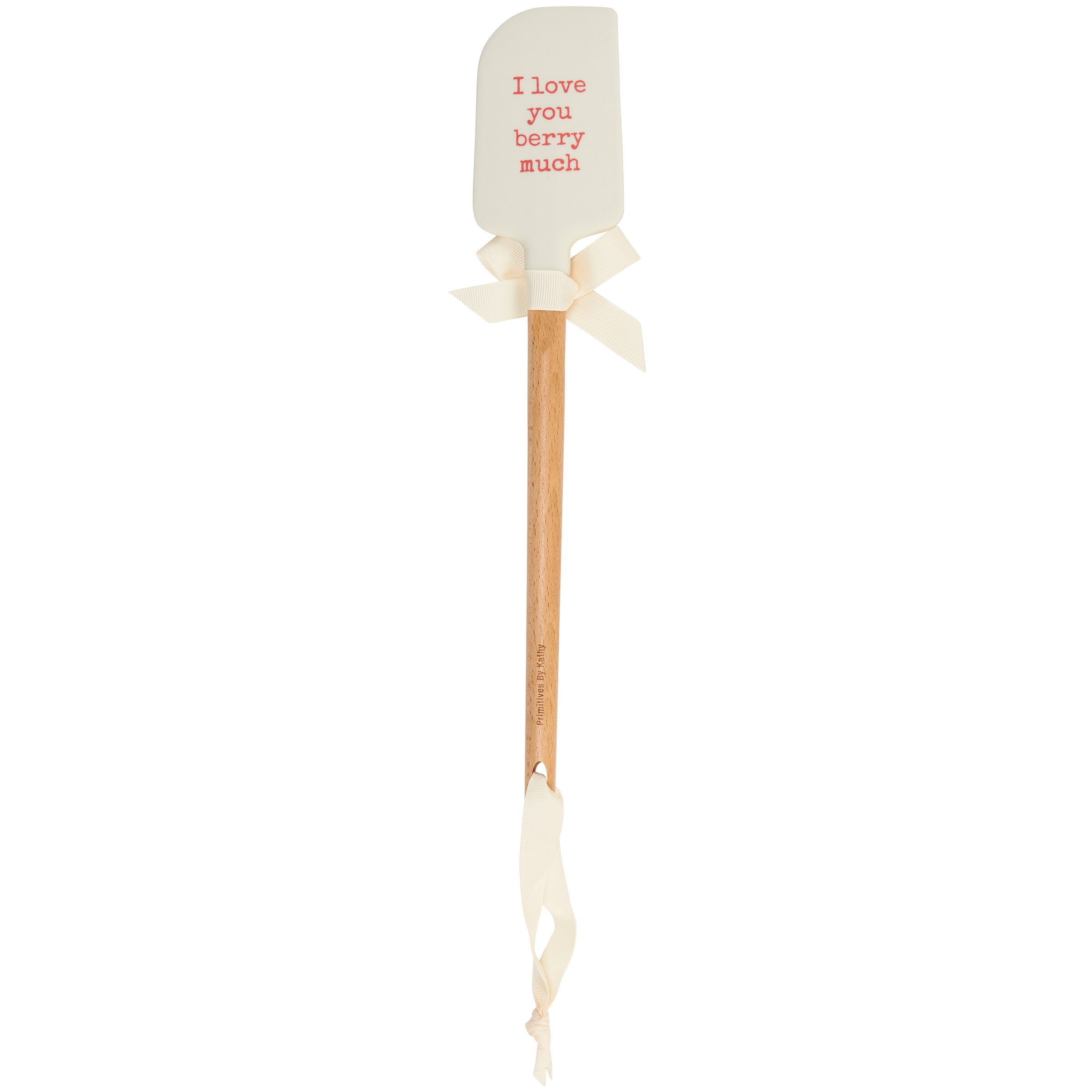 A double-sided silicone spatula from our Garden Collection displaying vintage art of wild strawberries on one side and punny sentiment on the other side that reads "I Love You Berry Much." Logo is engraved into wooden handle for added interest. Our Berry Much spatula includes a complementing decorative bow and hole at the bottom for hanging. Hand-wash recommended; not microwave safe. A fun strawberry-themed kitchen accessory perfect for everyday use.