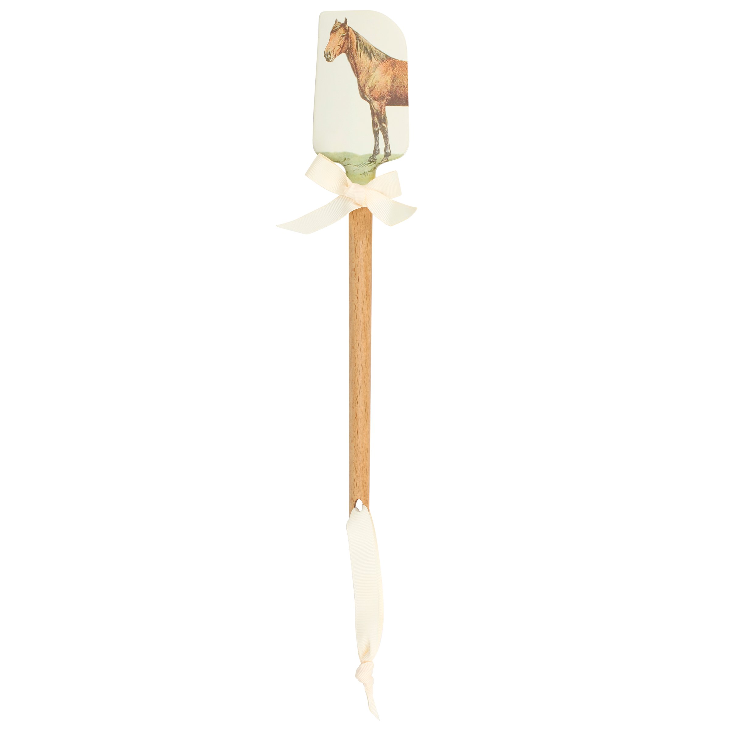 A double-sided silicone spatula from our Farmhouse Collection displaying vintage art of a horse on one side and a horse pun on the other side that reads "Can't Rein In The Urge To Bake!" Our Can't Rein In The Urge To Bake spatula includes a coordinating decorative bow and ribbon at the bottom for hanging. Hand-wash recommended; not microwave safe. A fun farm themed gift perfect for adding personality to any kitchen.