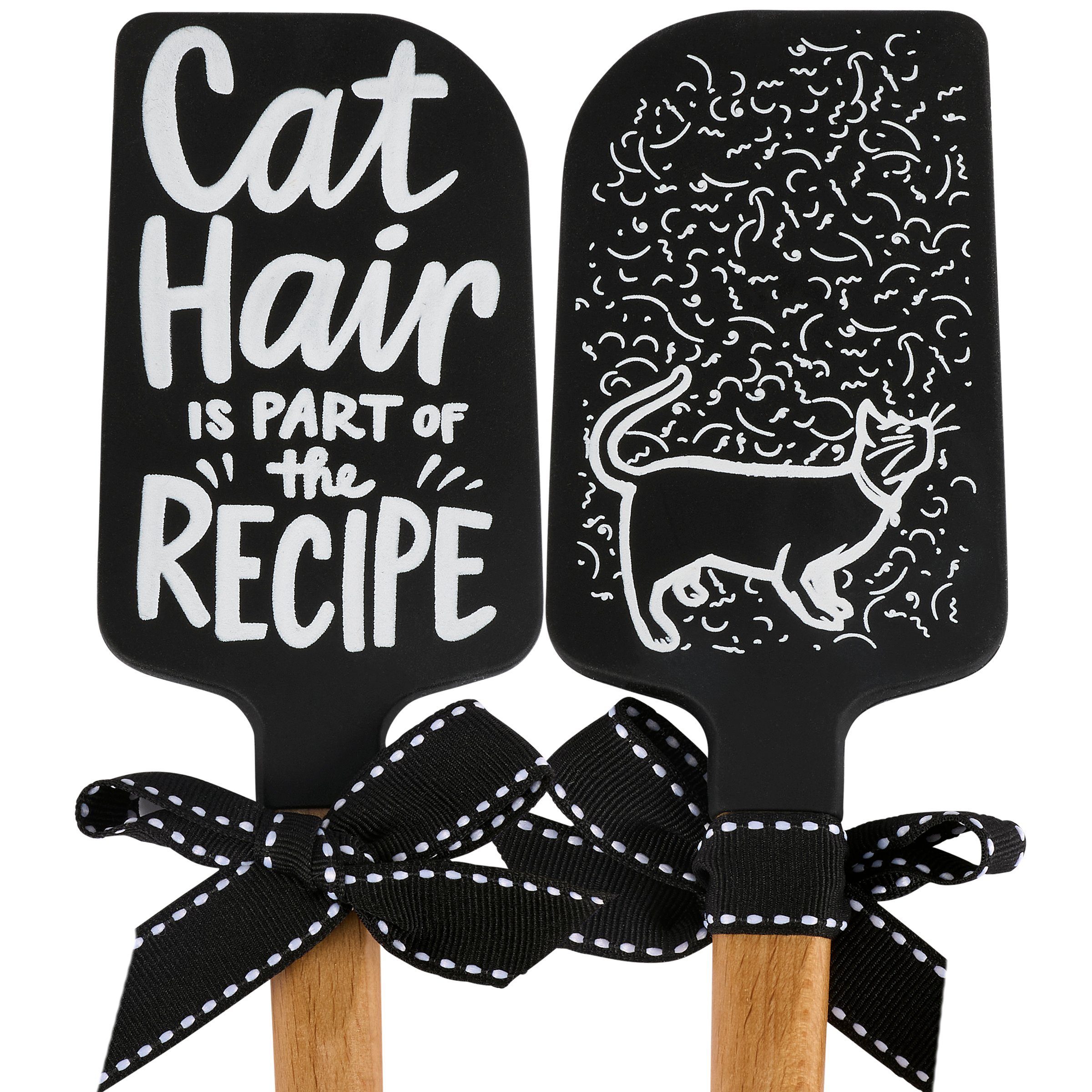 A double-sided silicone spatula displaying a hand illustrated black and white design featuring a cat and cat hair on one side and a fun cat inspired sentiment on the other side that reads "Cat Hair Is Part Of The Recipe." Our Cat Hair spatula includes a coordinating decorative bow and hole at the bottom for hanging. Hand-wash recommended; not microwave safe. A fun pet-themed kitchen accessory perfect for everyday use.