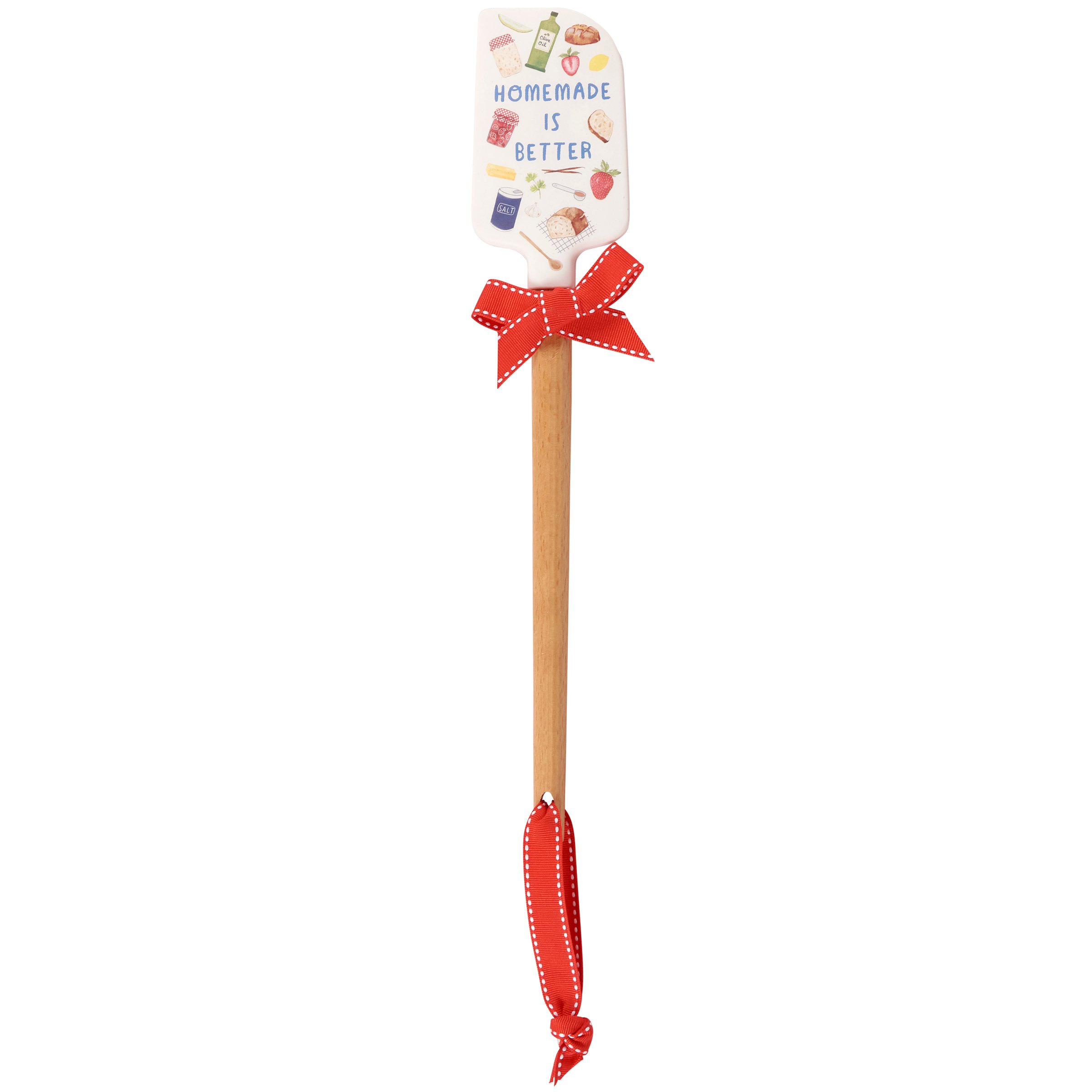 A double-sided silicone spatula from our Homestead Collection displaying hand illustrations of homemade food and ingredients with "Homemade Is Better" sentiment on one side and red gingham pattern on the other side. Our Homemade Is Better spatula includes a coordinating decorative bow and ribbon at the bottom for hanging. Hand-wash recommended; not microwave safe. A fun kitchen accessory perfect for everyday use.