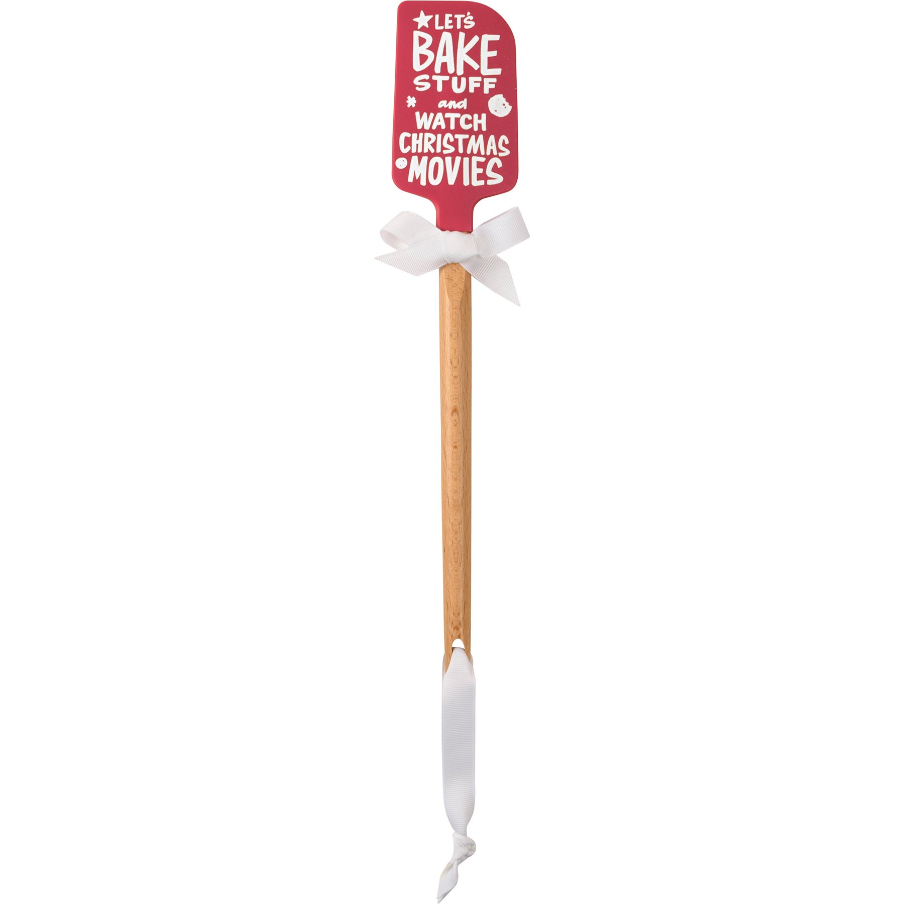 A double-sided silicone spatula from our Christmas Collection features "Let's Bake Stuff And Watch Christmas Movies" sentiment and cookie designs on one side, and bell, stars, gingerbread men, and characters watching movie designs on the other side. Our Let's Bake Stuff And Watch Christmas Movies spatula features a logo engraved into wooden handle for added interest and a decorative bow and ribbon for hanging. Hand-wash recommended; not microwave safe.