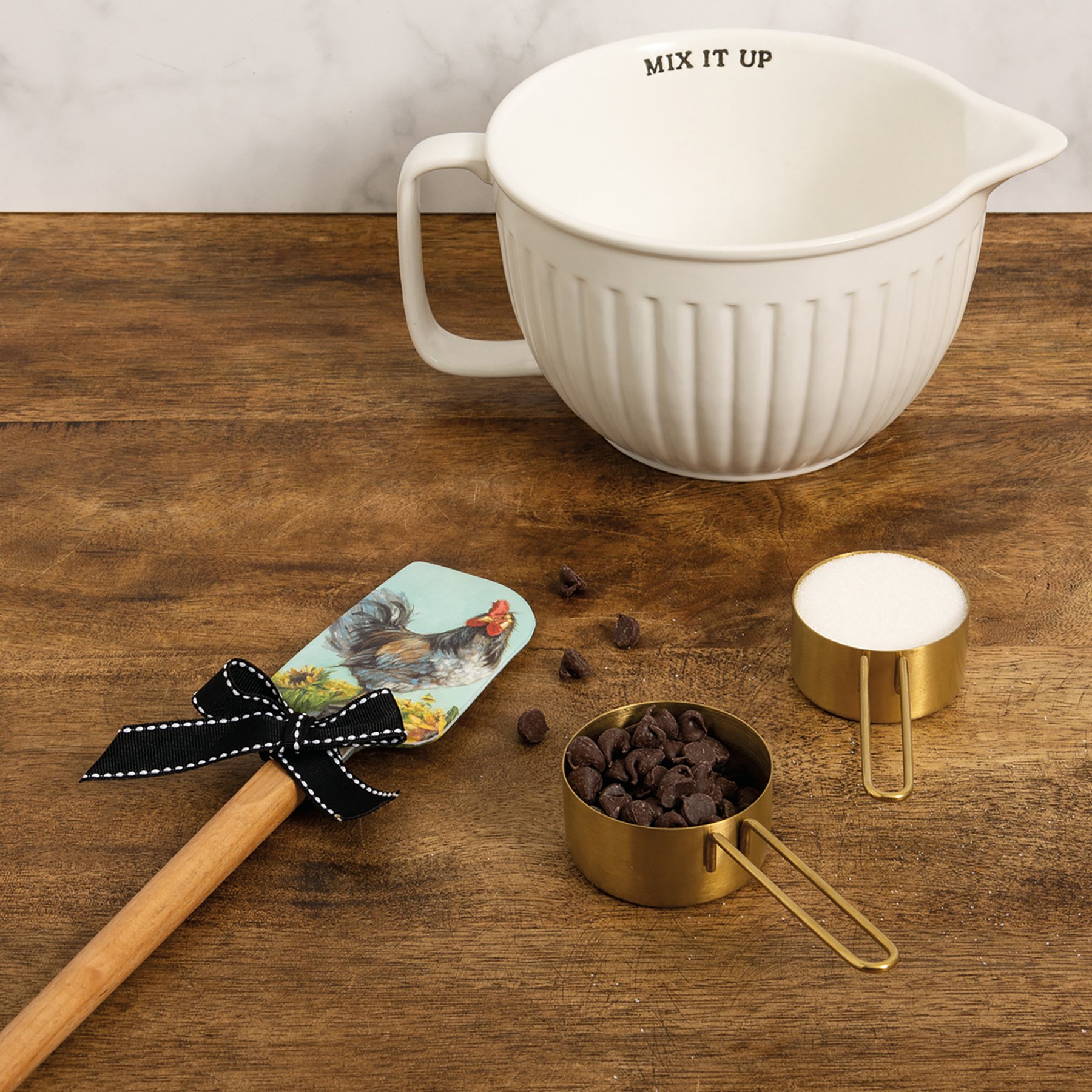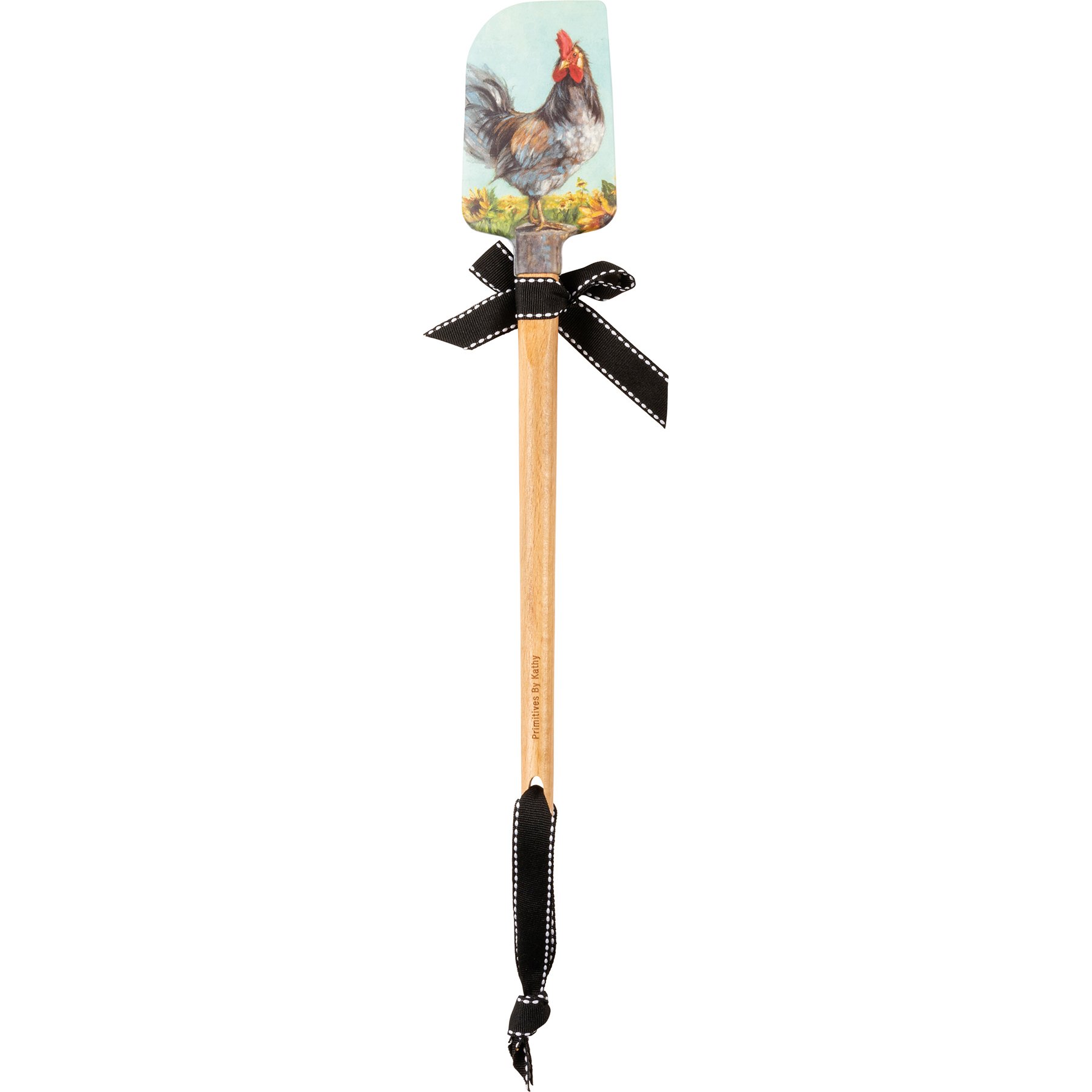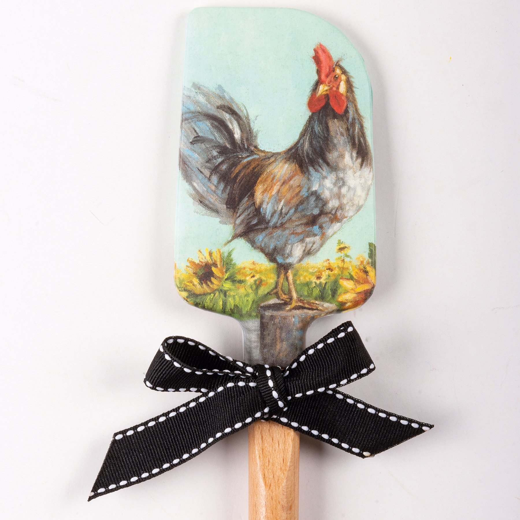 A double-sided silicone spatula featuring a depiction of a rooster. Design is replicated from original artwork painted onto burlap canvas, giving the art a unique depth and texture. Logo is engraved into wooden handle for added interest and includes a decorative bow and a ribbon for hanging. Hand-wash recommended; not microwave safe.