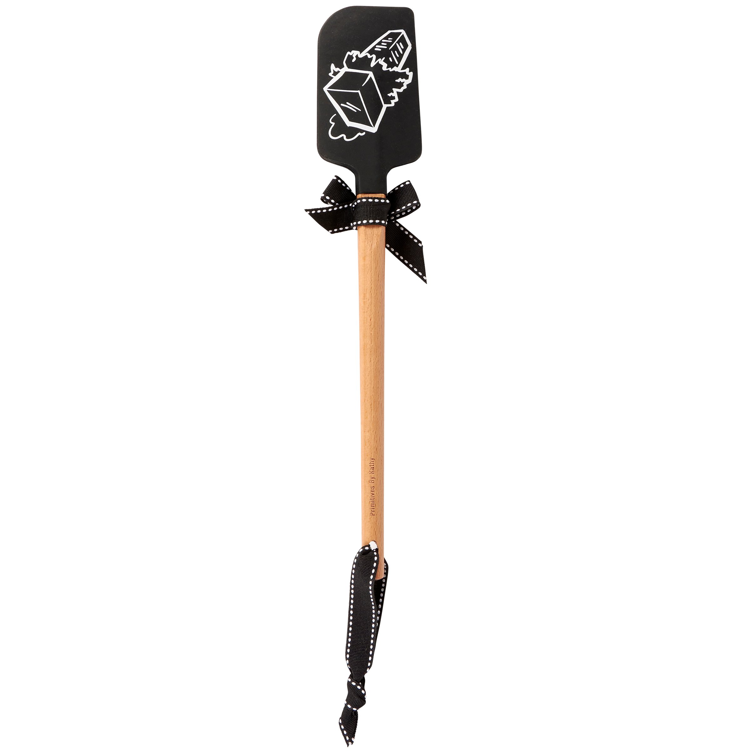 A double-sided silicone spatula from our LOL-Made You Smile Collection displaying a hand illustrated black and white design featuring a stick of butter on one side and a fun butter themed sentiment on the other side that reads "There's No Such Thing As Too Much Butter." Our Too Much Butter spatula includes a coordinating decorative bow and ribbon at the bottom for hanging. Hand-wash recommended; not microwave safe. A fun kitchen accessory perfect for everyday use.