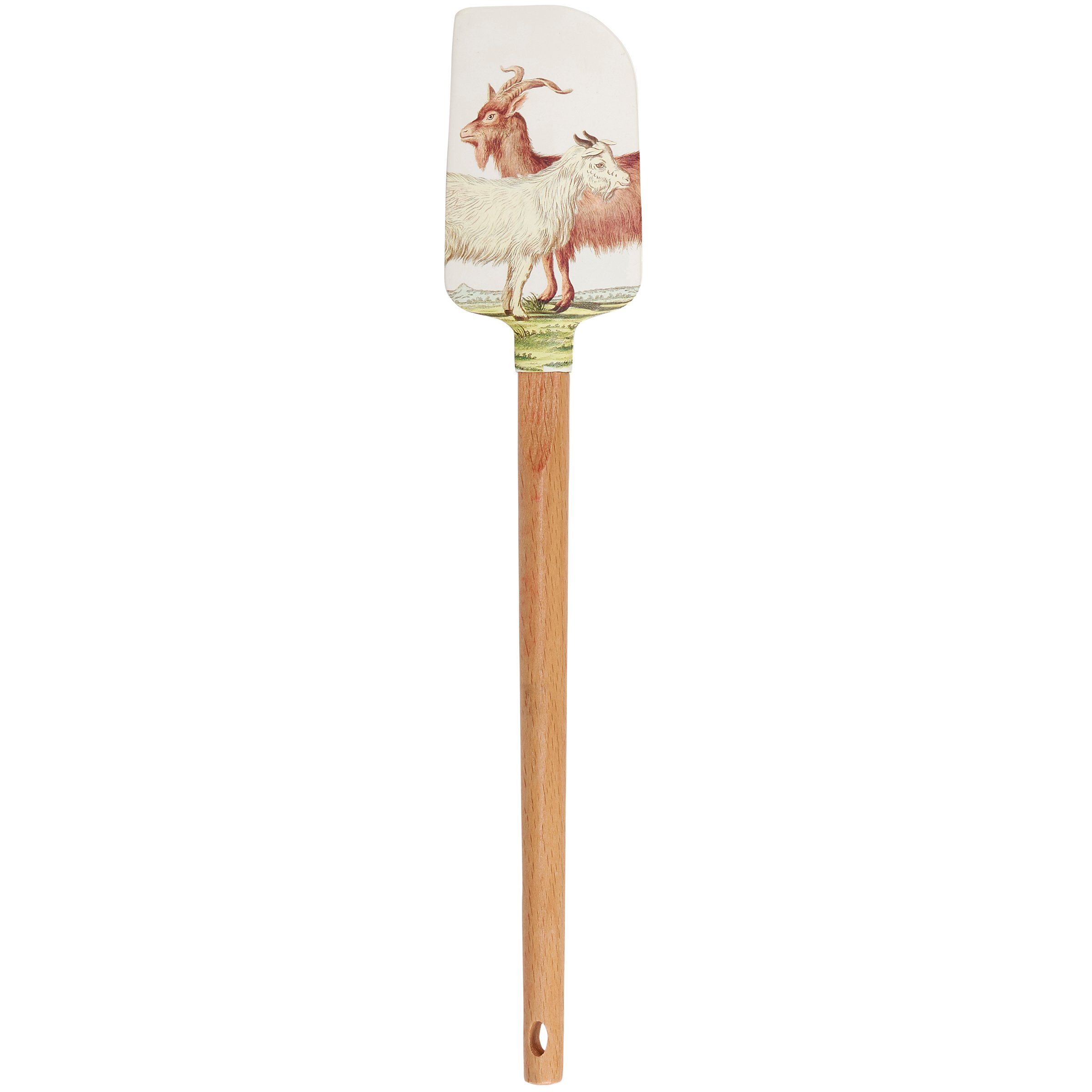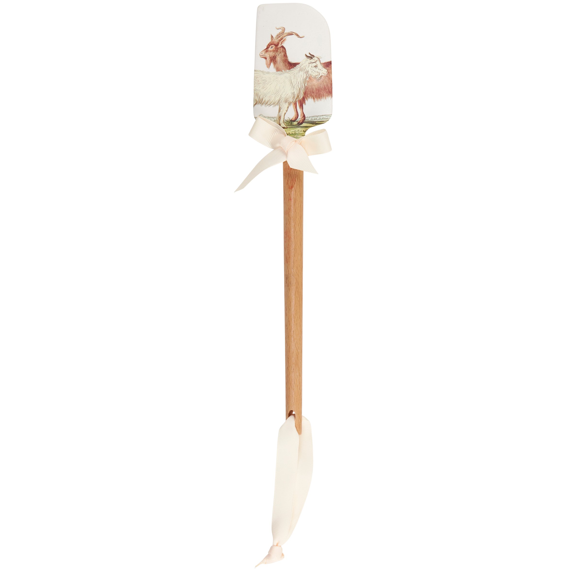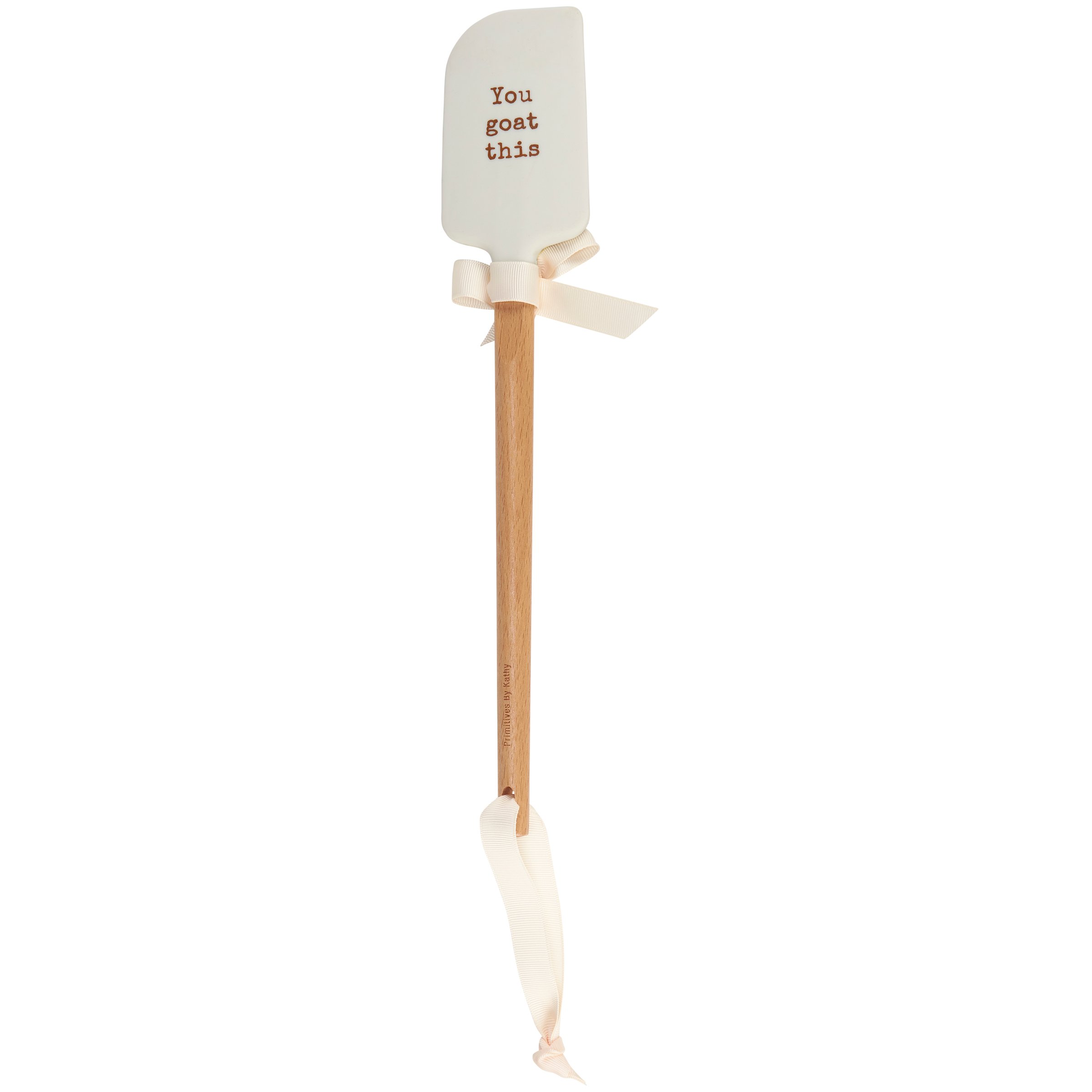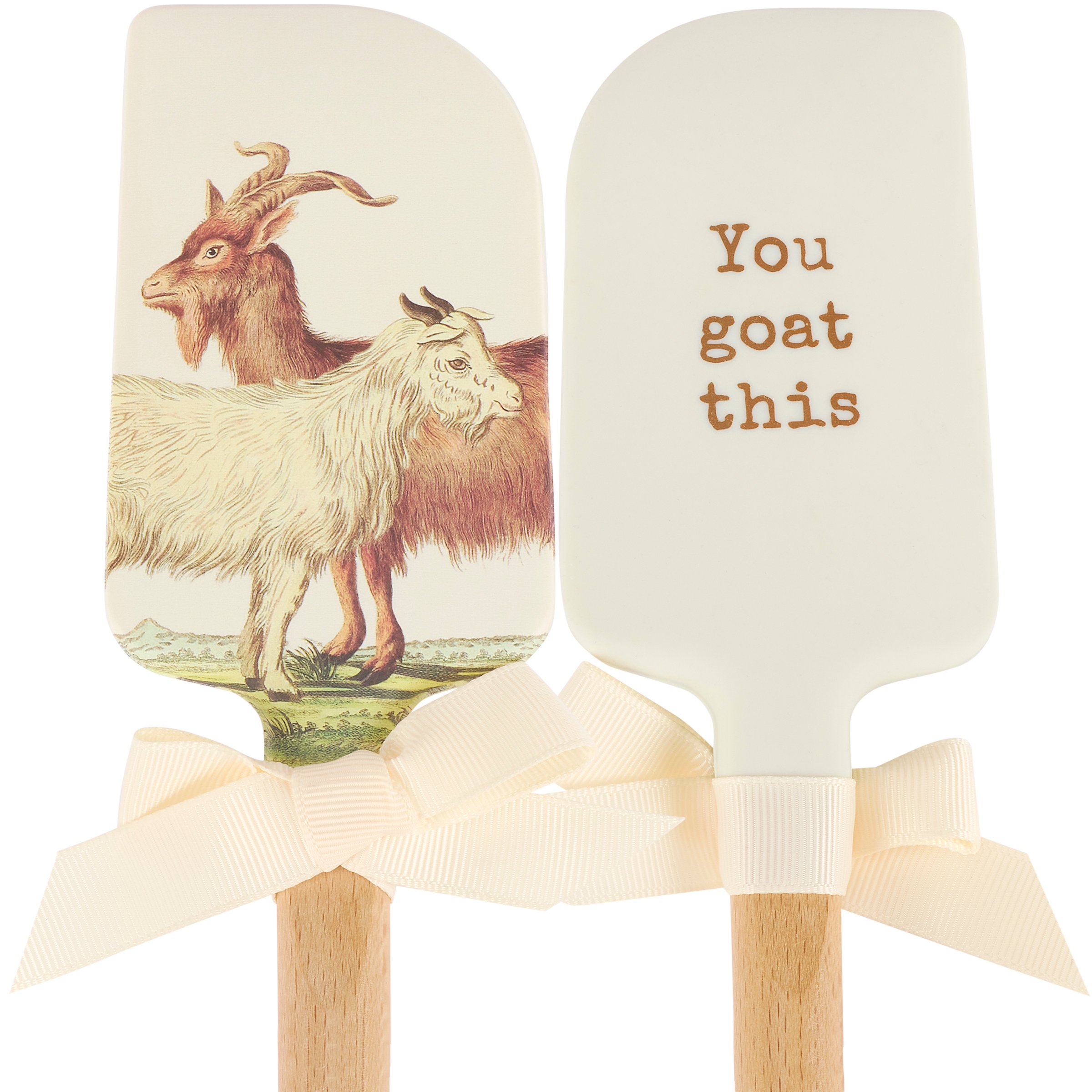 A double-sided silicone spatula from our Farmhouse Collection displaying vintage art of goats on one side and farm inspired pun that reads "You Goat This" on the other. Logo is engraved into wooden handle for added interest. Our You Goat This spatula includes a complementing decorative bow and hole at the bottom for hanging. Hand-wash recommended; not microwave safe. A fun farm-themed kitchen accessory perfect for everyday use.