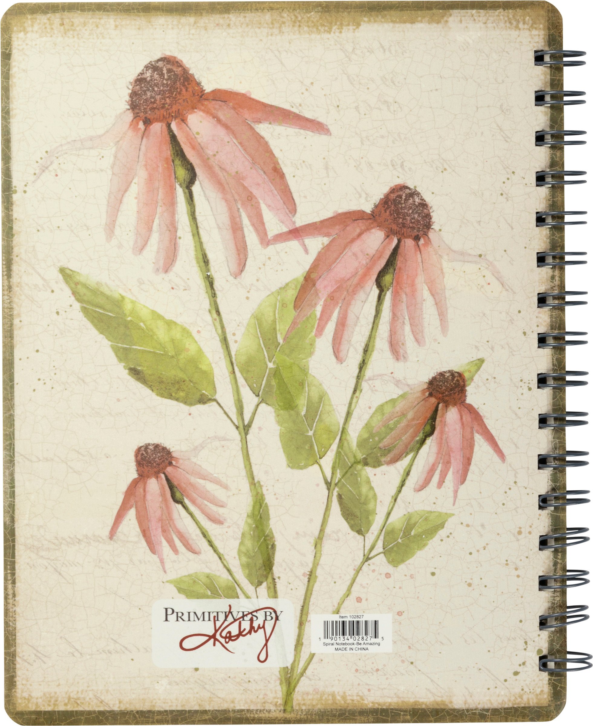 A spiral notebook featuring a front cover "Be Amazing" sentiment with double-sided floral designs. Contains 120 lined pages. Complements well with coordinating pieces in collection for a refreshing spring display.