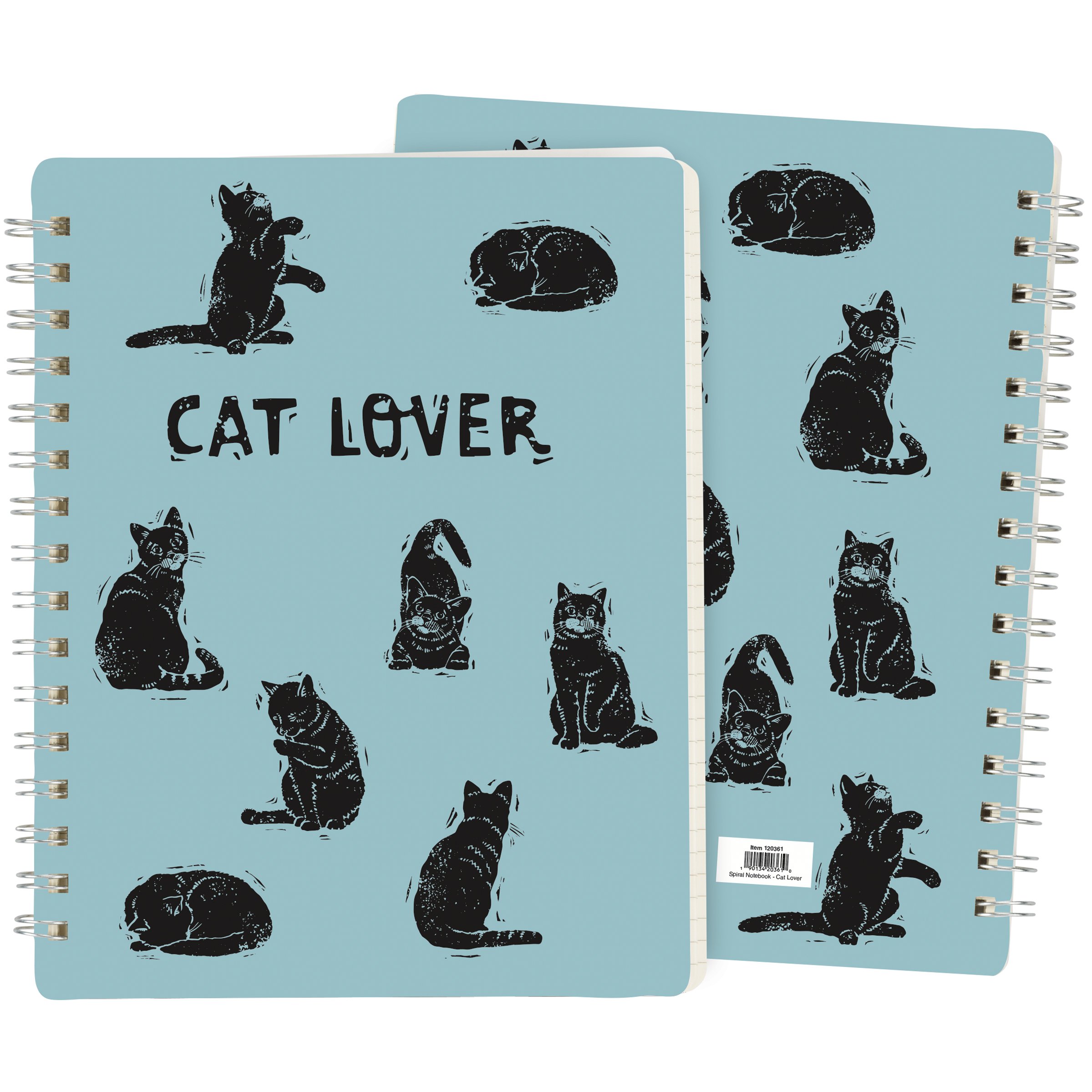 A double-sided spiral notebook from our Pet Collection displaying fun cat designs in a block print art style with a pet inspired sentiment that reads "Cat Lover." Back cover features coordinating cat designs. Our spiral Cat Lover notebook includes 120 lined pages. A fun pet-themed gift perfect for an everyday accessory.