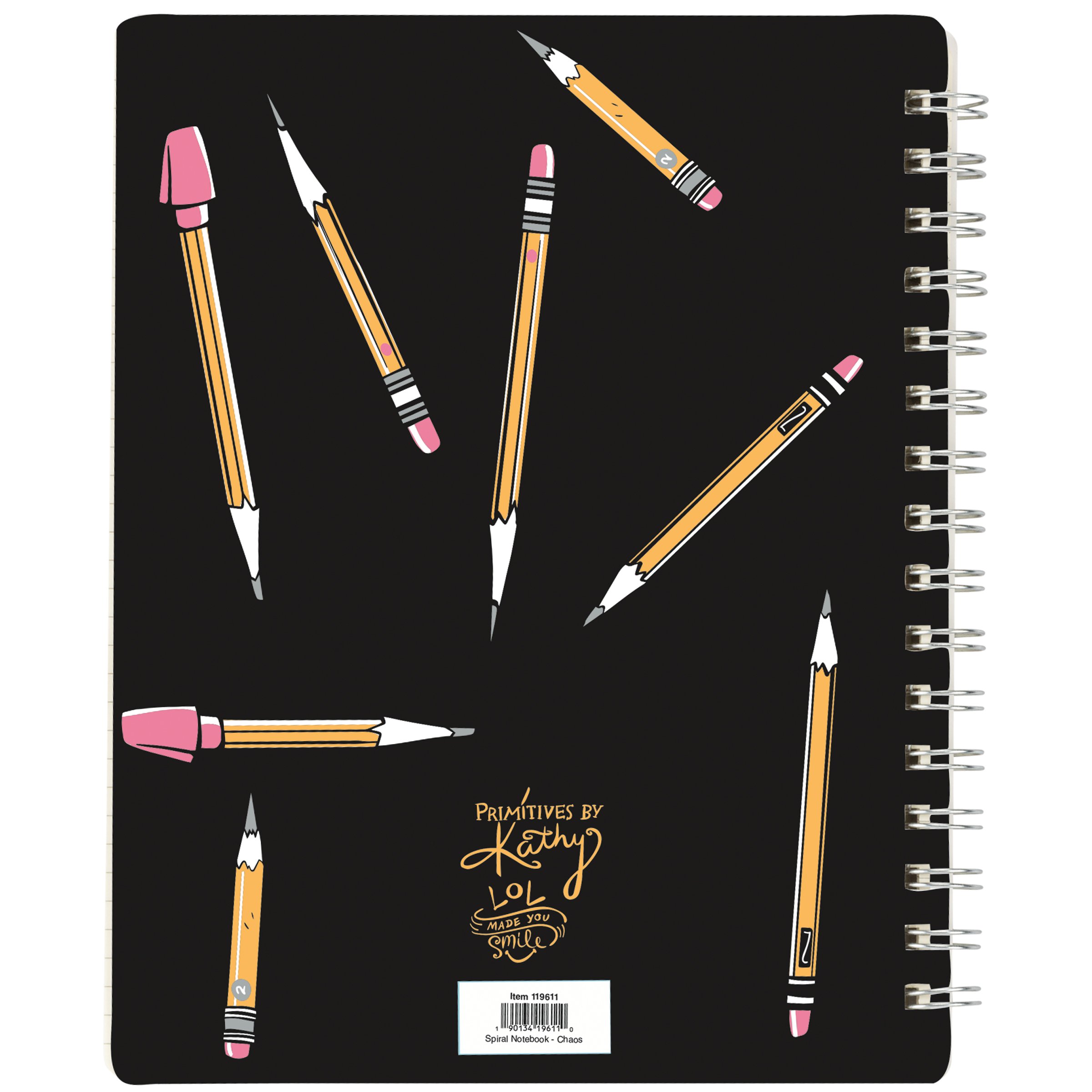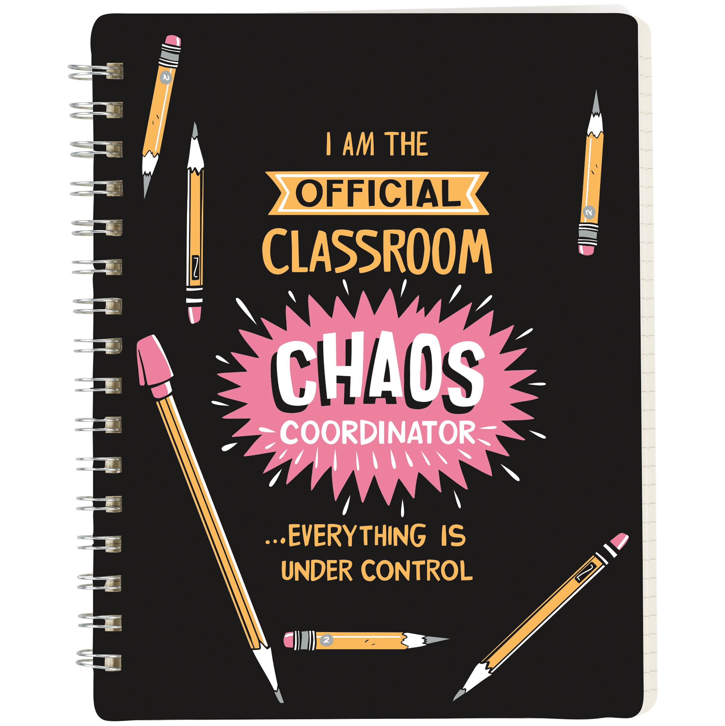 A double-sided spiral notebook from our Teacher Collection displaying playful hand illustrated designs of pencils with a fun teacher inspired sentiment that reads "I Am The Official Classroom Chaos Coordinator ...Everything Is Under Control." Back cover features coordinating pencil pattern. Our Classroom Chaos spiral notebook includes 120 lined pages. A fun teacher gift perfect for an everyday accessory.
