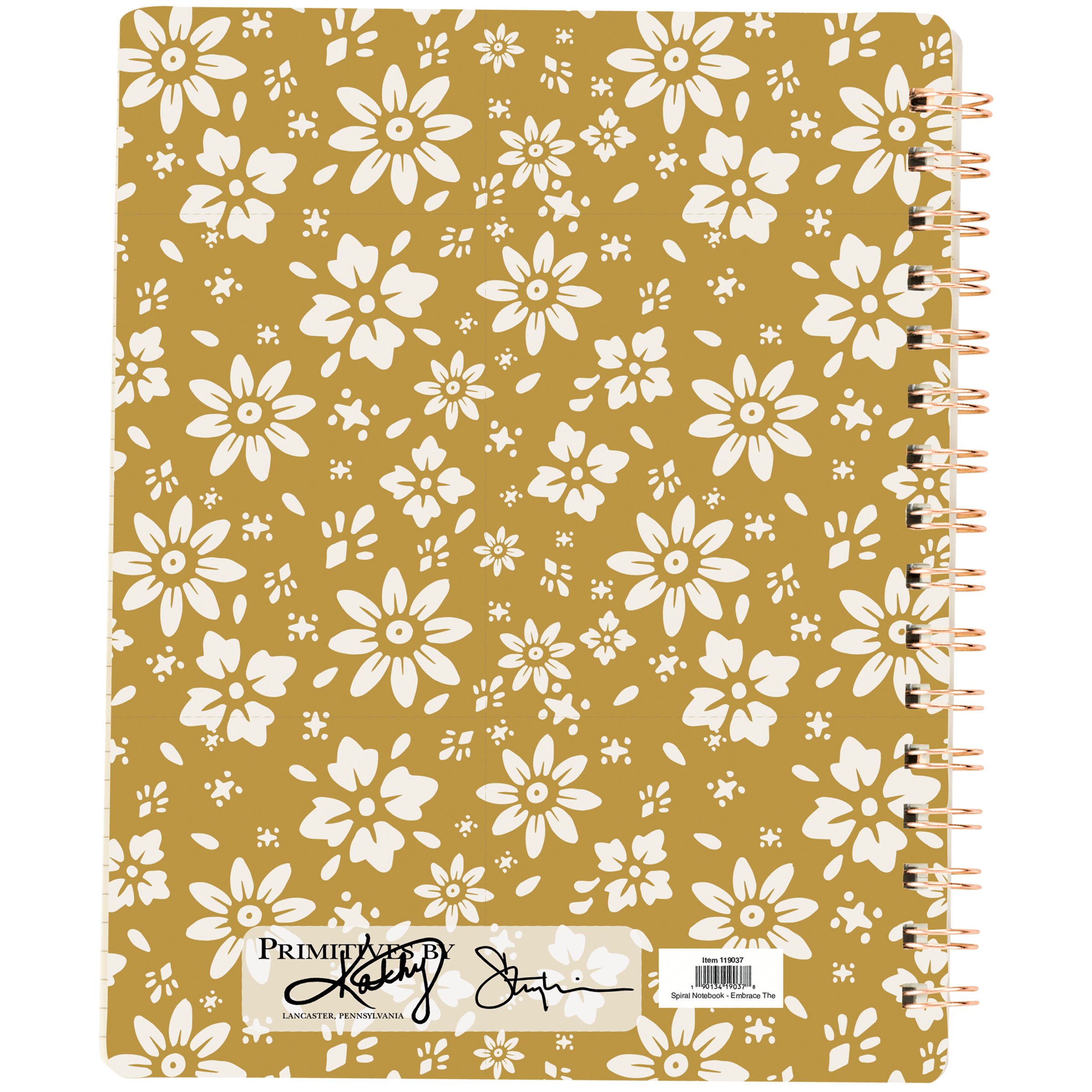 A double-sided spiral notebook from our Folk Art Collection displaying a calming hand illustrated pattern of gold florals inspired by Scandinavian folk art surrounding a motivational sentiment that reads "Embrace The Magic Of New Beginnings." Back cover features coordinating gold floral pattern. Our Embrace The Magic spiral notebook includes 120 lined pages. An inspirational everyday accessory that is also great for gifting.