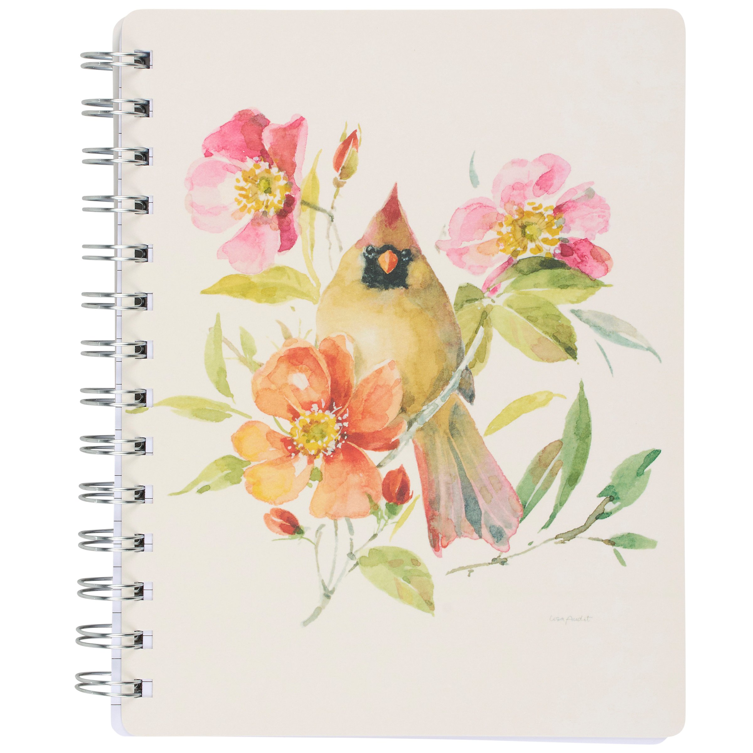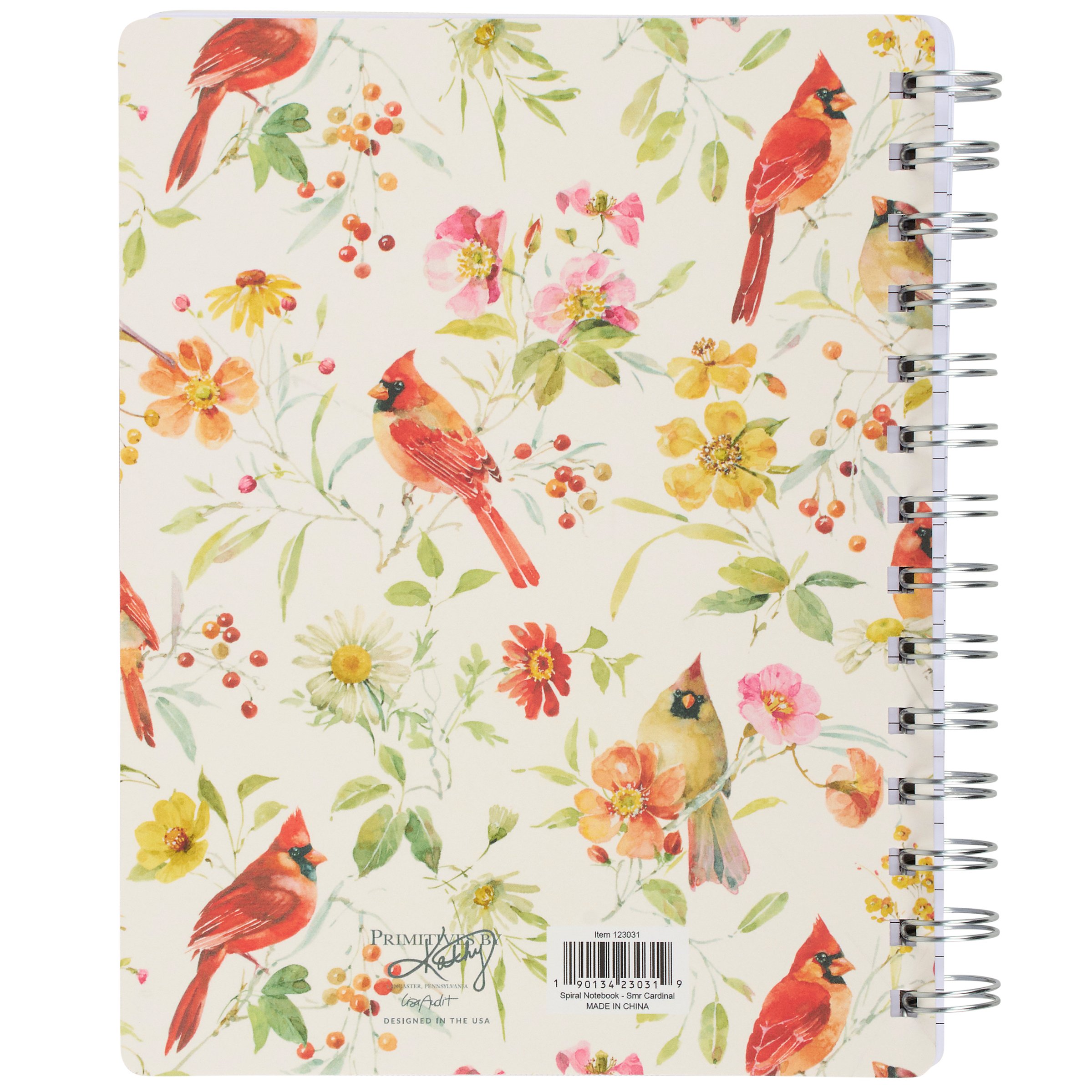 A double-sided spiral notebook from our Botanical Collection displaying a charming scene of a cardinal on a branch with summer flowers. Back cover features coordinating pattern of cardinals and flowers. Everyday cardinal designs are replicated from original art hand painted in a delicate watercolor style. Our Everyday Cardinals spiral notebook includes 120 lined pages. A stylish cardinal themed accessory that is also great for gifting.