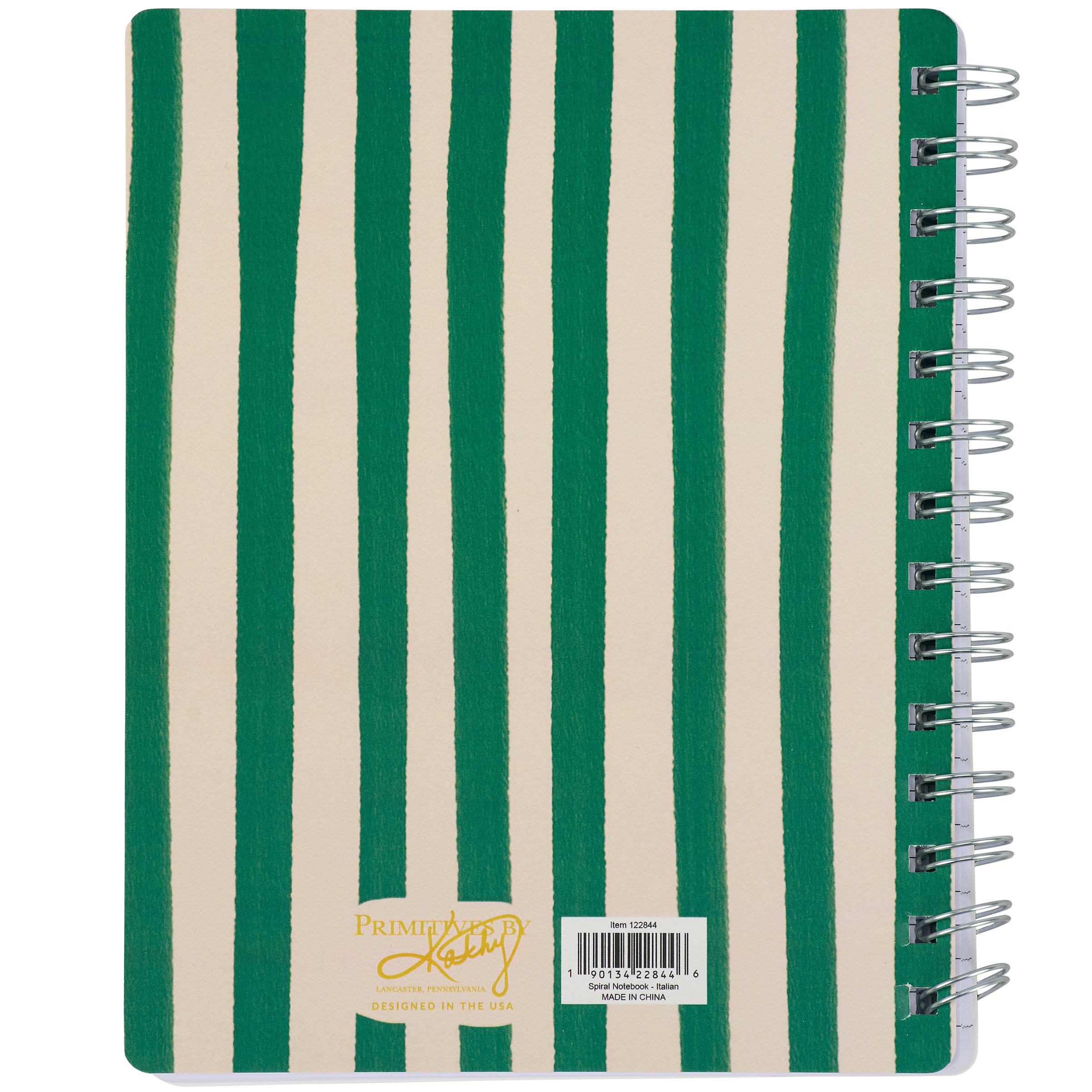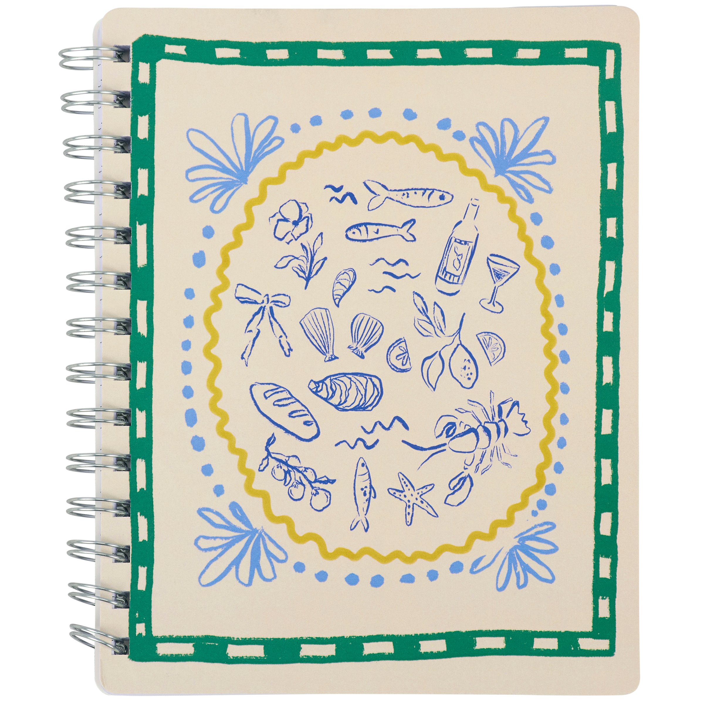 A double-sided spiral notebook from our Beach Collection featuring a hand painted watercolor design inspired by Italian coastal style. Front cover displays various seafood and dining themed designs and back cover displays coordinating green stripe pattern. Our Italian Coastal spiral notebook includes 120 lined pages. A stylish beach themed accessory that is also great for gifting.
