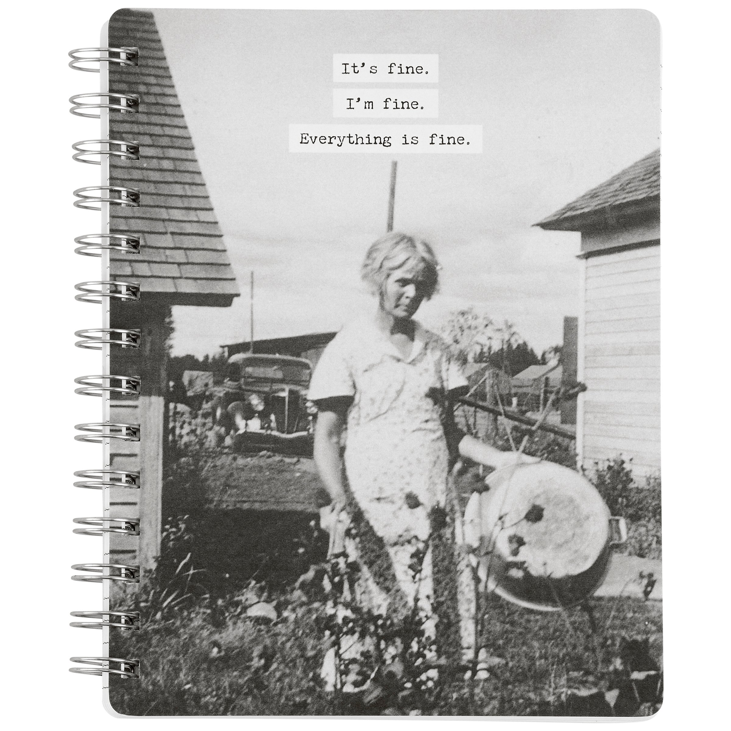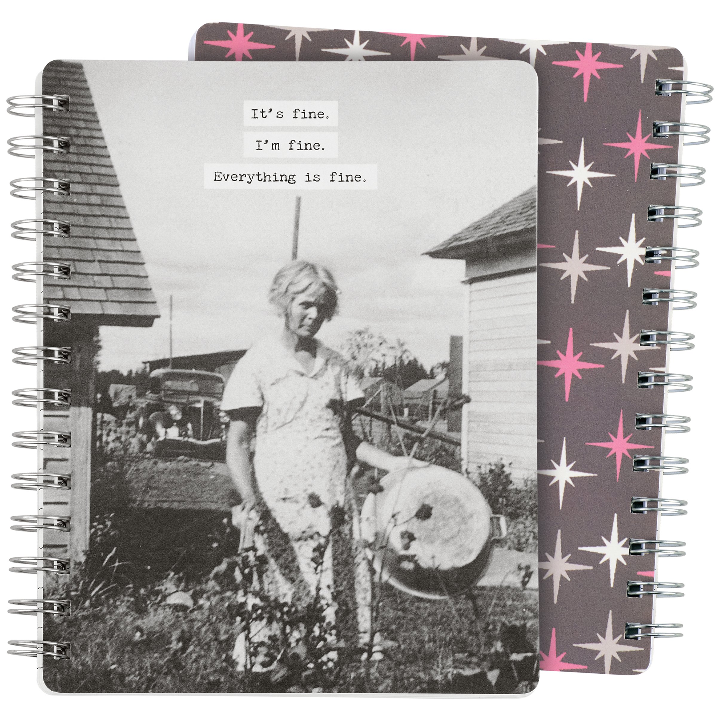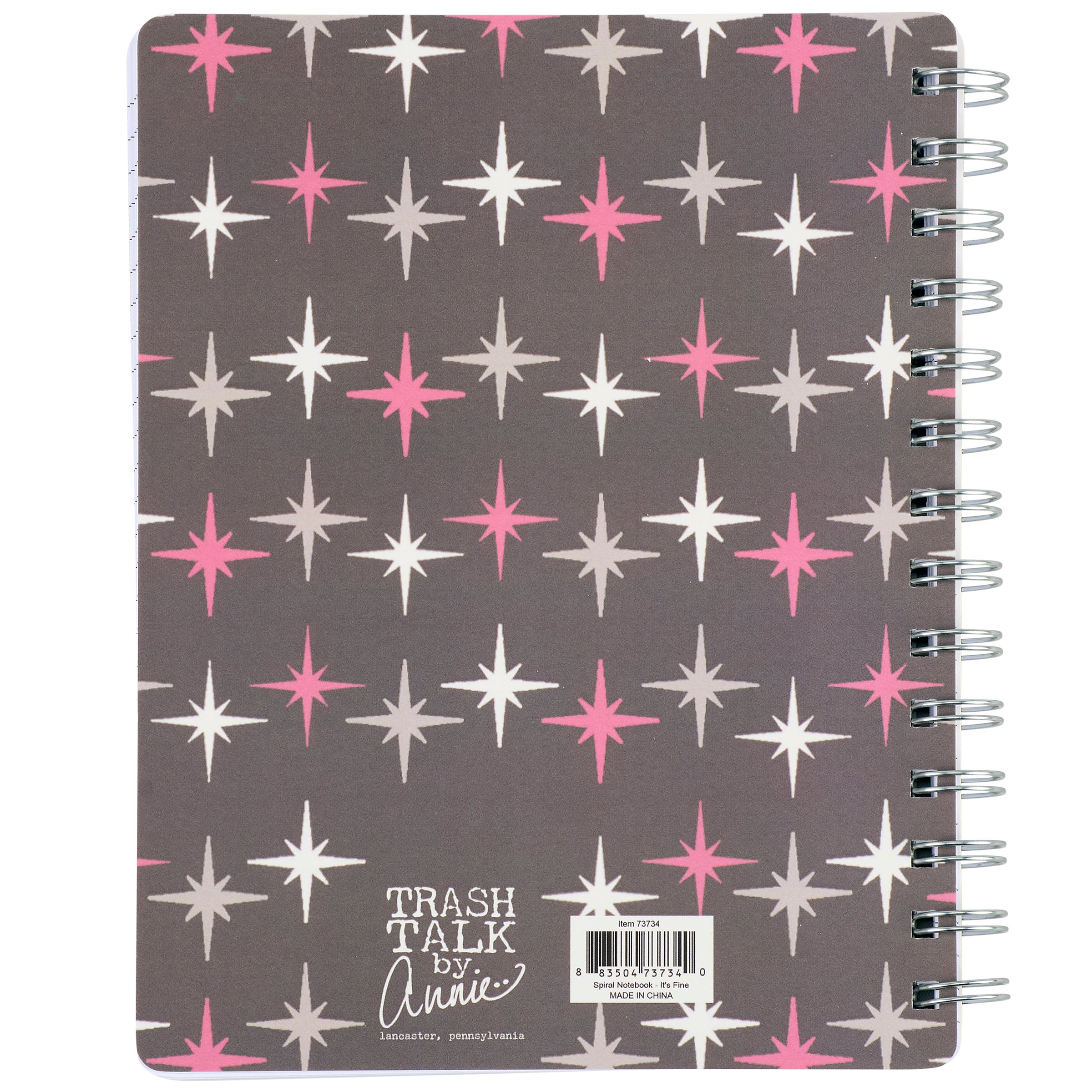 A double-sided spiral notebook from our Trash Talk By Annie Collection displaying a vintage black and white photo complemented by a sassy sentiment that reads "It's Fine. I'm Fine. Everything Is Fine." The back cover of the notebook features a classy pink and gray retro pattern to complete the look. Our It's Fine I'm Fine spiral notebook includes 120 lined pages. A fun gift that calls back to a vintage style with modern sassy sentiments, perfect for making a statement while getting a giggle out of others.