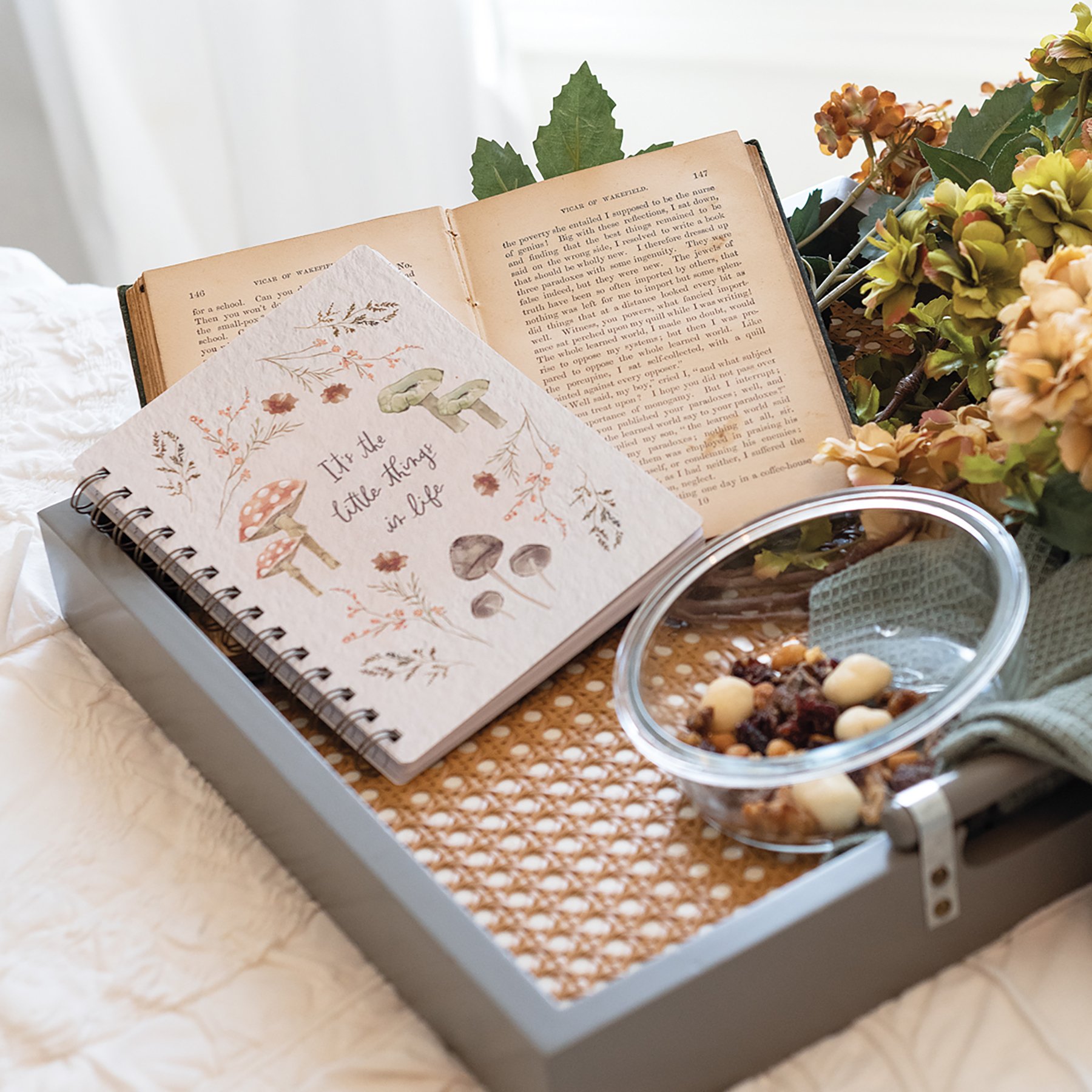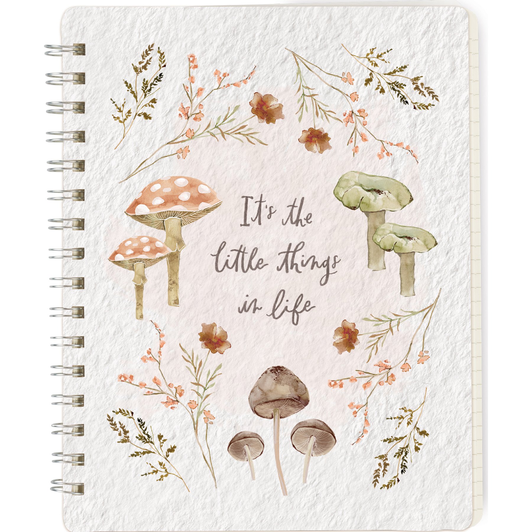 A double-sided spiral notebook from our Cottagecore Collection displaying a comforting watercolor design of mushrooms and flowers with "It's The Little Things In Life" sentiment. Back cover features complementing flower pattern. The Little Things spiral notebook includes 120 lined white pages.