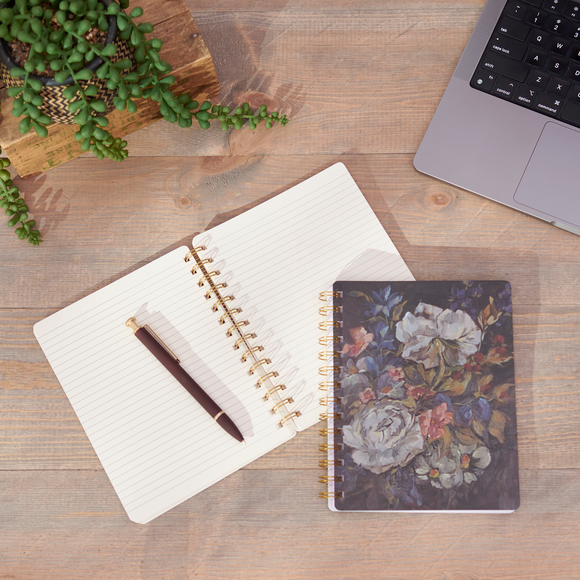 A double-sided spiral notebook from our Moody Collection displaying a calming hand painted design of florals in a deep color palette. Design is replicated from original artwork hand painted in a unique watercolor style. Our Moody Floral spiral notebook includes 120 lined pages. An inspirational everyday accessory that is also great for gifting.