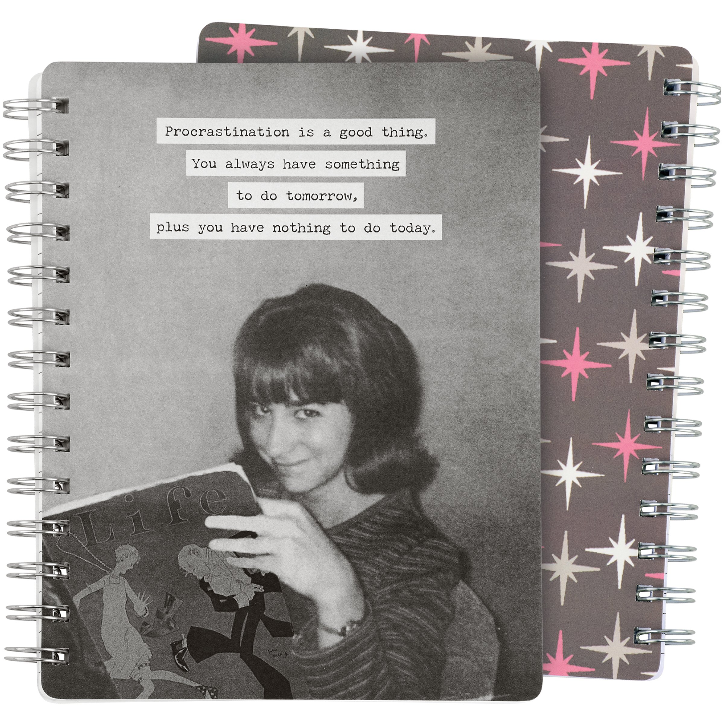 A double-sided spiral notebook from our Trash Talk By Annie Collection displaying a vintage black and white photo complemented by a sassy sentiment that reads "Procrastination Is A Good Thing. You Always Have Something To Do Tomorrow, Plus You Have Nothing To Do Today." The back cover of the notebook features a classy pink and gray retro pattern to complete the look. Our Nothing To Do Today spiral notebook includes 120 lined pages. A fun gift that calls back to a vintage style with modern sassy sentiments, perfect for making a statement while getting a giggle out of others.