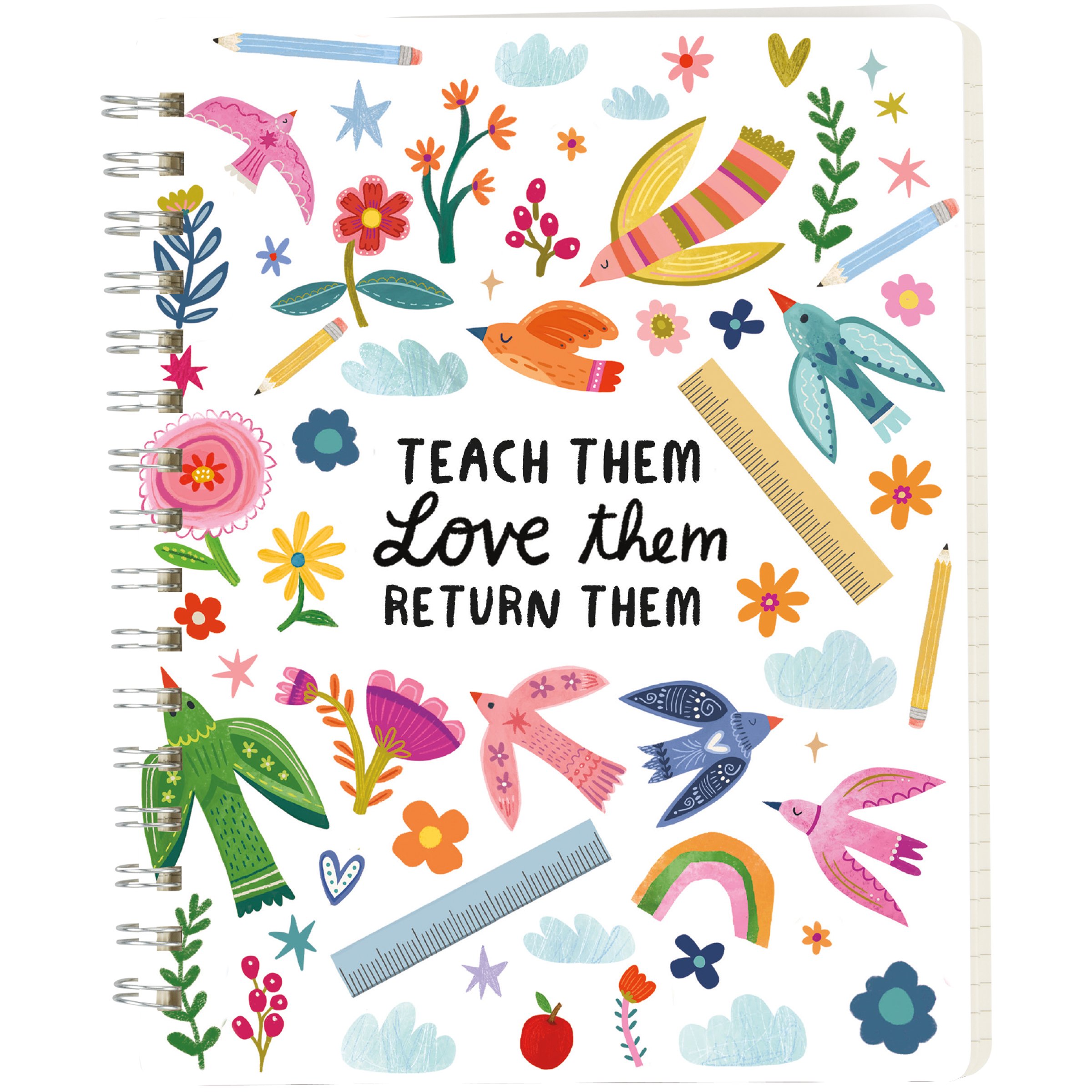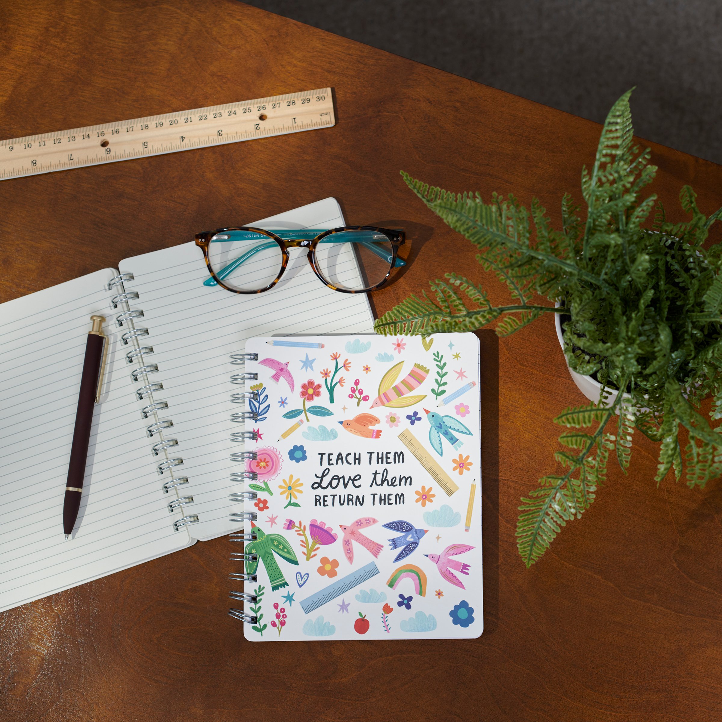 A double-sided spiral notebook from our Teacher Collection displaying a vibrant hand illustrated design of flowers and classroom items surrounding an inspirational teacher inspired sentiment that reads "Teach Them - Love Them - Return Them." Back cover features coordinating classroom item pattern. Our Return Them spiral notebook includes 120 lined pages. An inspirational teacher gift perfect for an everyday accessory.