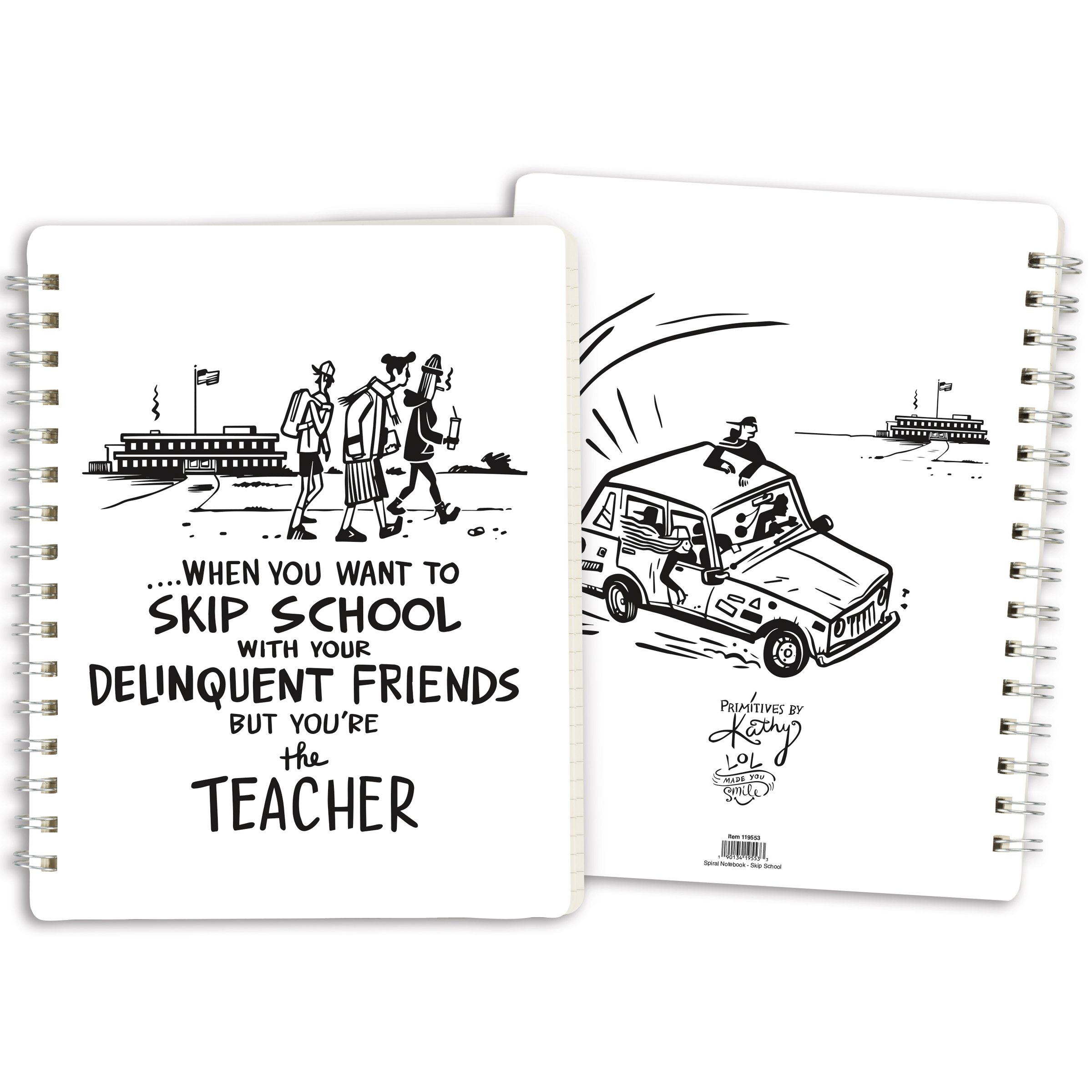 A double-sided spiral notebook from our Teacher Collection displaying a fun hand illustrated design of school kids walking away from school with a humorous teacher-themed sentiment that reads "...When You Want To Skip School With Your Delinquent Friends But You're The Teacher." Back cover features hand illustrated design of kids having fun in a car. Our Skip School spiral notebook includes 120 lined pages. A fun teacher gift perfect for an everyday accessory.