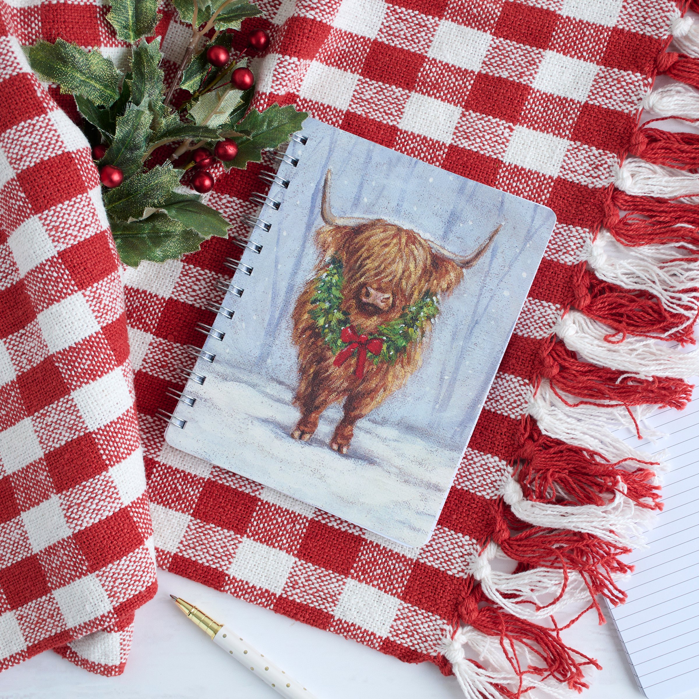 A double-sided spiral notebook from our Christmas Collection displaying a winter scene of a highland cow wearing a holiday wreath with front and back perspectives on each cover. Winter highland cow design is replicated from original artwork painted onto burlap canvas, giving the art a unique depth and texture. Our Snowy Highland spiral notebook includes 120 lined pages. A farm themed Christmas gift perfect for a seasonal accessory.