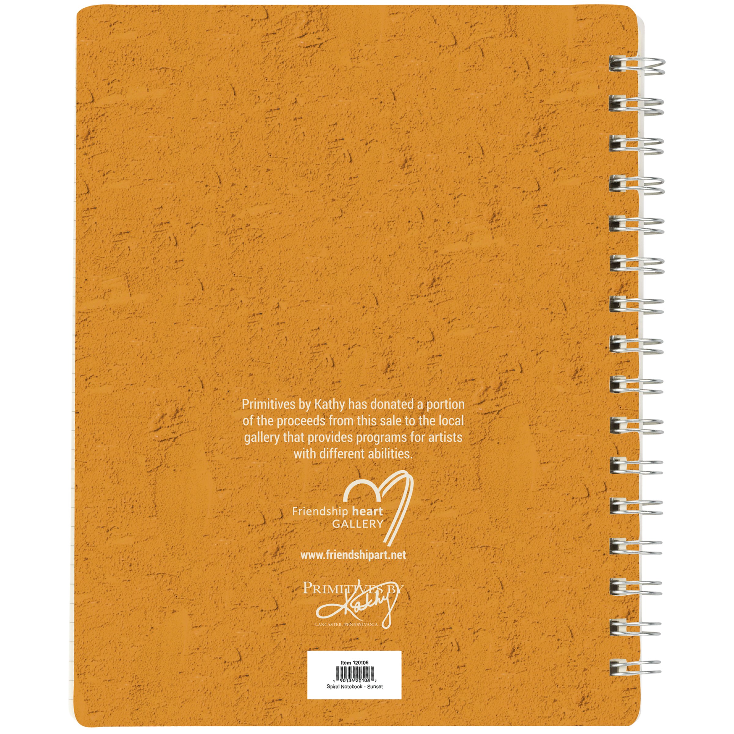 A double-sided spiral notebook from our Friendship Heart Gallery Collection displaying a uniquely hand painted scene of a sunset. Sunset design is replicated from original art created at the Friendship Heart Gallery in downtown Lancaster, PA that supports artists with intellectual disabilities and autism. Our spiral Sunset notebook includes 120 lined pages. An artful gift perfect for an everyday accessory.