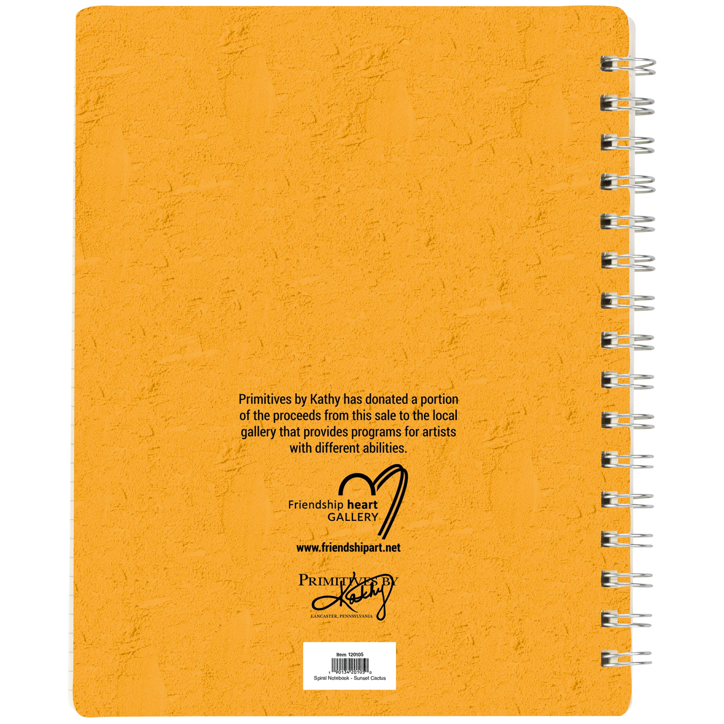 A double-sided spiral notebook from our Friendship Heart Gallery Collection displaying a uniquely hand painted scene of a cactus and a sunset. Cactus design is replicated from original art created at the Friendship Heart Gallery in downtown Lancaster, PA that supports artists with intellectual disabilities and autism. Our spiral Sunset Cactus notebook includes 120 lined pages. An artful gift perfect for an everyday accessory.