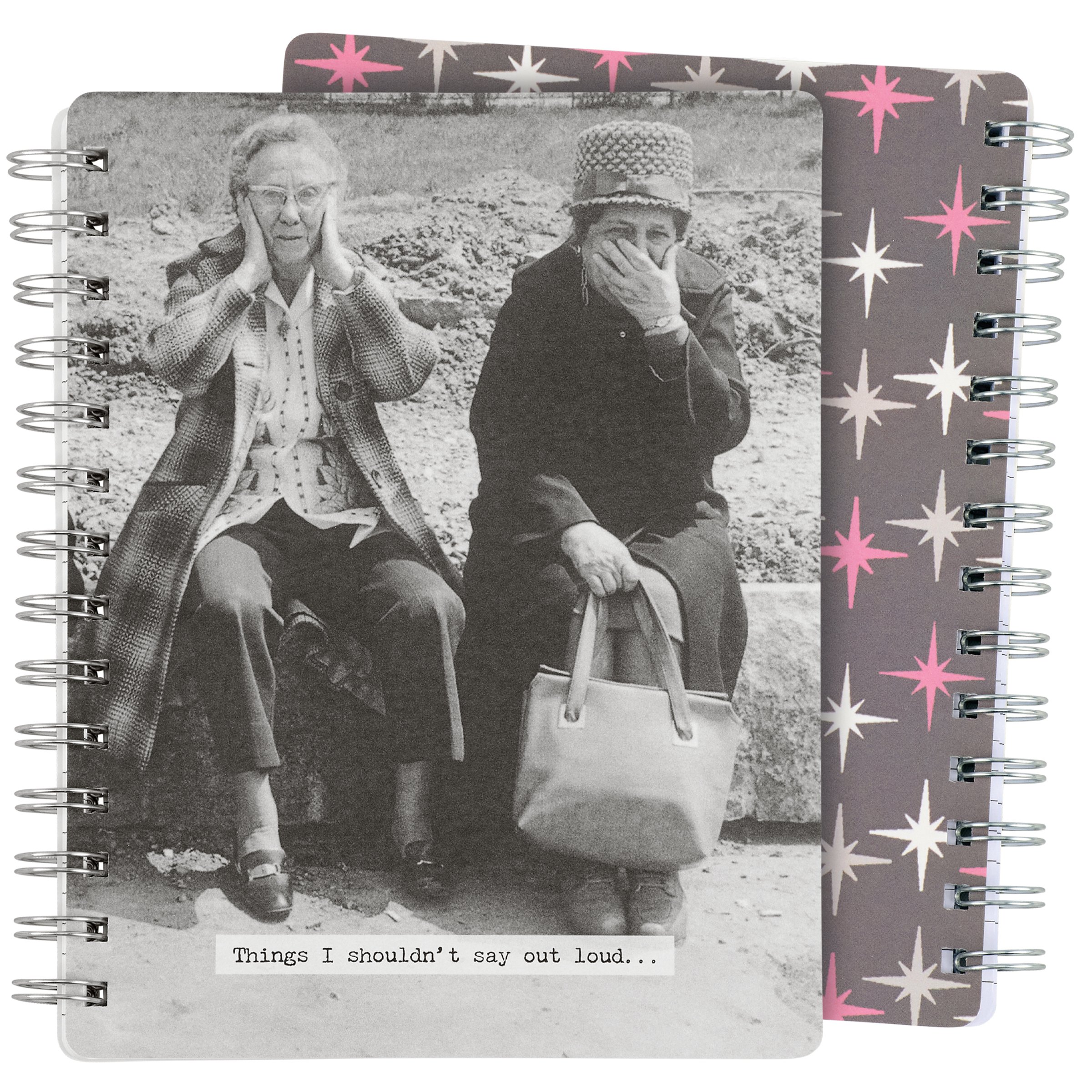 A double-sided spiral notebook from our Trash Talk By Annie Collection displaying a vintage black and white photo complemented by a sassy sentiment that reads "Things I Shouldn't Say Out Loud..." The back cover of the notebook features a classy pink and gray retro pattern to complete the look. Our Things I Shouldn't Say Out Loud spiral notebook includes 120 lined pages. A fun gift that calls back to a vintage style with modern sassy sentiments, perfect for making a statement while getting a giggle out of others.