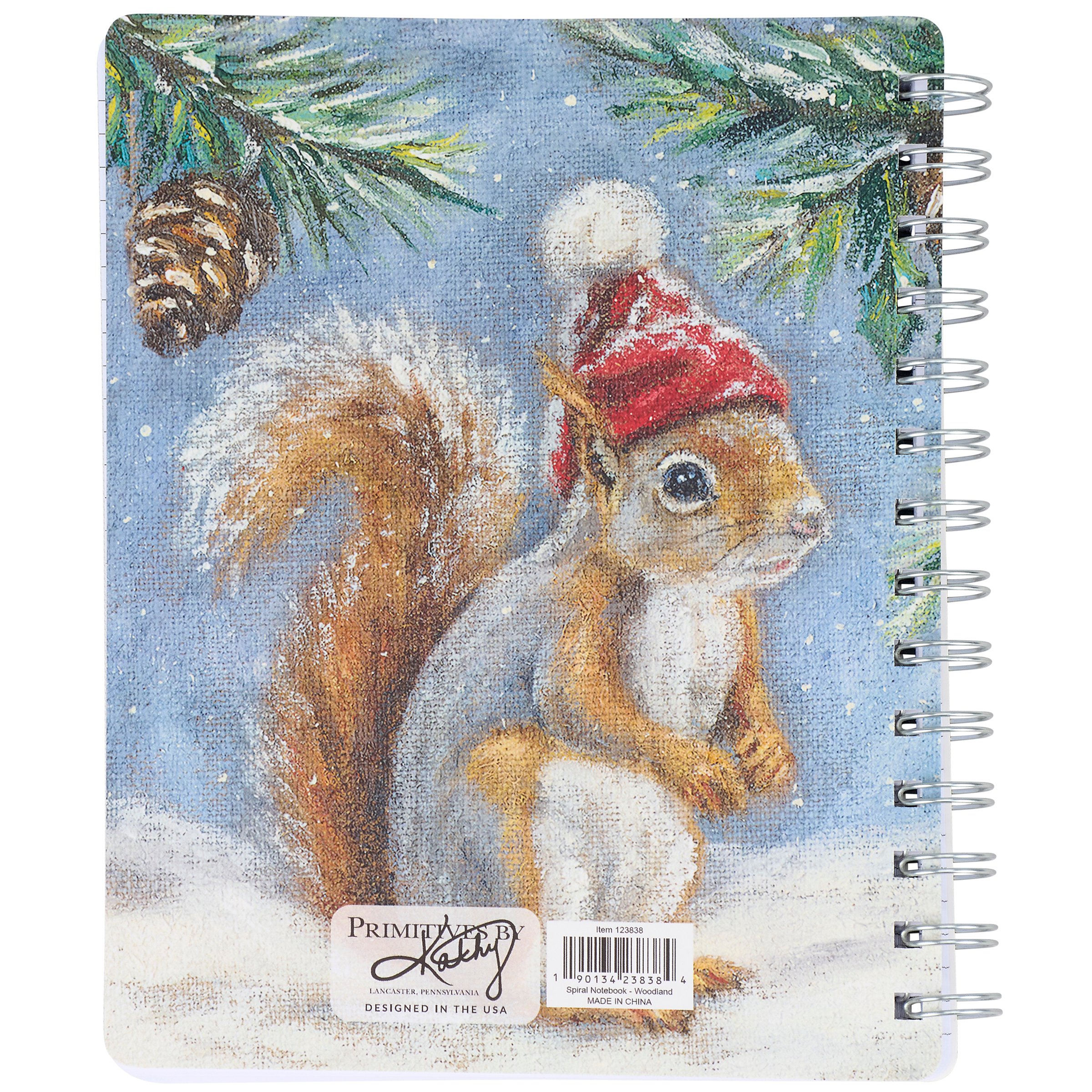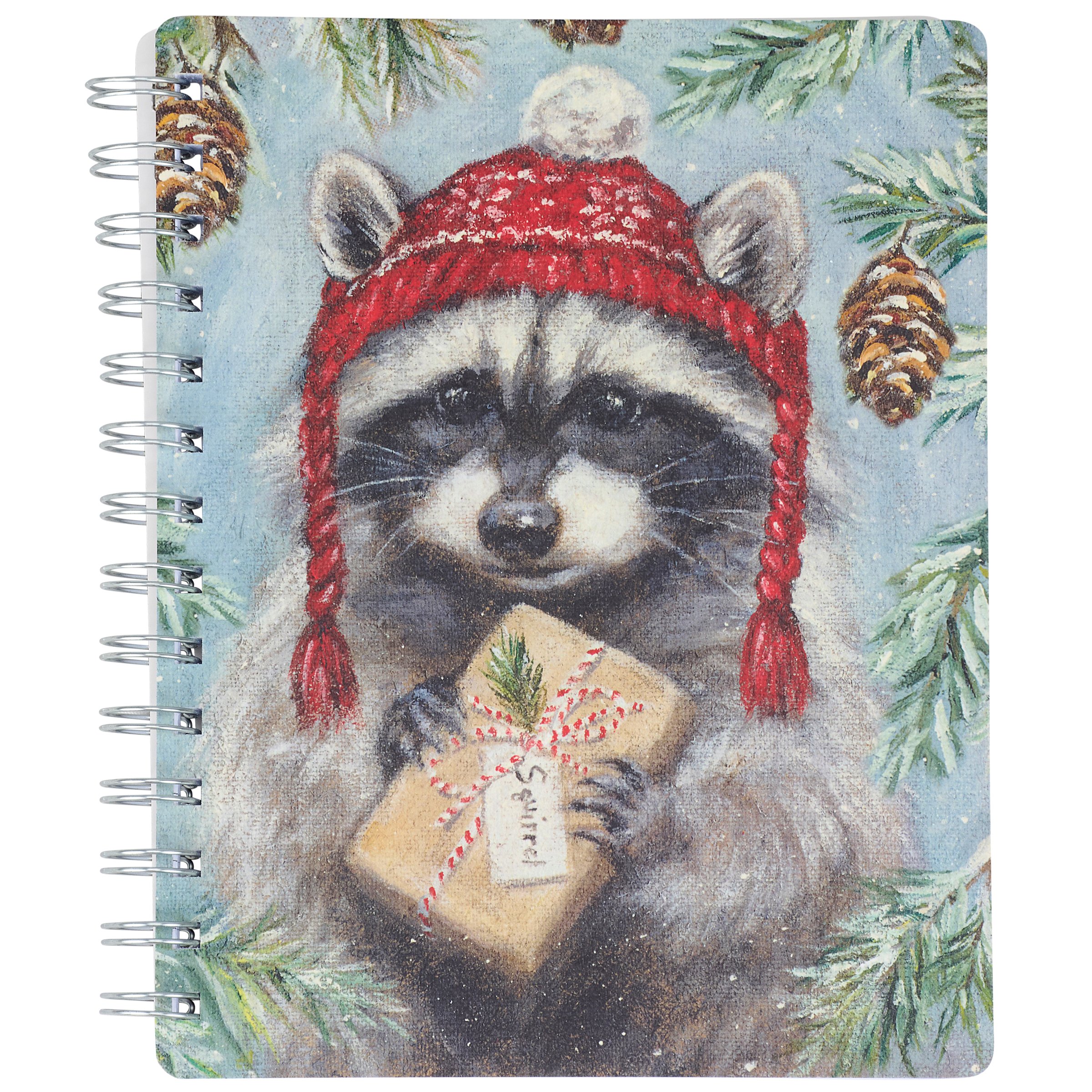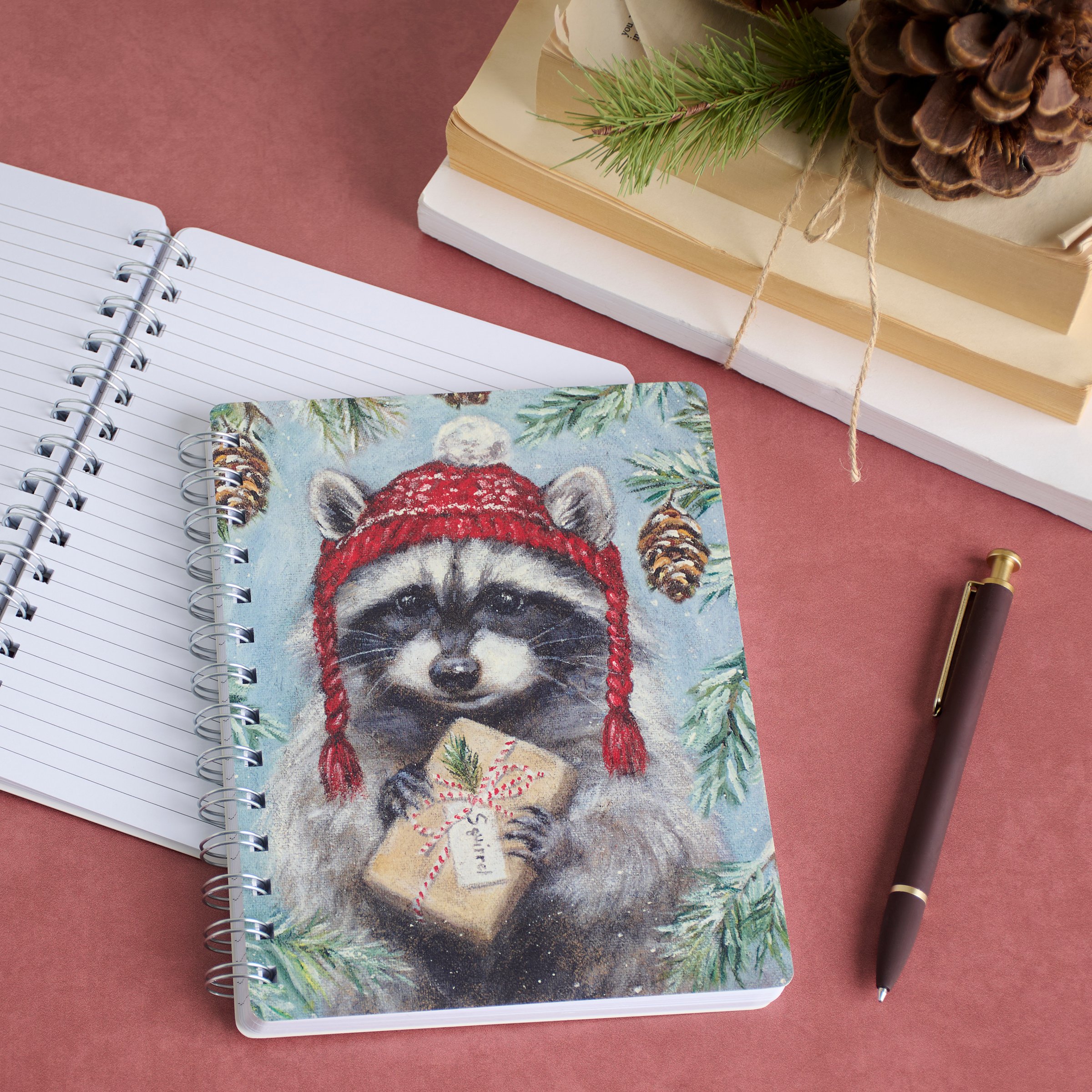 A double-sided spiral notebook from our Christmas Collection displaying winter scenes of a raccoon holding a gift on the front cover and a squirrel wearing a winter hat on the back cover. Winter woodland animal designs are replicated from original artwork painted onto burlap canvas, giving the art a unique depth and texture. Our Woodland Friends spiral notebook includes 120 lined pages. A nature themed Christmas gift perfect for a seasonal accessory.