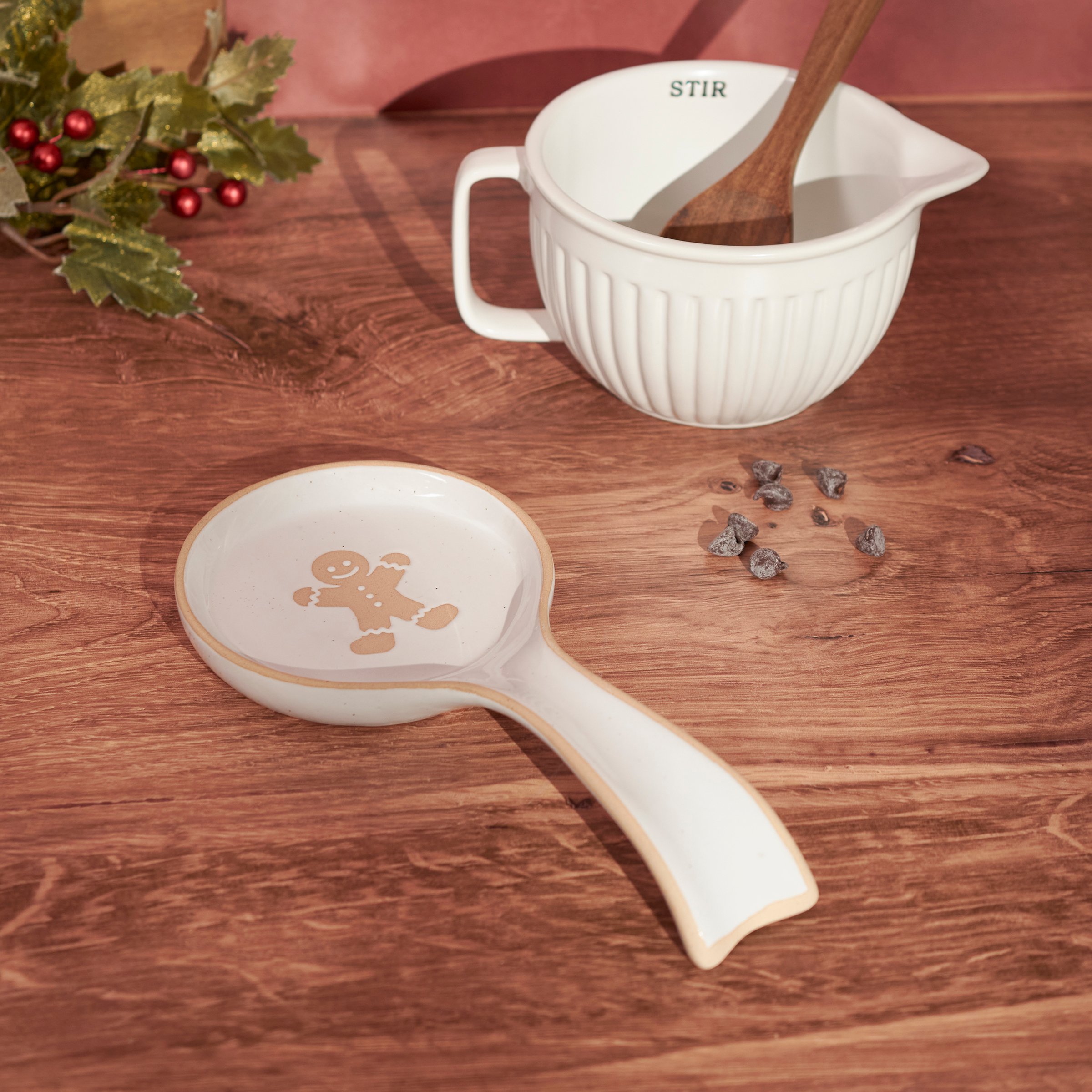 A durable stoneware spoon rest from our Christmas Collection displaying a snowy cream color with a debossed happy gingerbread man in brown and a bare ceramic accent along the rim. Our Gingerbread Man spoon rest is conveniently microwave, dishwasher, and food safe for easy use. A fun gingerbread-themed kitchen accessory perfect for seasonal display.