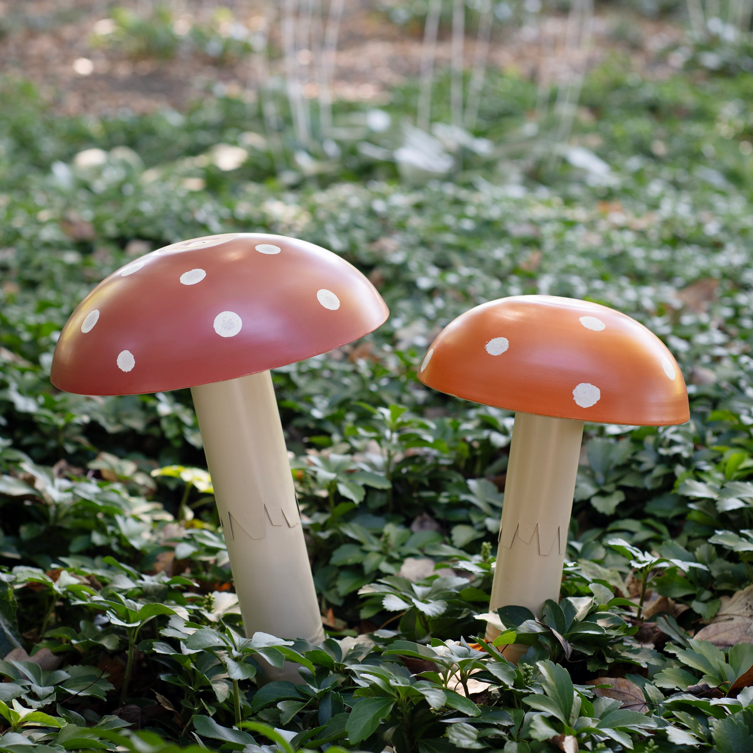 A set of 2 decorative stakes from our Garden Collection displaying rustic mushroom designs made with sculpted metal pieces attached to a metal stakes. Our Mushrooms stake set includes 5 inch stakes to easily stand out in a garden or yard. A set of mushroom-themed outdoor accents perfect for everyday display.