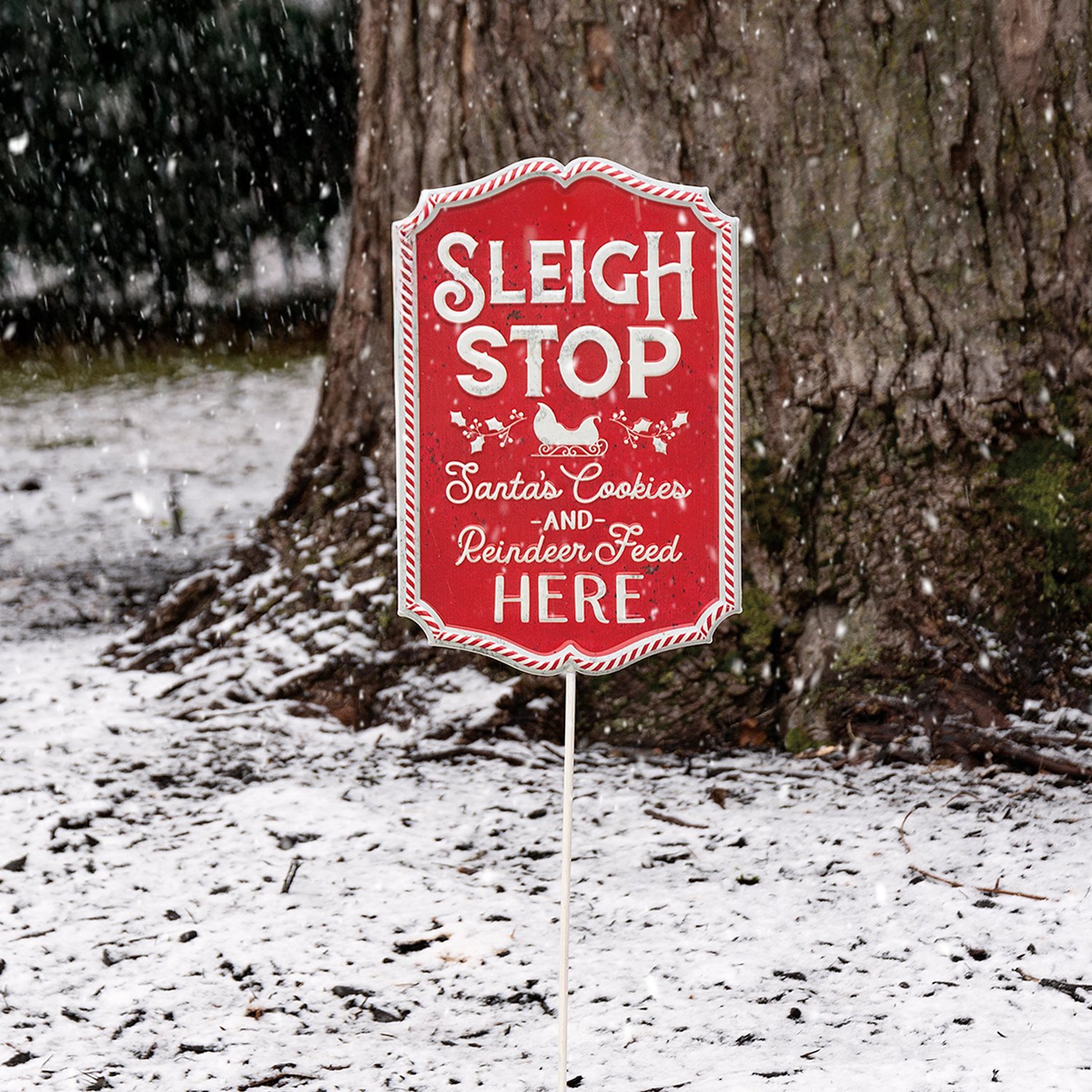 A metal stake featuring a red sign with embossed "Sleigh Stop Santa's Cookies And Reindeer Feed Here" sentiment with Santa's sleigh design. Our Sleigh Stop stake is a perfect holiday addition to any garden.