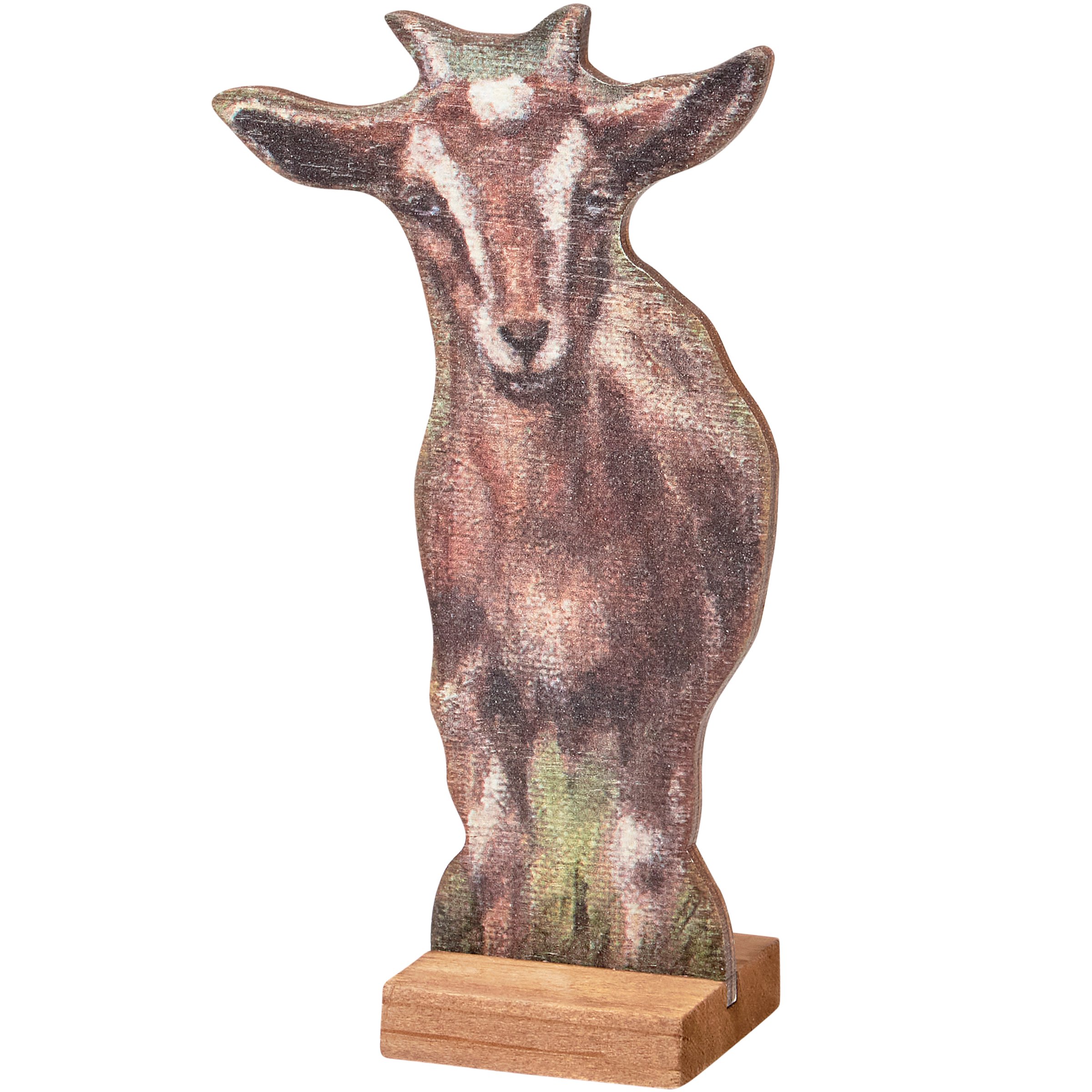 A wooden stand up décor piece from our Farmhouse Collection displaying a cutout design of a farm goat replicated from original artwork painted onto burlap canvas, giving the art a unique depth and texture. Design is double-sided to easily view art on either side and is attached to a natural wood base. Our Goat stand up can free-stand on any flat surface. A rustic everyday home accent that can be easily displayed in any home or work space.