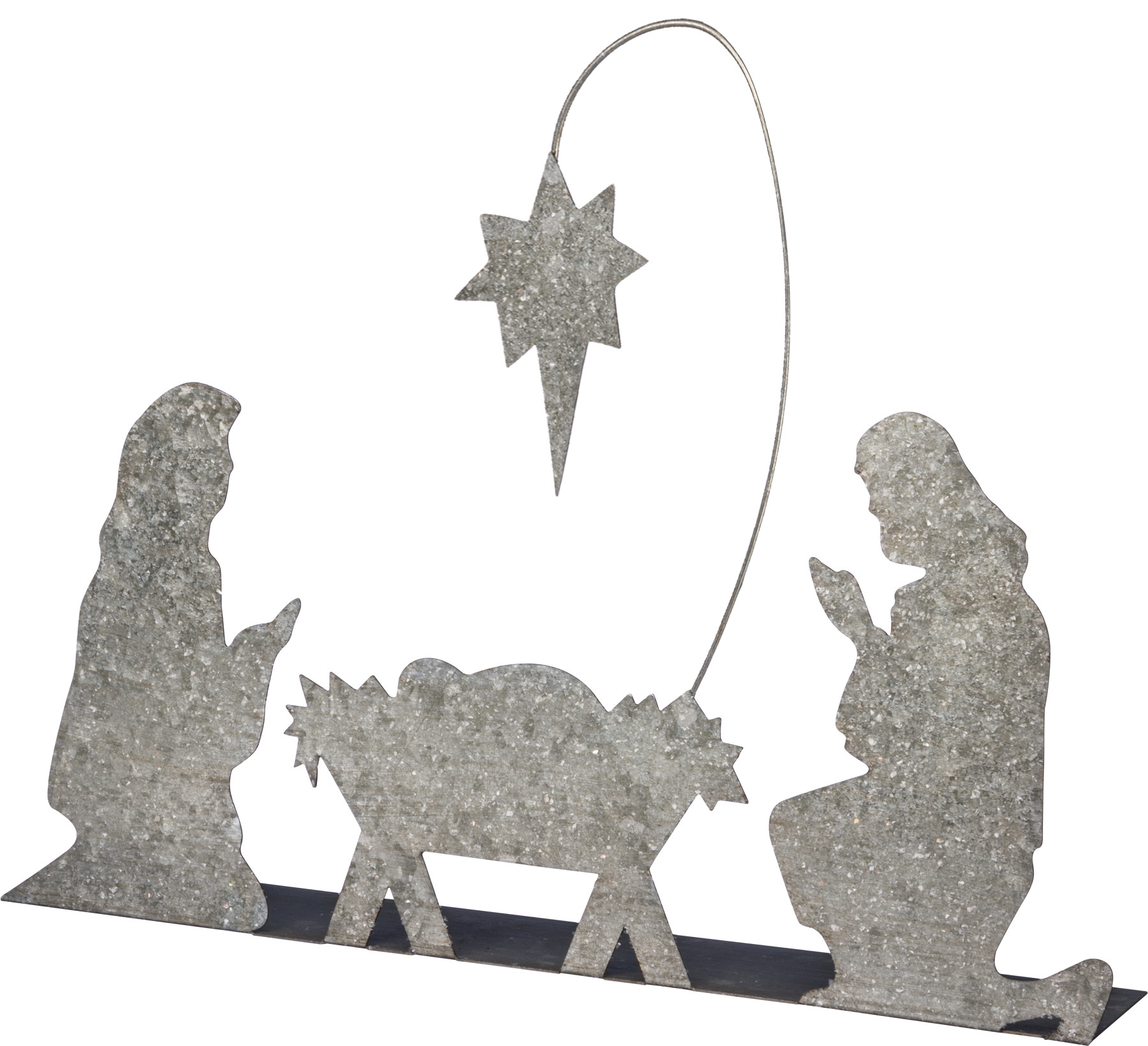 A Christmas staple, a galvanized metal nativity scene with hanging star accent and sturdy base.