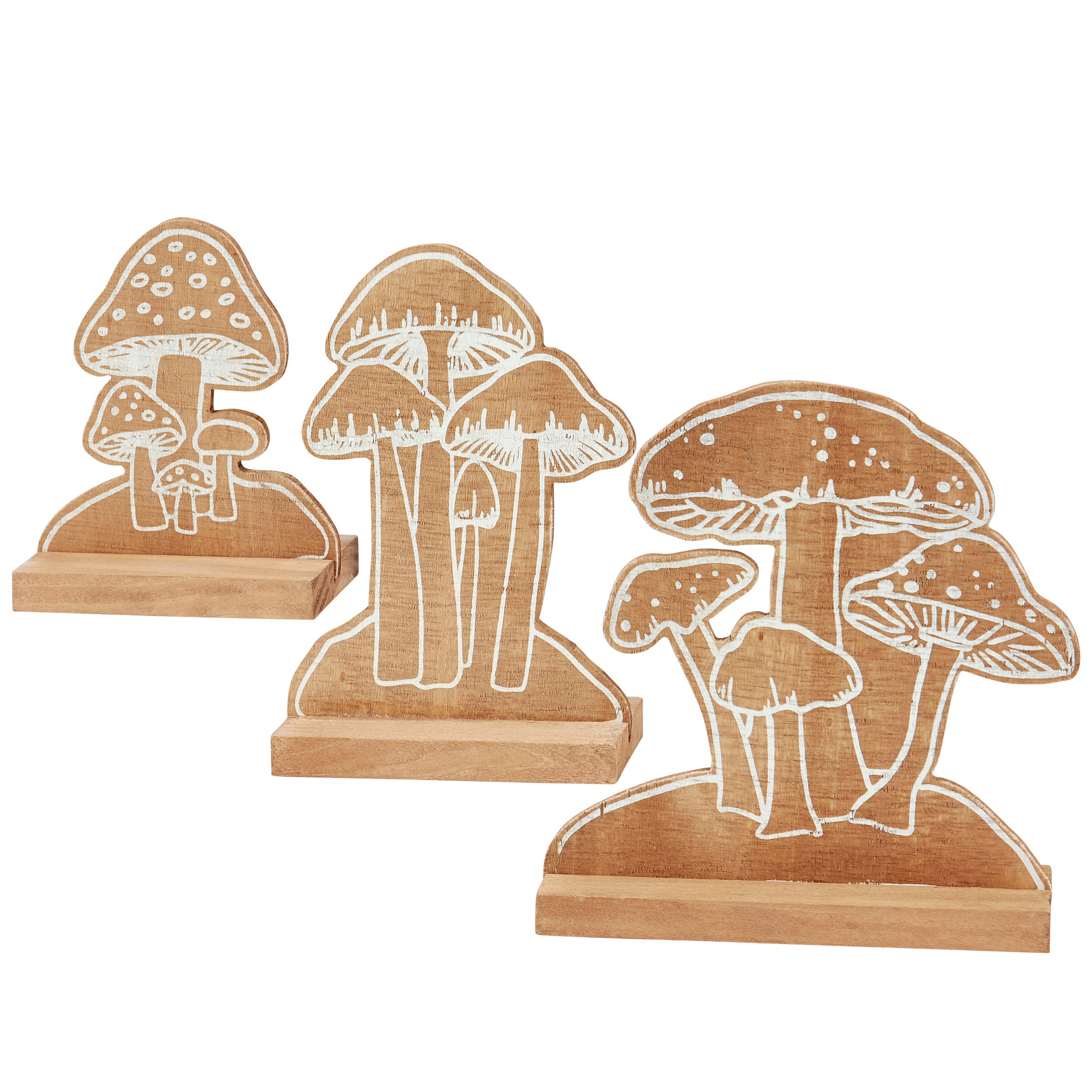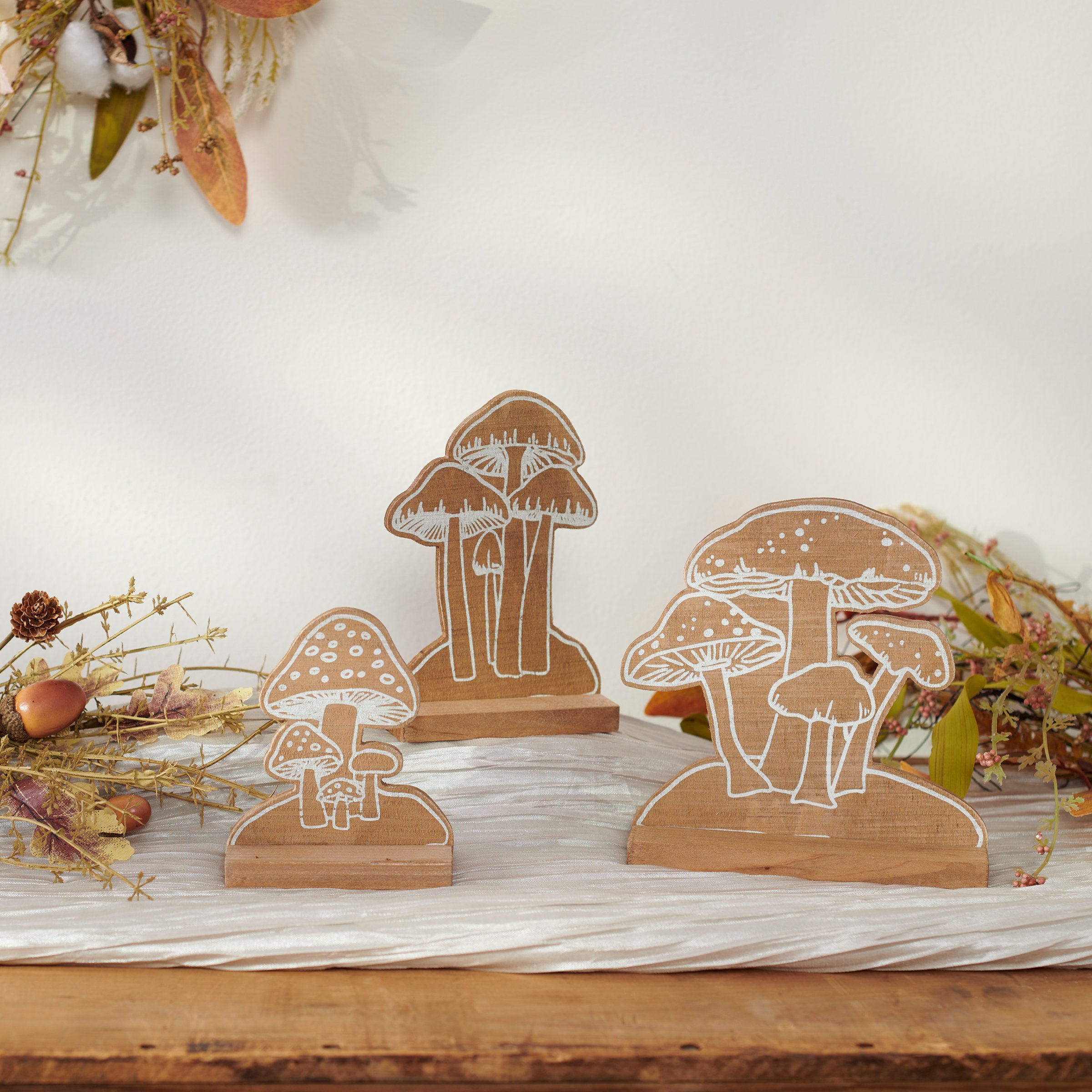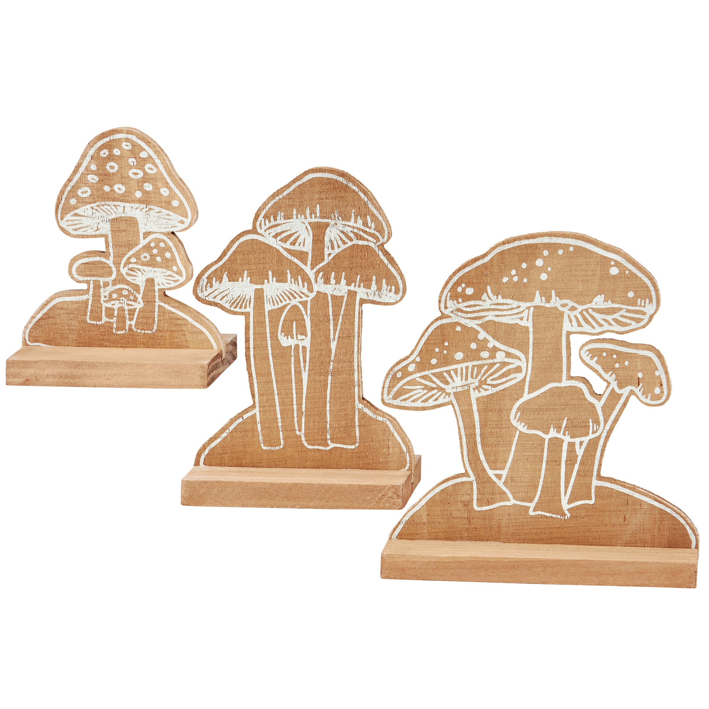A set of three wooden stand ups from our Cottagecore Collection displaying individual cutout designs of mushrooms in natural wood with painted details. Seasonal stand ups are double-sided to easily view art on either side and attached to natural wood bases. Our Mushroom stand up set is designed to free stand on a flat surface for easy display. A rustic set of fall home accents with a variety of seasonal display options.