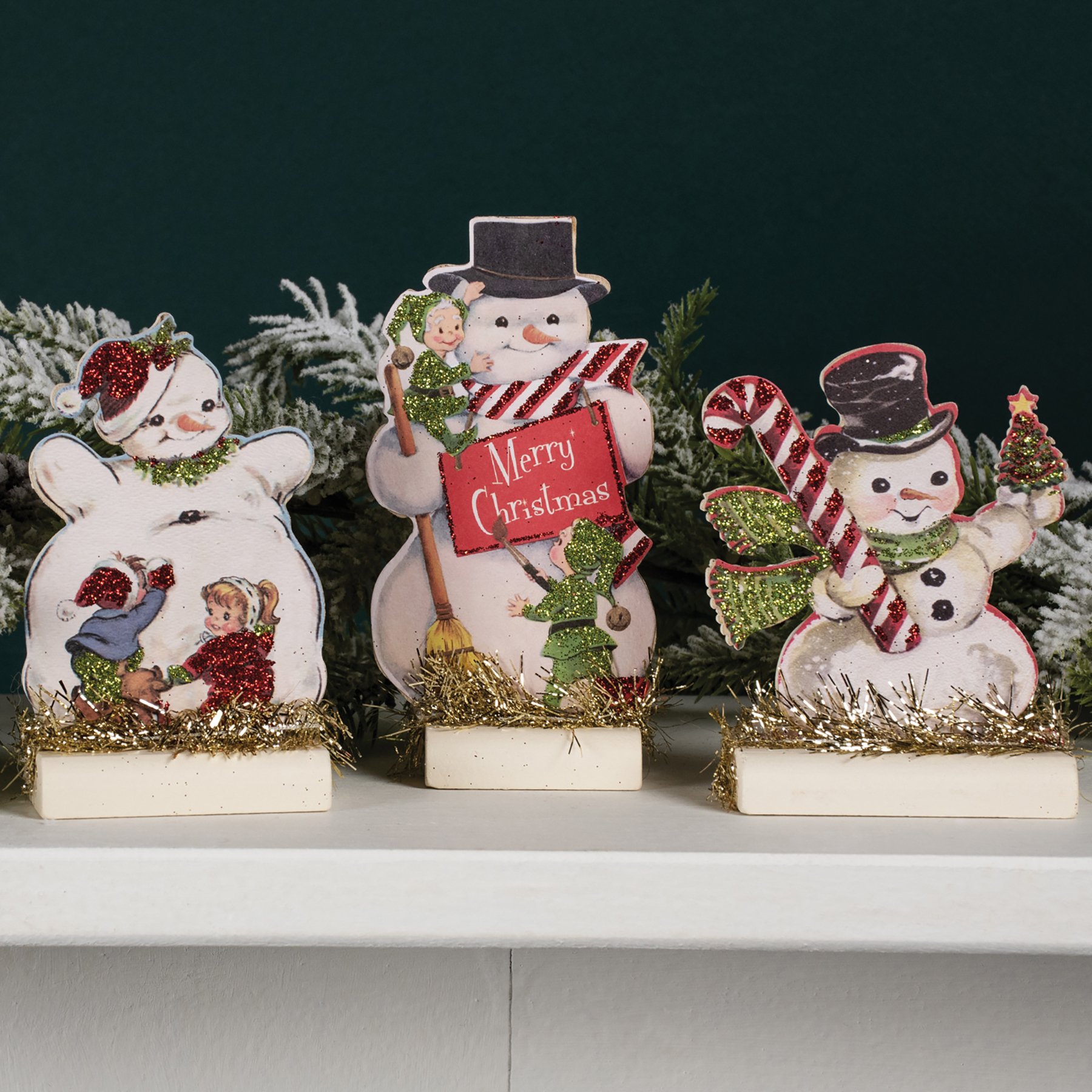 A set of three vintage-inspired stand-up snowmen in varying designs and sizes with glitter and tinsel details.