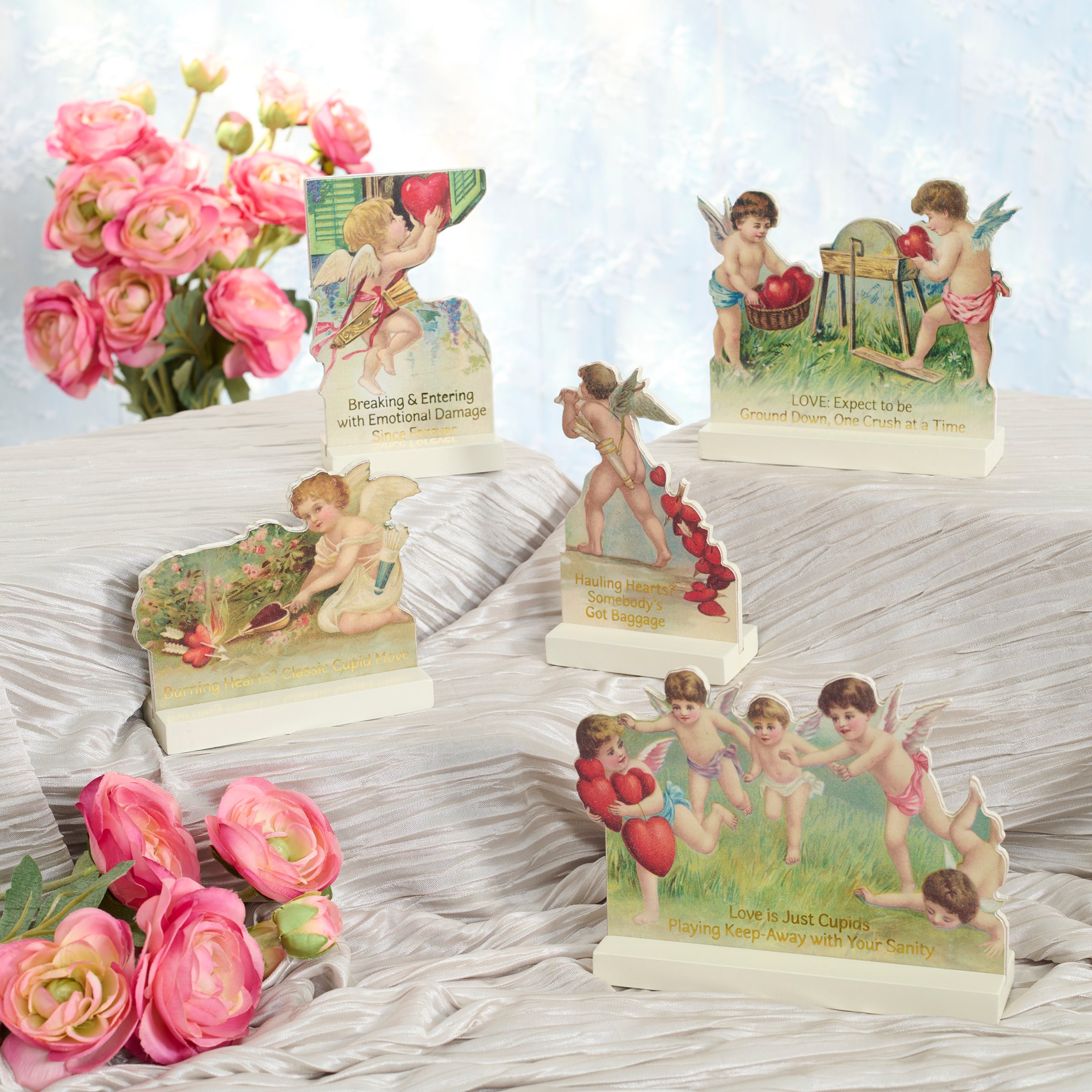 A set of 5 wooden stand ups from our Anti Valentine Collection displaying individual cutout designs of cupid inspired vintage art with sassy love-themed sentiments that offer a fun alternative to Valentine's Day decorating. Each anti-valentine sentiment features gold foil lettering to complete the vintage style. Seasonal stand up set is double-sided to easily view art on either side and attached to cream color wood bases that make it easy to free stand to display in any home or work space. Our Vintage Anti Valentine stand up set is packaged together in a poly bag, separated by paper wrappers, and tied with red ribbon. A vintage set of anti-valentine home accents that coordinates well with Valentine's Day decor.