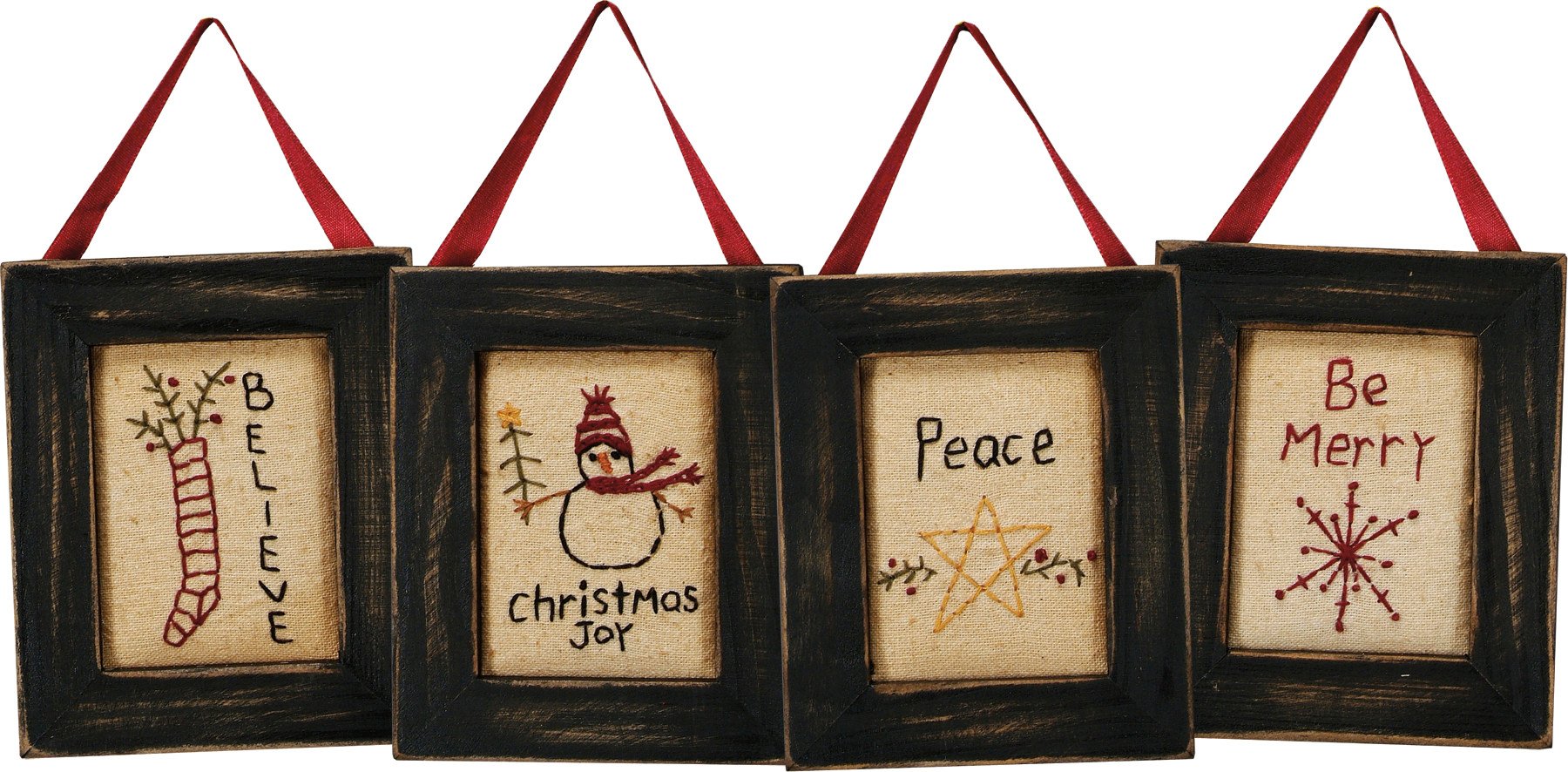 A set of four framed pulled canvases for Christmas featuring "Believe," "Christmas Joy," "Peace," and "Be Merry" sentiments, various designs, and top ribbon loops for easy hanging.