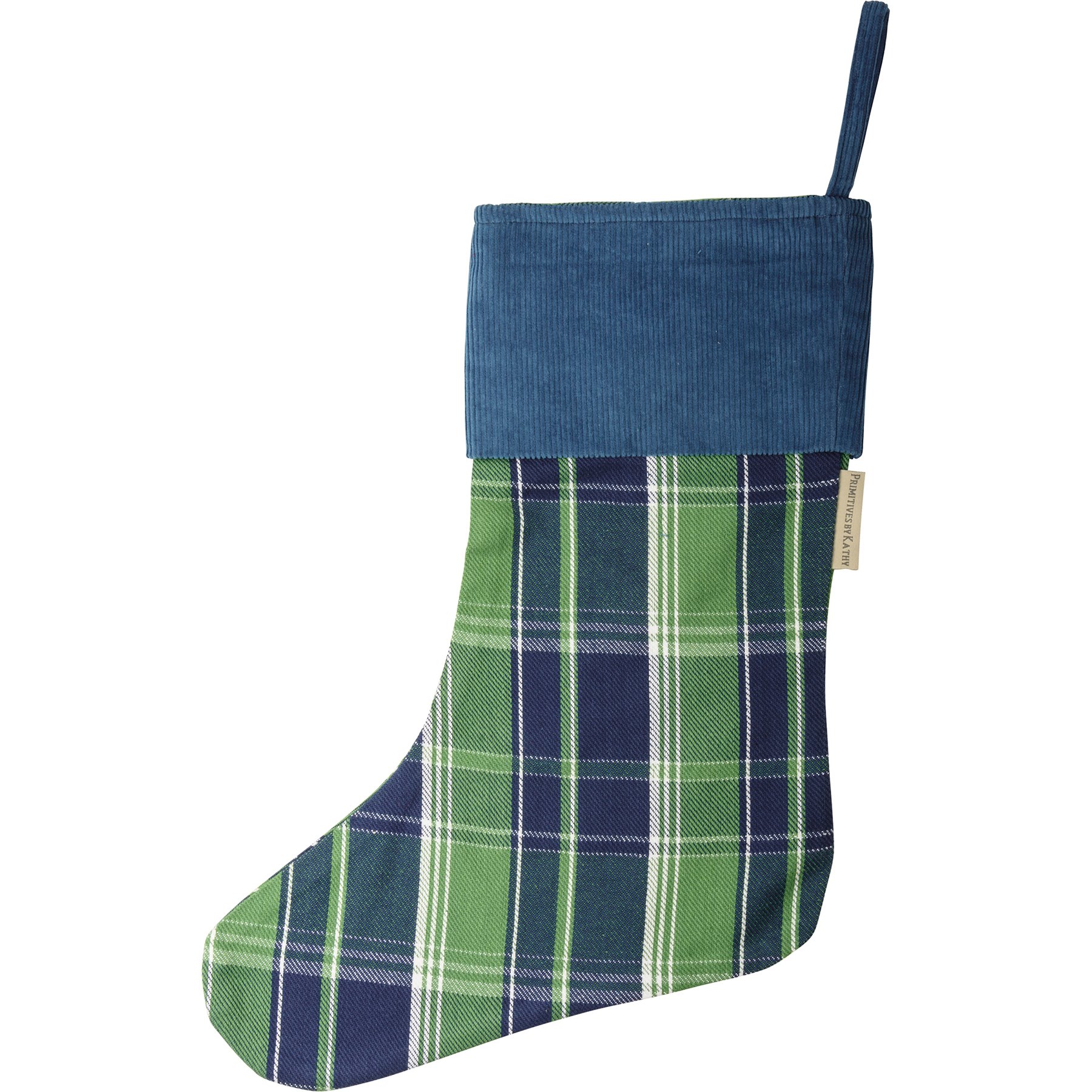 A cotton Christmas stocking featuring a blue holiday plaid pattern with a coordinating corduroy cuff. Includes a loop for easy hanging.