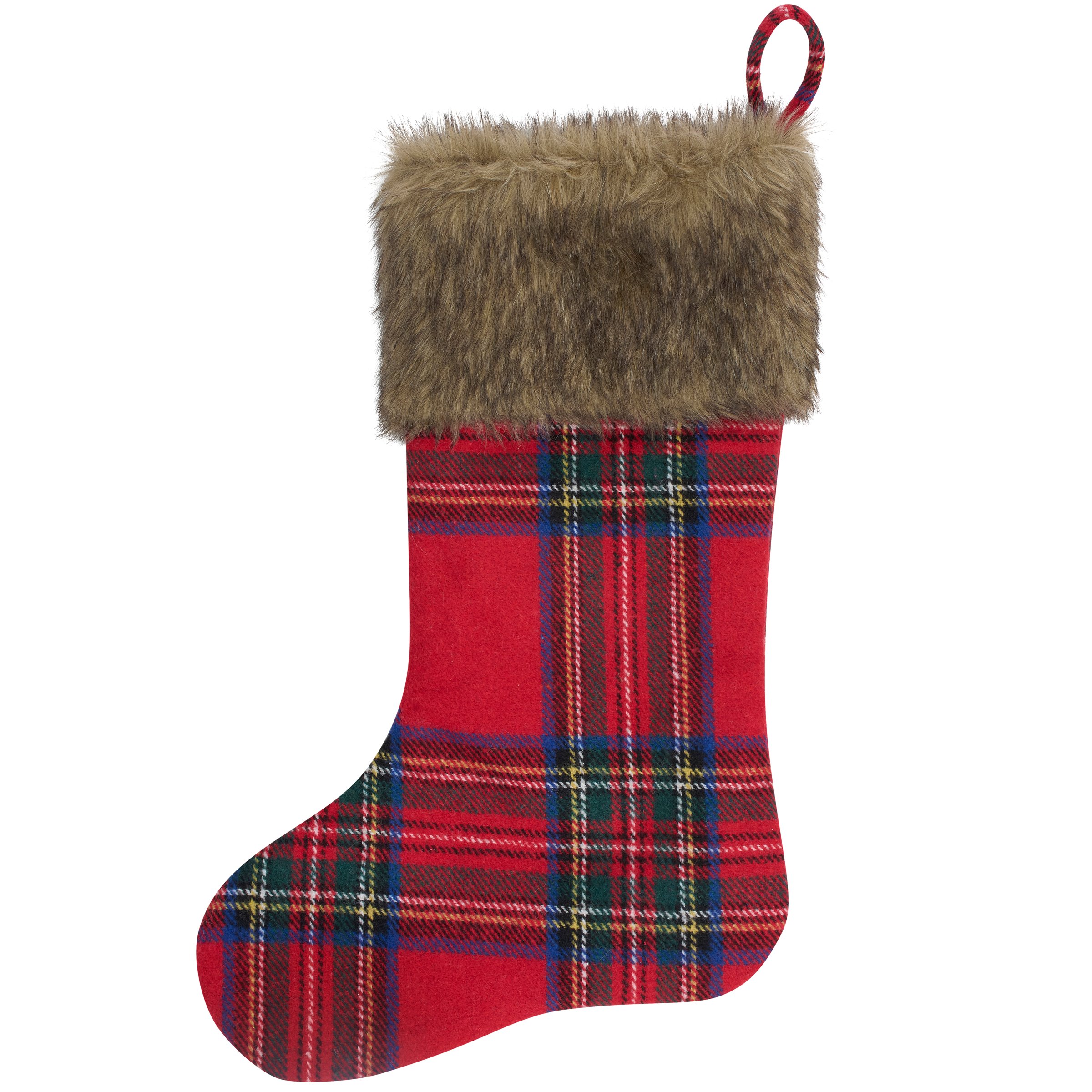 A double-sided stocking from our Christmas Collection displaying a Christmas red plaid design with a faux fur cuff that coordinates well with cabin decor. Our Cabin Christmas Red Plaid stocking is ready to hang via the loop attached to the top. A rustic Christmas home accent perfect for seasonal decorating and holiday gifting.