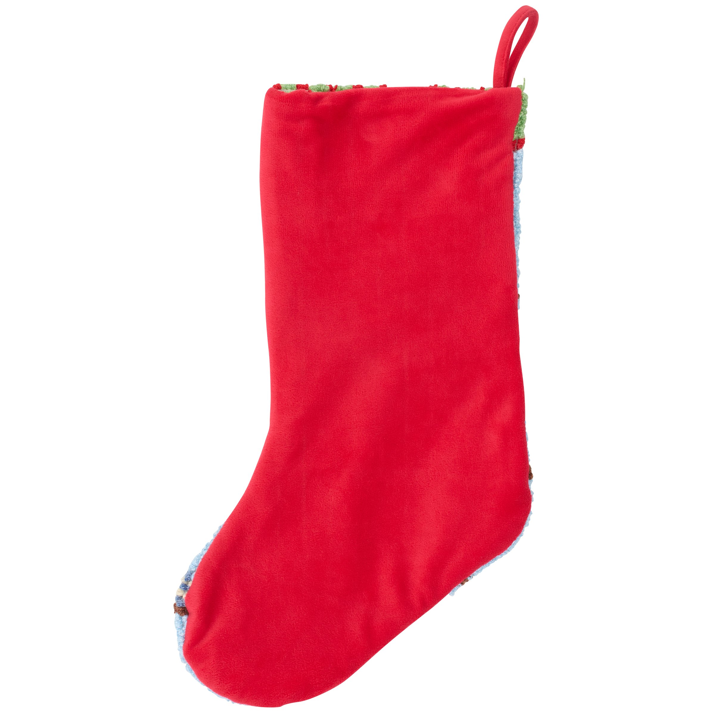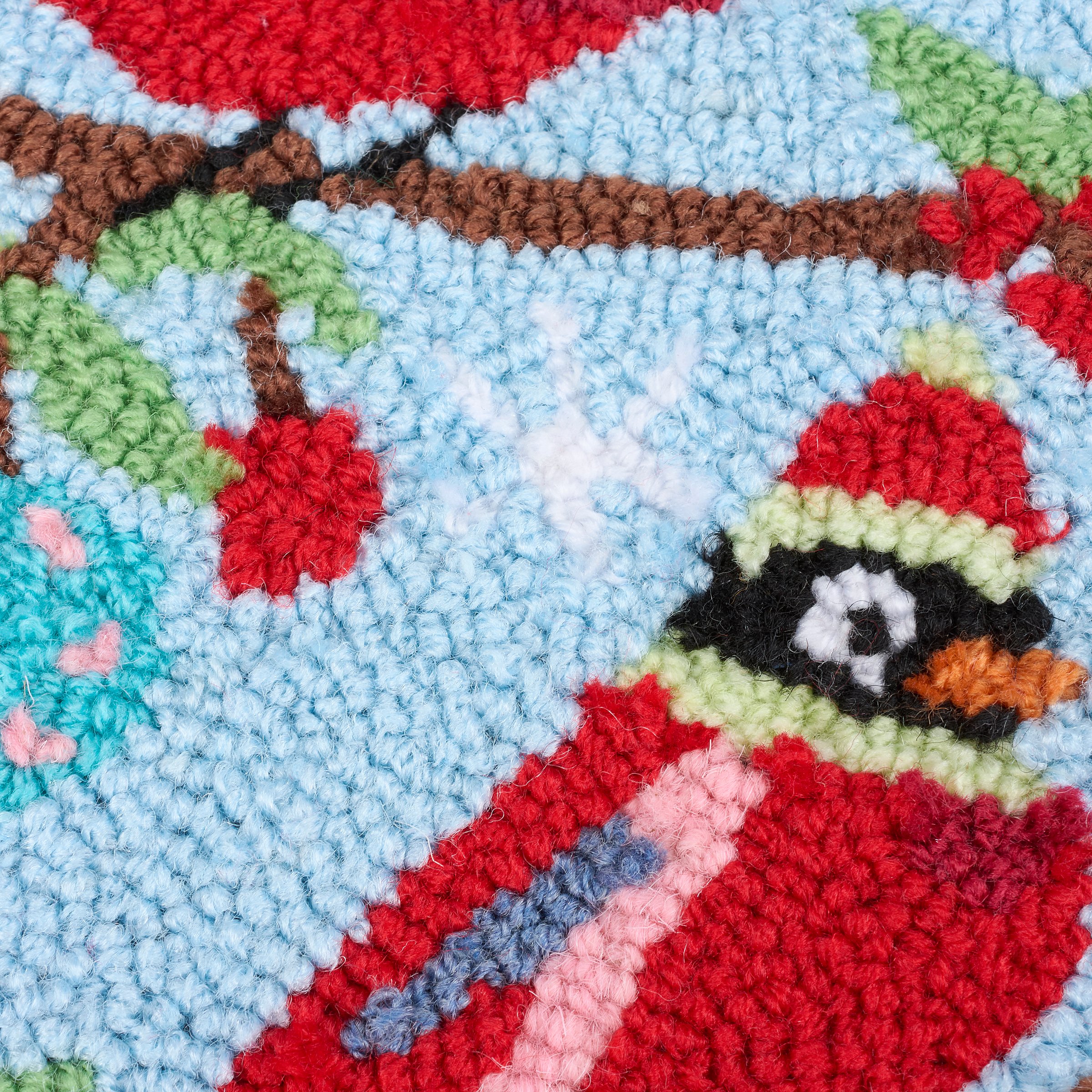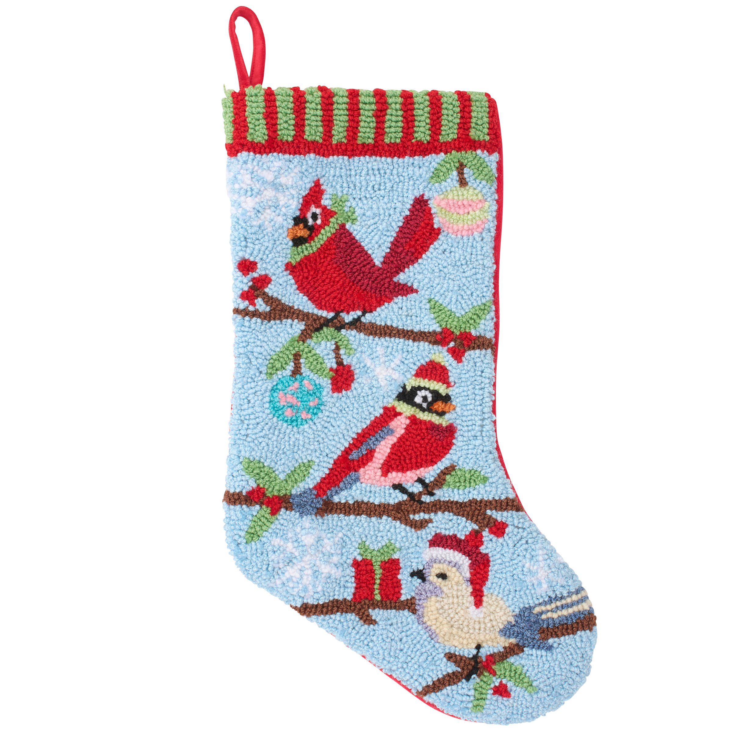A stocking from our Christmas Collection displaying a colorful scene of a cardinal family wearing winter outfits made in a hand-hooked style for added texture. Our Cardinal Family stocking is ready to hang via the loop attached to the top. A cardinal themed Christmas home accent perfect for seasonal decorating and holiday gifting.