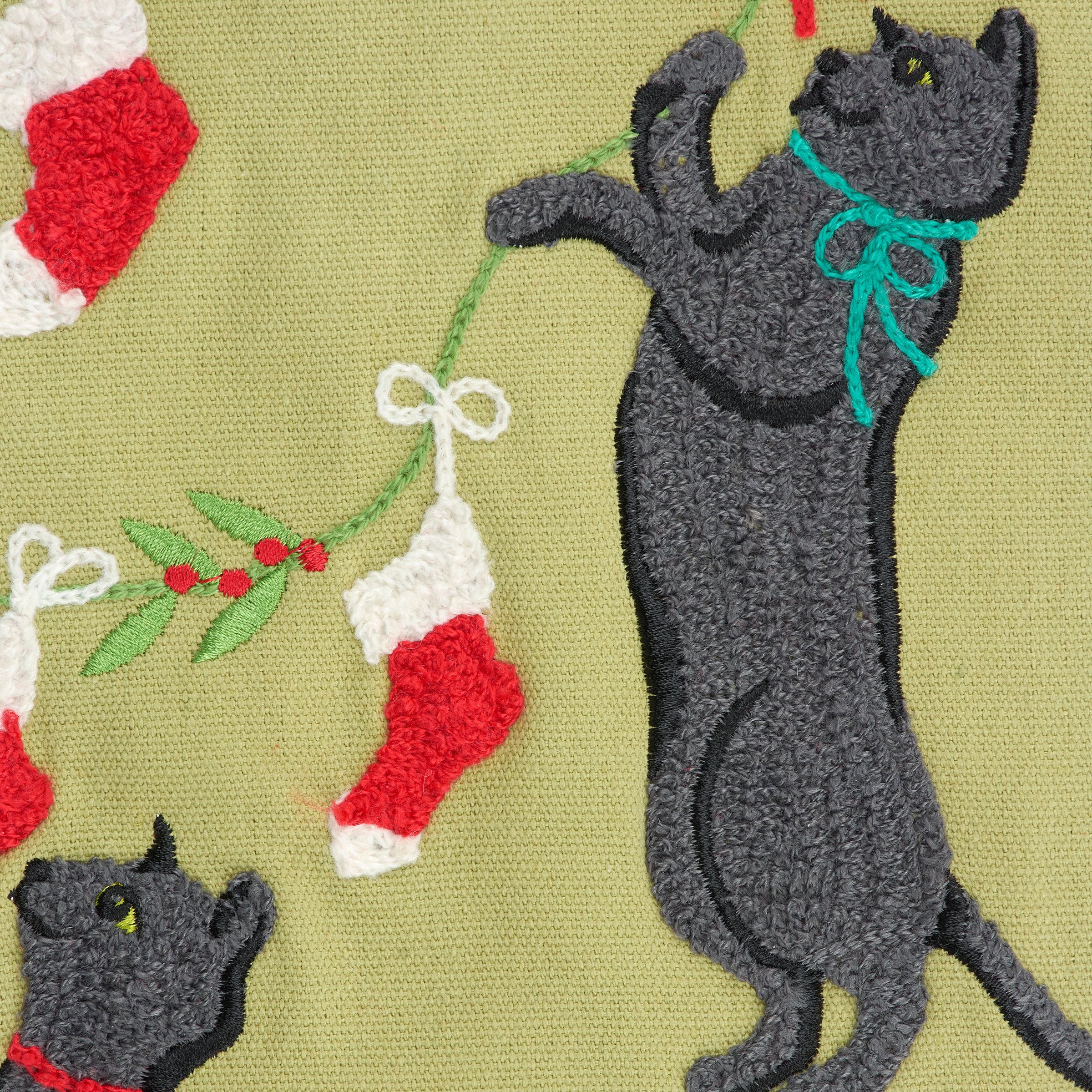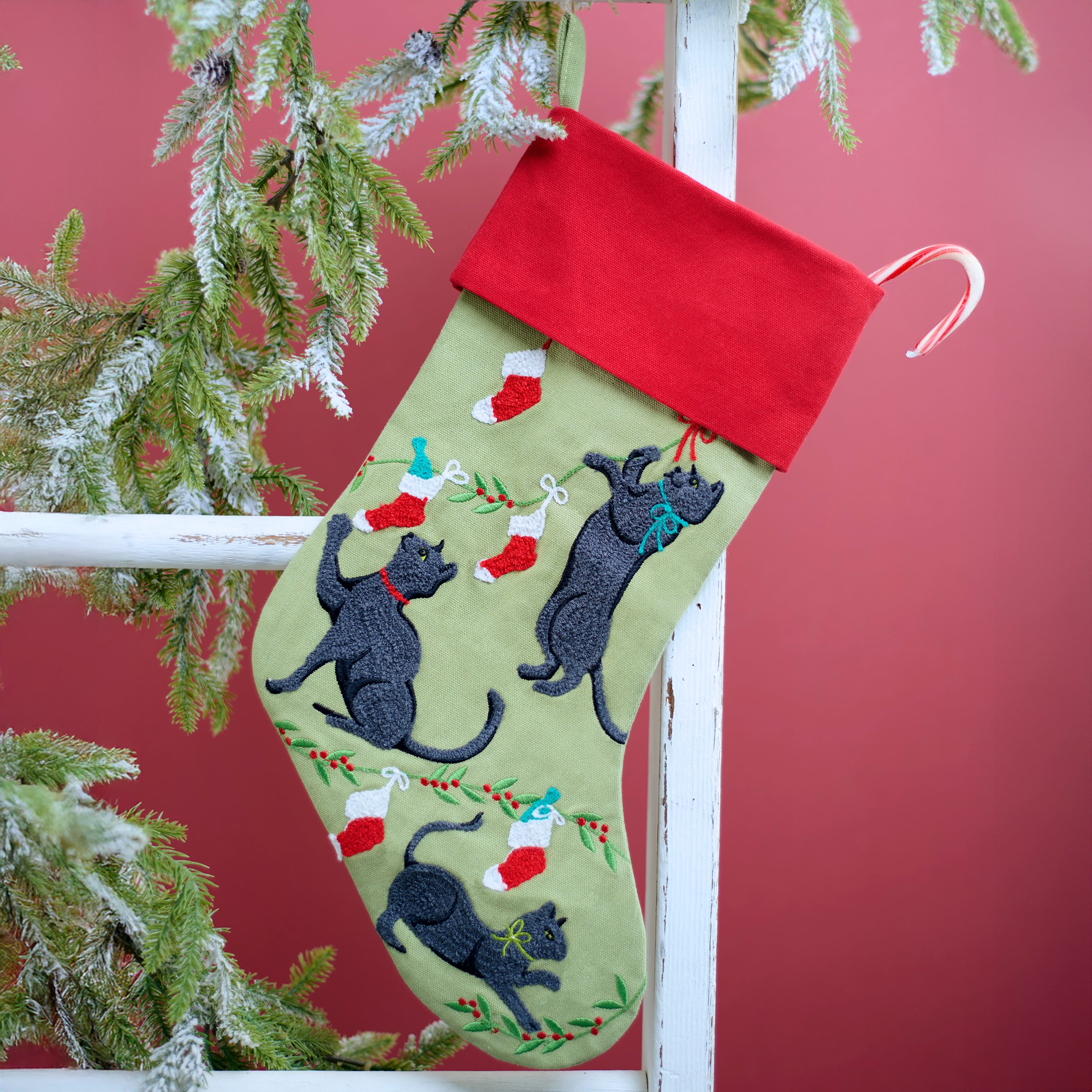 A stocking from our Holiday Pet Collection/ displaying embroidered designs of cats playing with stockings hanging from holly with a red color cuff ideal for showing off a love for cats or for gifting to a family pet. Treats pictured not included. Our Cats stocking is ready to hang via the attached loop at the top. A fun pet themed home accent perfect for seasonal decorating and holiday gifting.